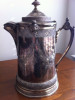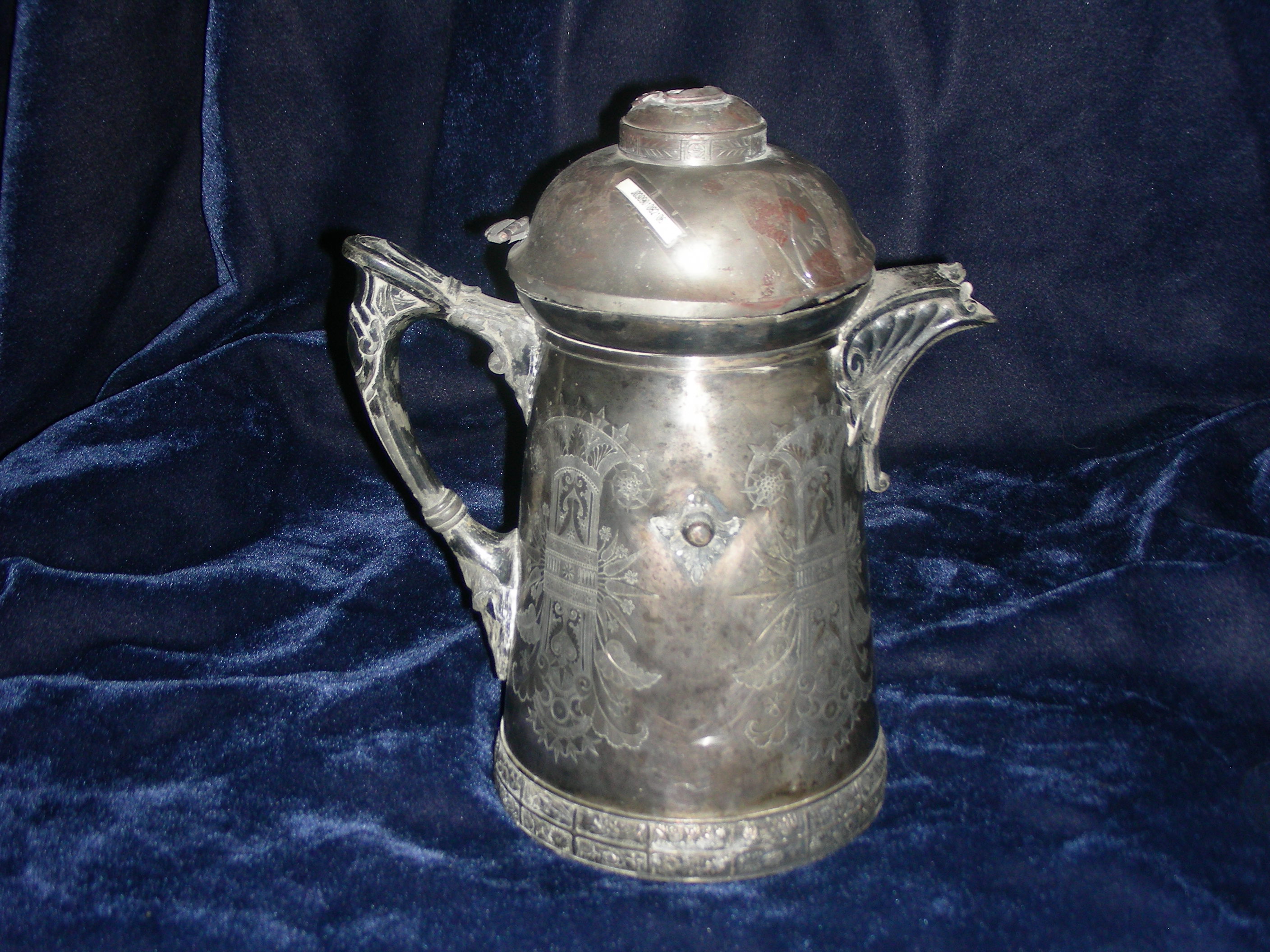 Man in canoe w/rifle on handle, otherside otter or beaver. Crest unknown. Interested in finding out what the number typed n taped to lid!!! Are antiques listed by number somewhere? Appears pot was made June 13th, 1868 and handles and spout put on Nov.30th, 1868. That's 'bout it!!!!!!!!!