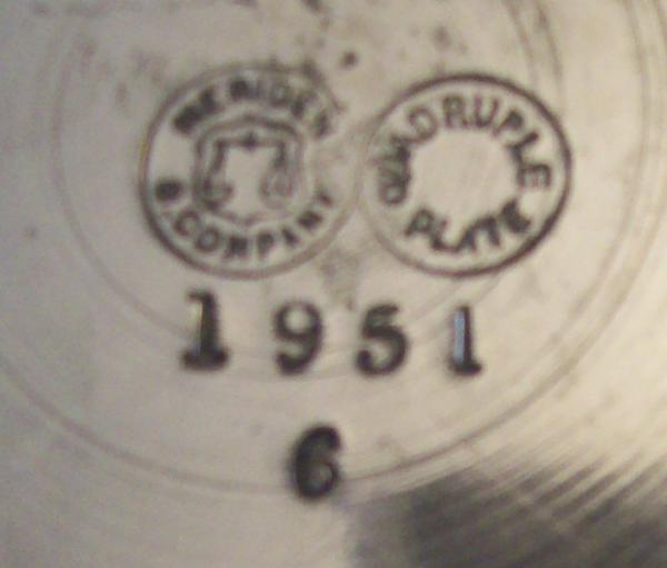 This is a tea set given to a W. E. A. Dundas and his wife as a wedding gift on June 23rd, 1887 in San Francisco, CA. 5 out of the 6 markings are from Meriden Britannia, one is from Rogers Bros. The Rogers Bros. piece is the round piece with the top and it has the same pattern as the others along with the same pattern code of 1951. The tray has a pattern code of 109. The 5 containers all have the letter "D" inscribed on each piece.