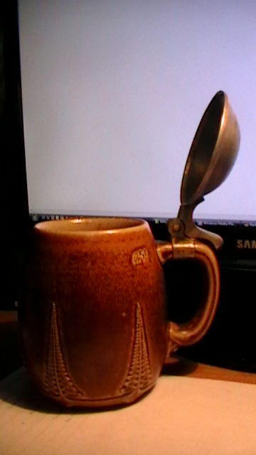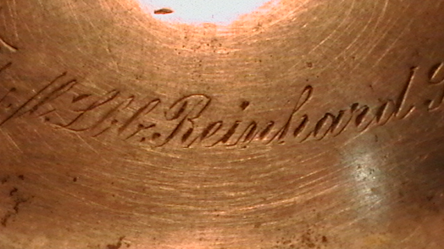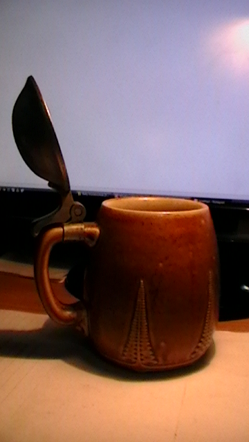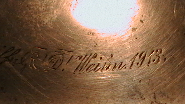 As you will see in the photos and what interests me more are the 2 names on top of the metal cover. Willy Wegner and Reinhard Schleiff (or Schleiffer). Reinhards name is followed by 2 symbols (for a lack of a better word) but the large symbol that is on top of the metal cover is after both names. After names it says Weihn (Vienna), 1913. On the bottom is the name of the manufacturor Merkelbach and the designer Wynand, numbers 2122 and the name of the city Grenzhausen. Since 1945 this stein has not left my family. So as it would seem that we are the only owner since the person/people that it was given to as a present in 1913.