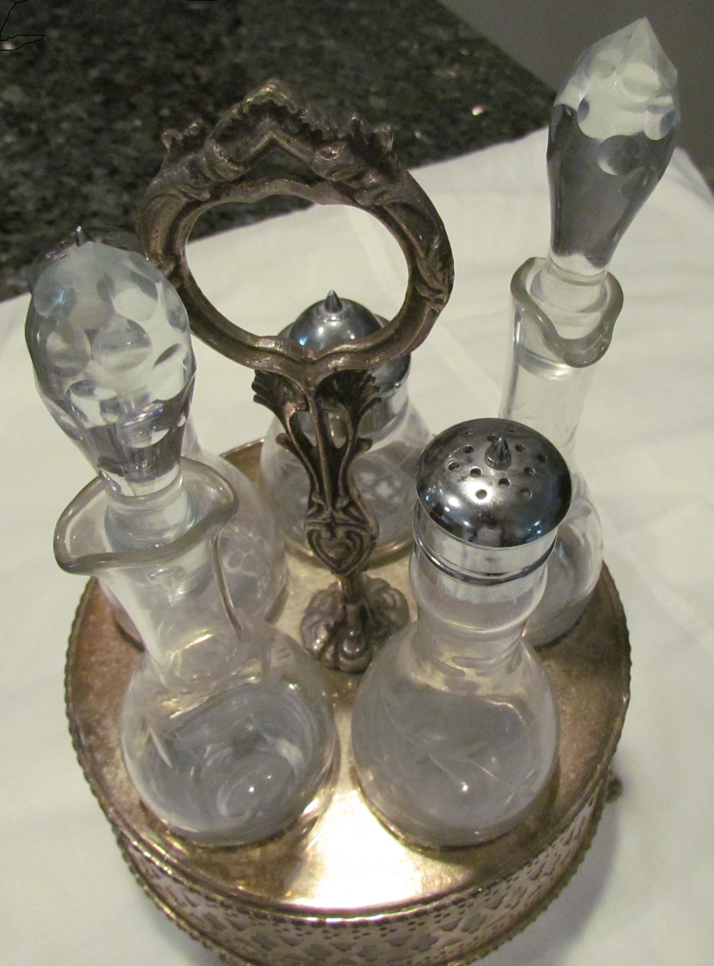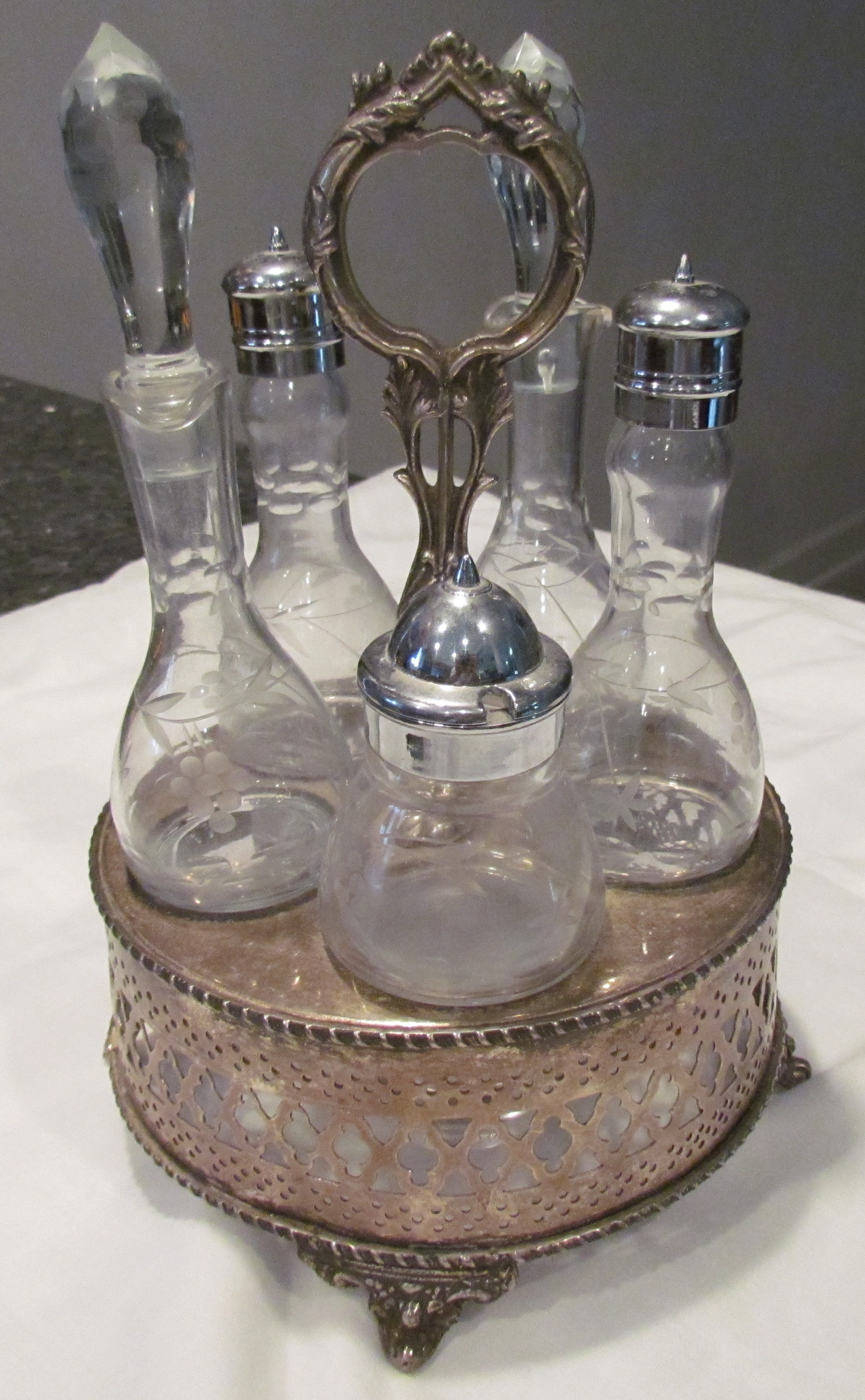 This is a silver 5 piece cruet set by Mermod Jaccard & Co. It dates prior to 1905 because the company changed names in 1905. There are 5 pices in excellent condition. A salt shaker and pepper shaker each with silver caps. Two botlles which I assume are oil/vinegar bottles with glass stoppers. The fifth piece is what appears to be a cream dispenser. The silver lid flips open to be filled but when the lid is closed there is an opening for pouring. The containers are crystal with no cracks, chips or scratches. Each has a decorative etching. The cruet base it decorative and also in excellent condition. All legs sit squarely on a flat surface and the silver is unscratched but as you can see a little tarnished.