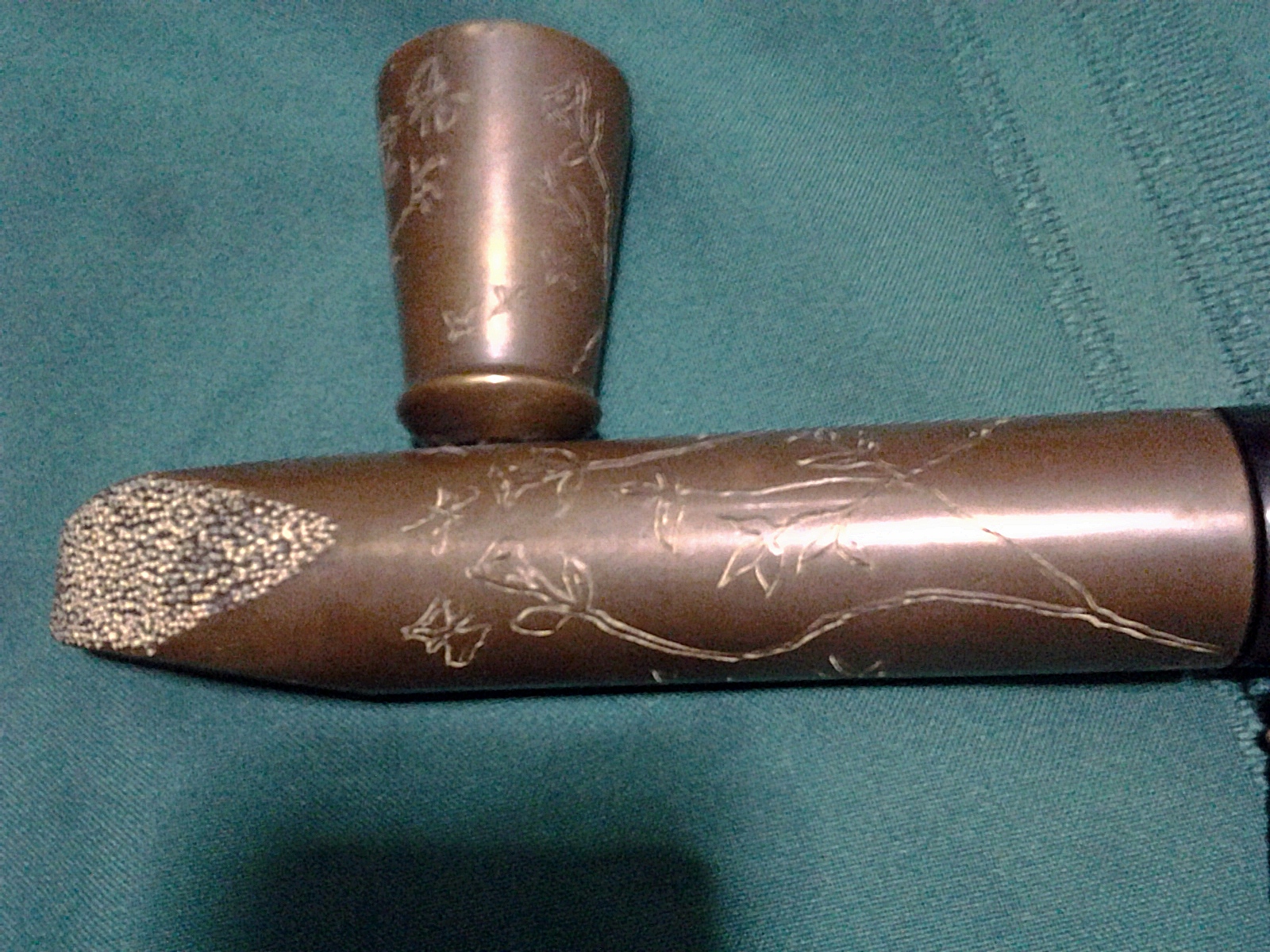 Distinguishing marks Metal has intricate floral carvings as well as on the middle part of the wood