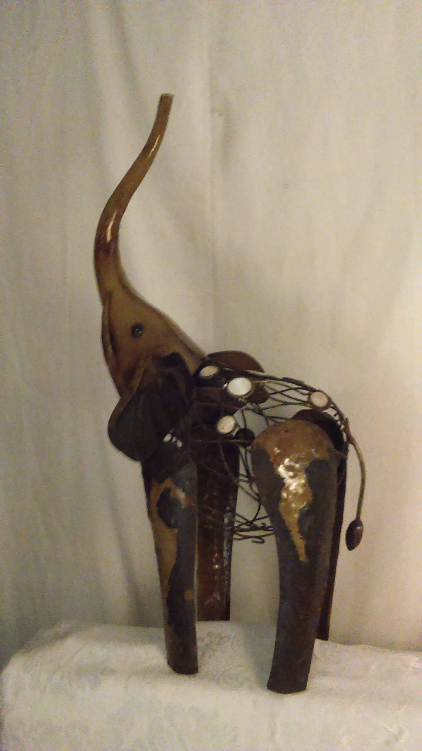 Description Metal and wire elephant sculpture with ivory round discs or mother of pearl discs motif. Approximately 26" height X 12 1/2" width
