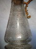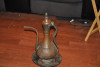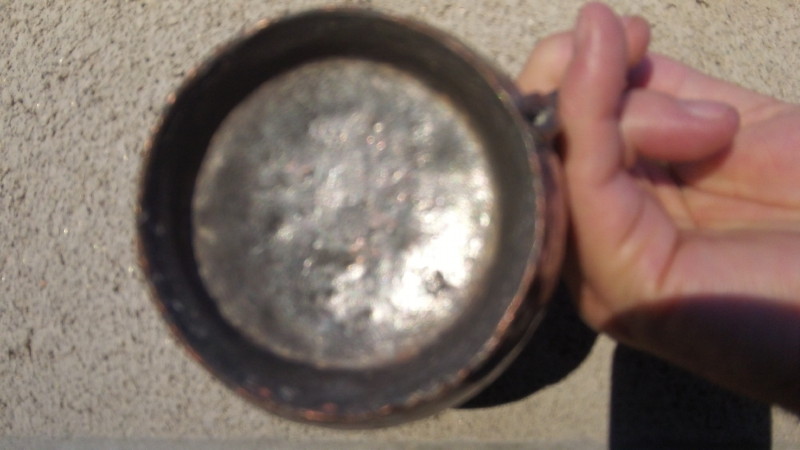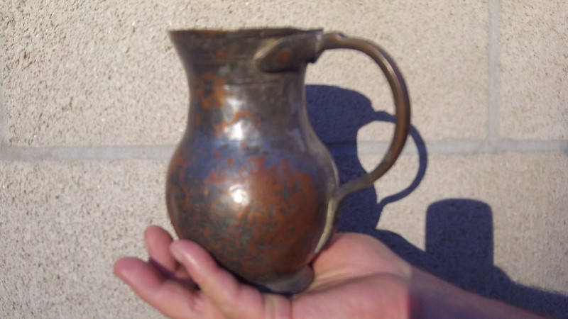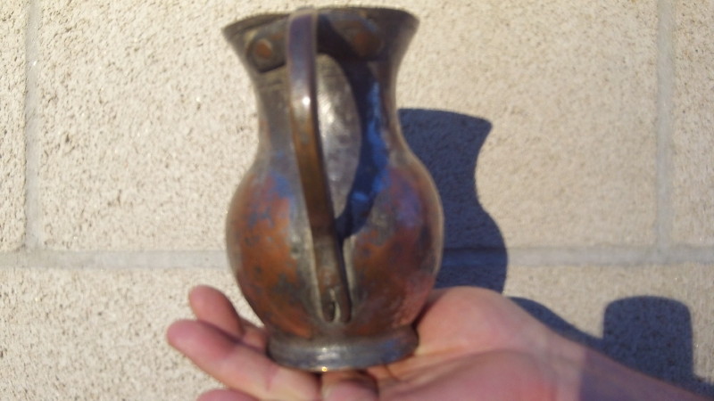 This is a metal ewer. It is 5.5 inches high, about 3-5/8 inches at it's widest, and the opening at the top is 3 inches, and narrows to about 2 1/2 inches at the narrowest part. The base is 1/2 inch deep, 2 - 1/2 inches wide at the base. I am not sure of the metal, but it appears to be copper or brass plated. This ewer belonged to my father, who collected unusual items. The origin is unknown to me. There are horizontal lines circling the ewer at 3/16, 3/8, 1/2 , and 2 inches below the top opening on the exterior. The handle appears to be secured at the top with two large rivet-like studs, and one at the bottom of the handle. The heads of these rivets are about 7/16 inch in diameter. The ewer appears to be made out of a different metal than the plating on the exterior, but I am not a metals expert.