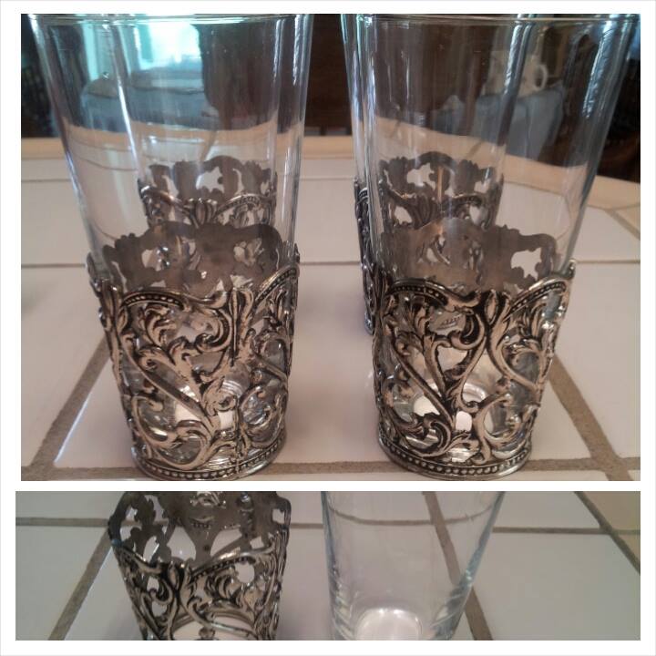 I've looked for some kind of markings on the large glasses and have not found anything....but the little glasses do have marking but they aren't legible...They do have wear on them I've been told that they are silver plated...