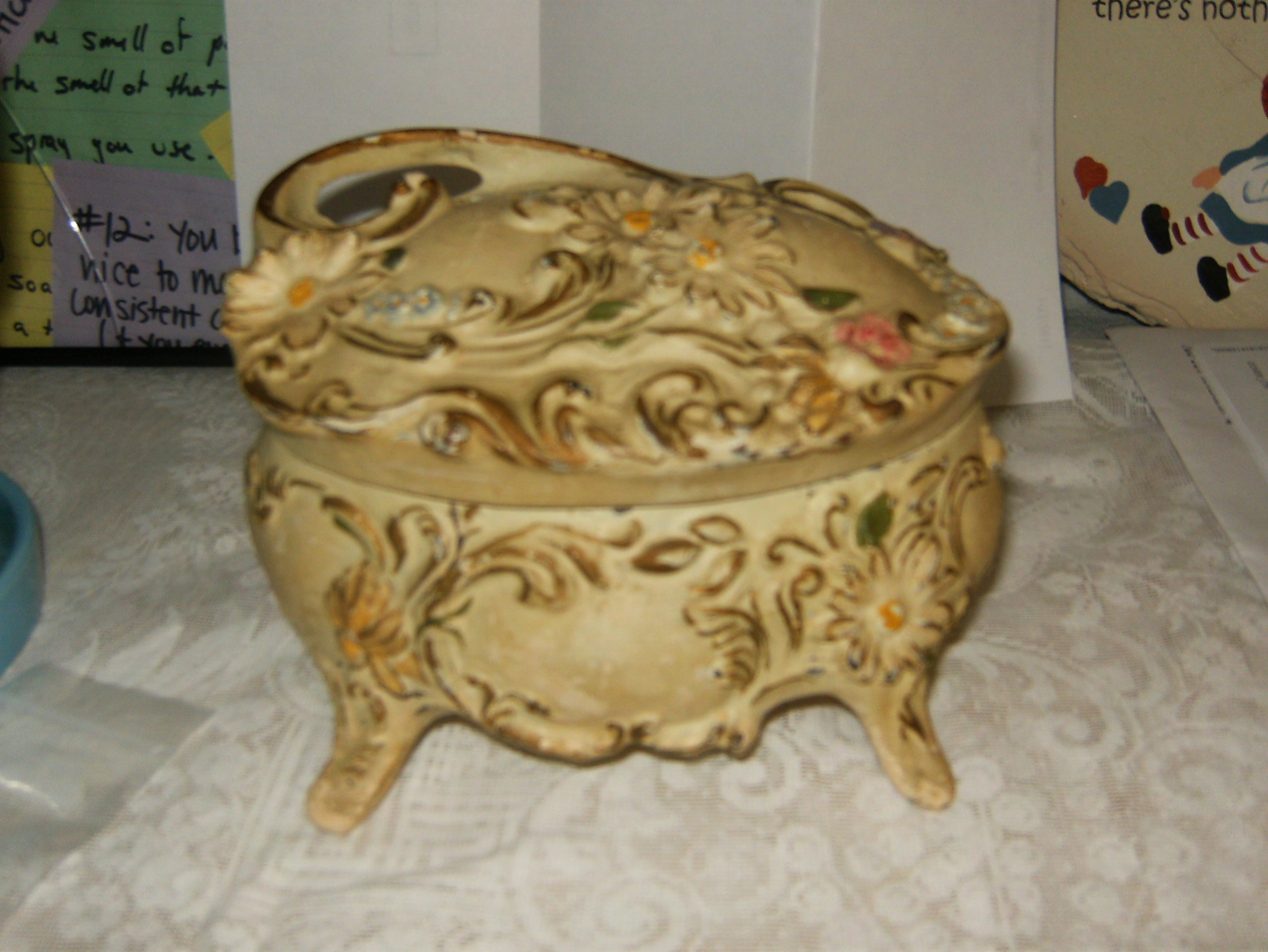 History Found this at a yard sale, not sure of the history but think it might be called a jewelry box casket? It is metal but is painted and am not sure if the paint is original or not.
