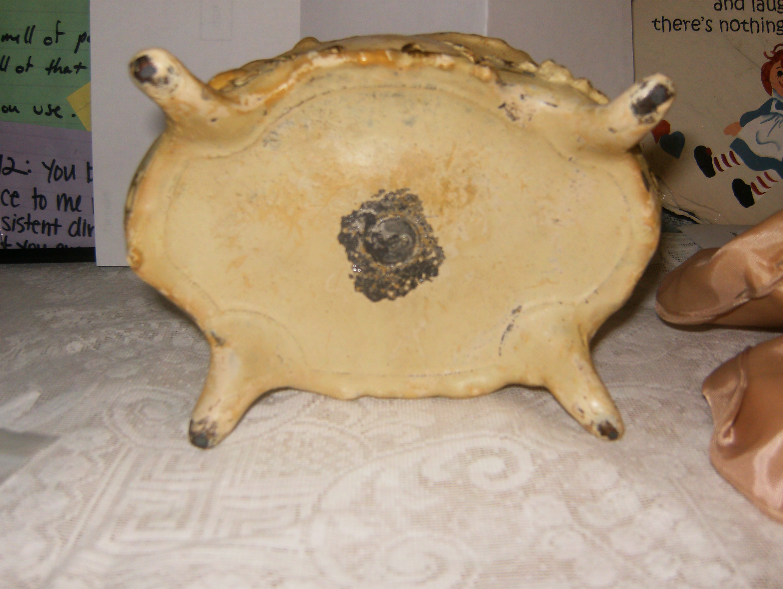 The first picture is of the front side. There is a small crack in the metal but the hinge works perfectly. The next picture is of the bottom of the box which the paint is scratched off and shows the numbers 138 in a round stamp.