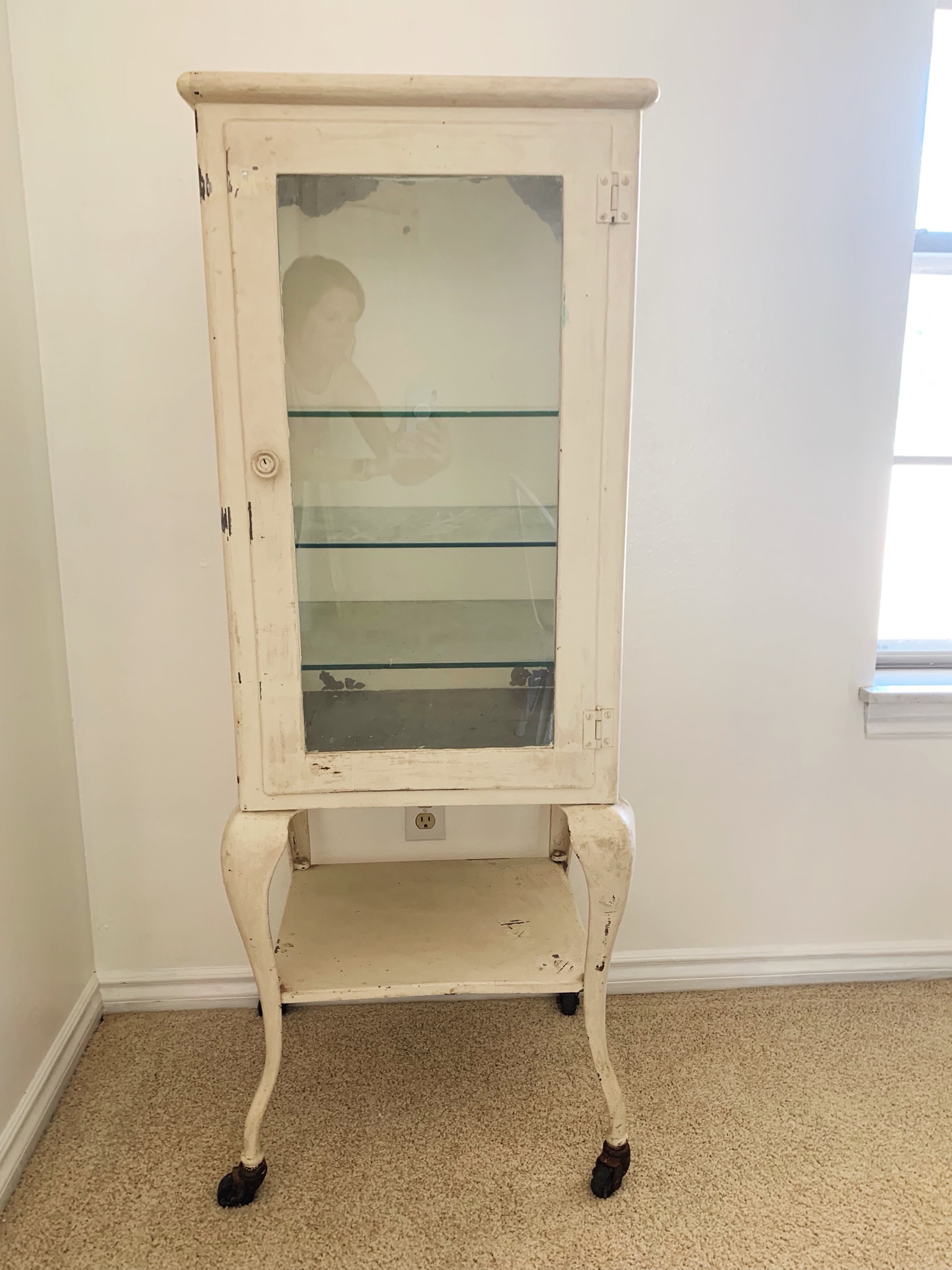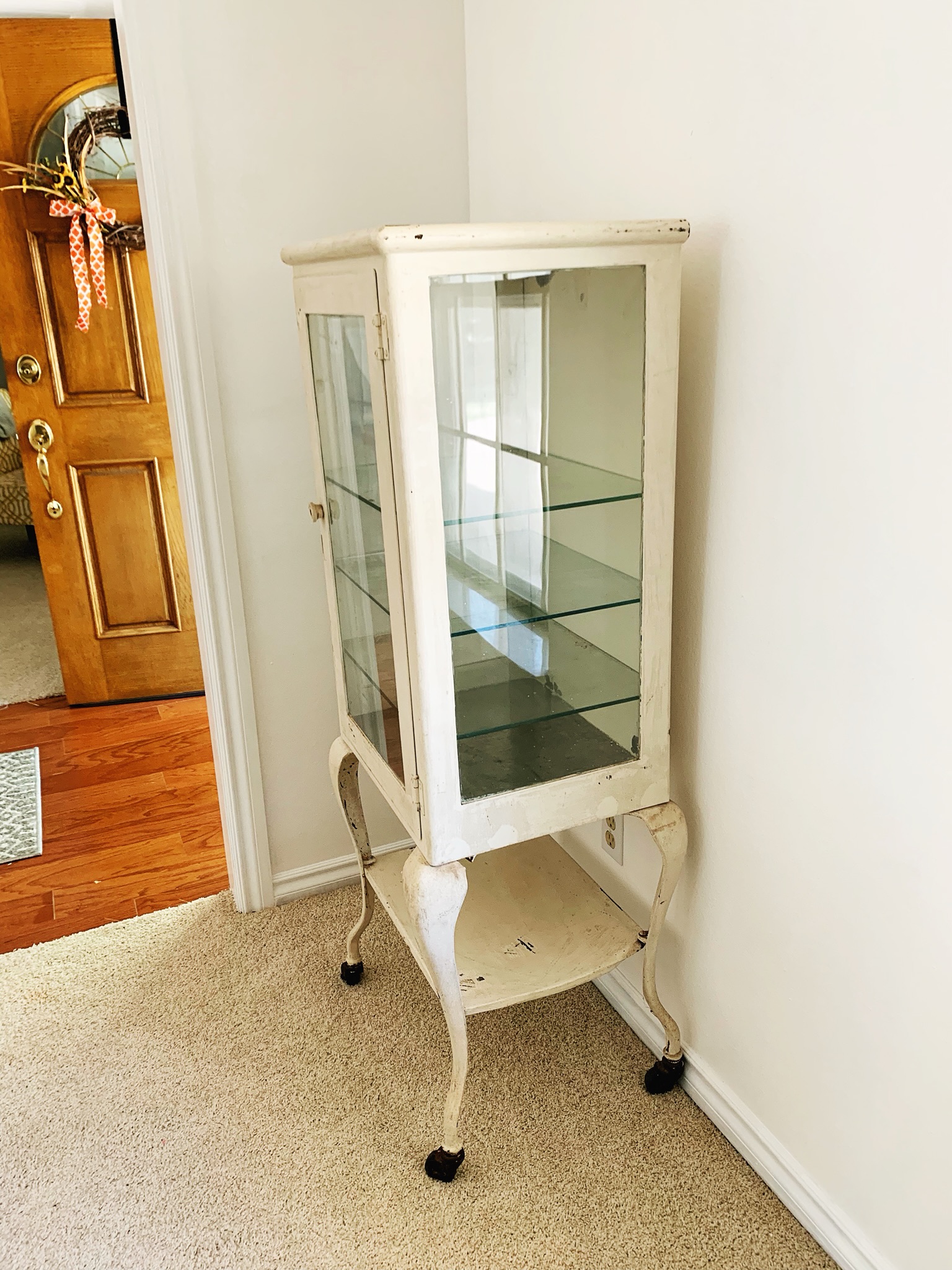 55 inches tall metal medical cabinet on wheels. About 19 inches wide with three glass shelves with slots for a fourth.