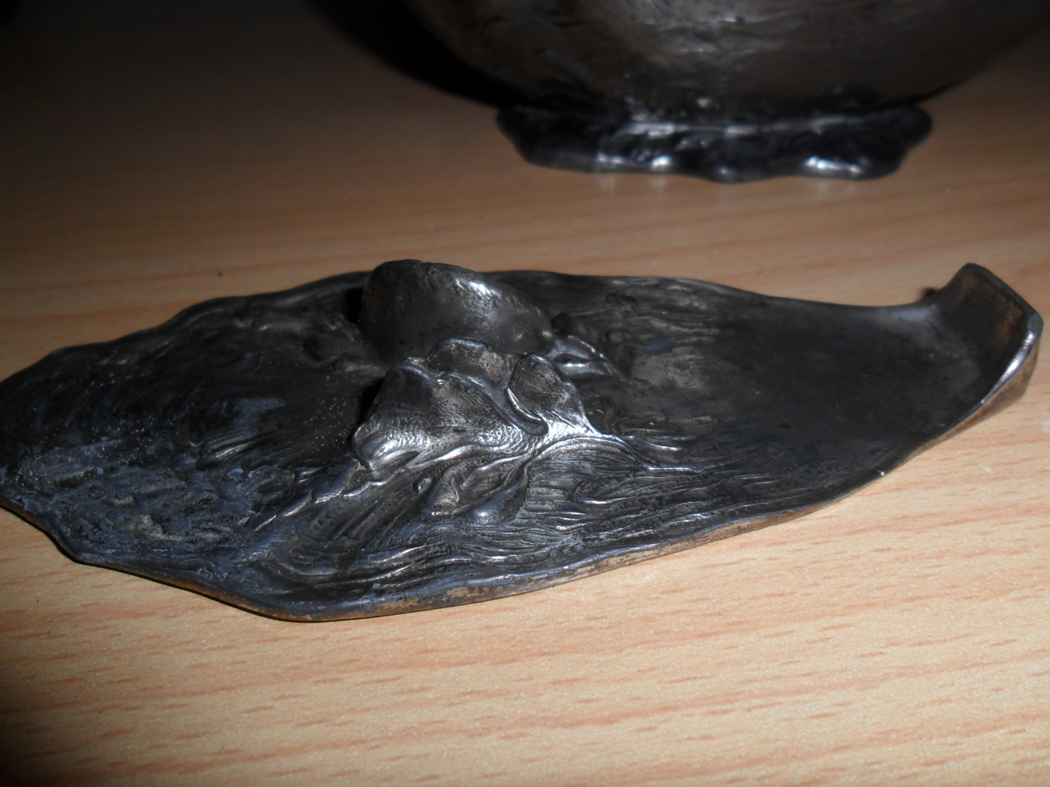 base. Very decorative, looks silver in colour (tarnished) but there are no hallmarks just
