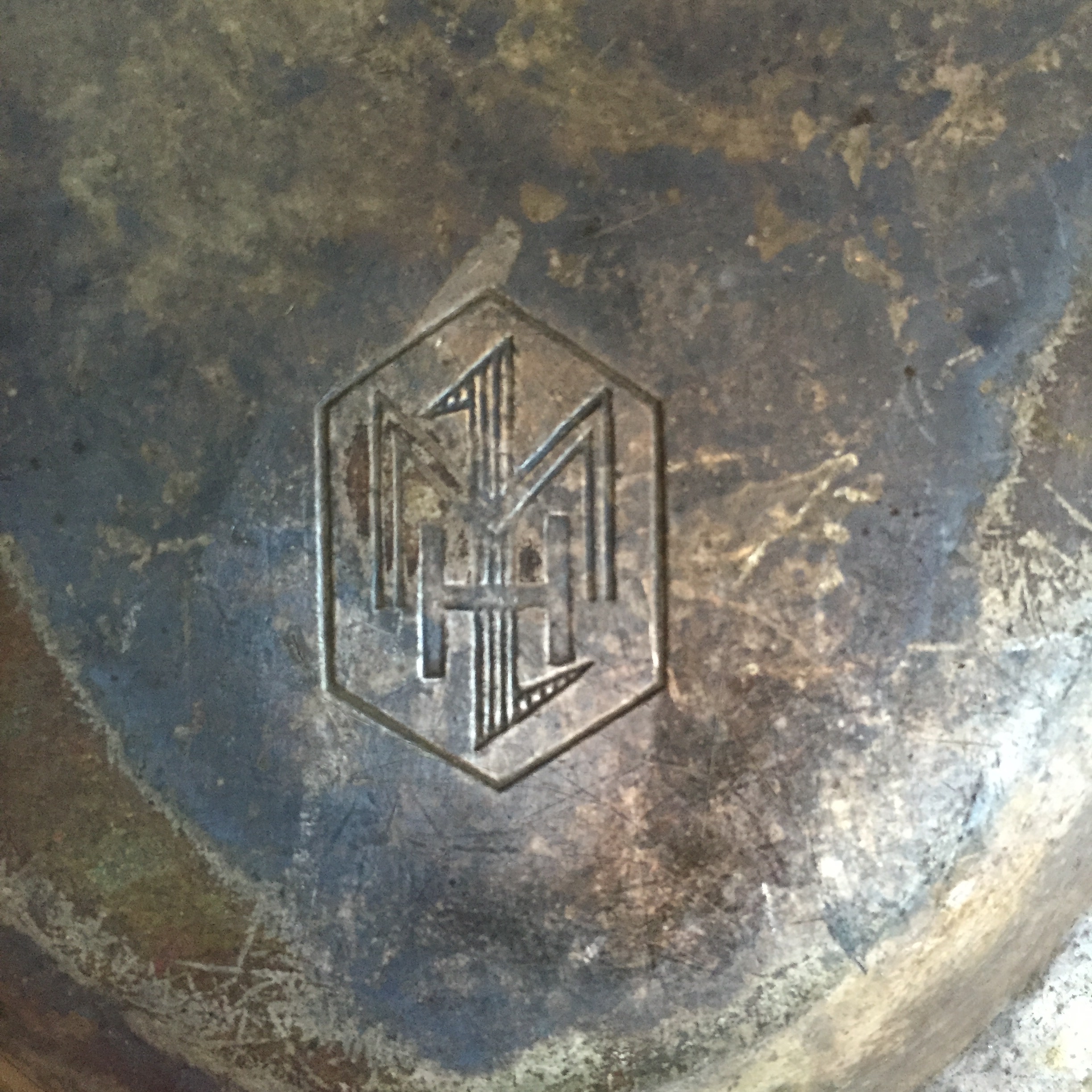 It needs polishing, but I am unable to find out what type of metal it is, and who the manufacturer is. The tradestamp on the bottom is unlocatable to me on other websites.
