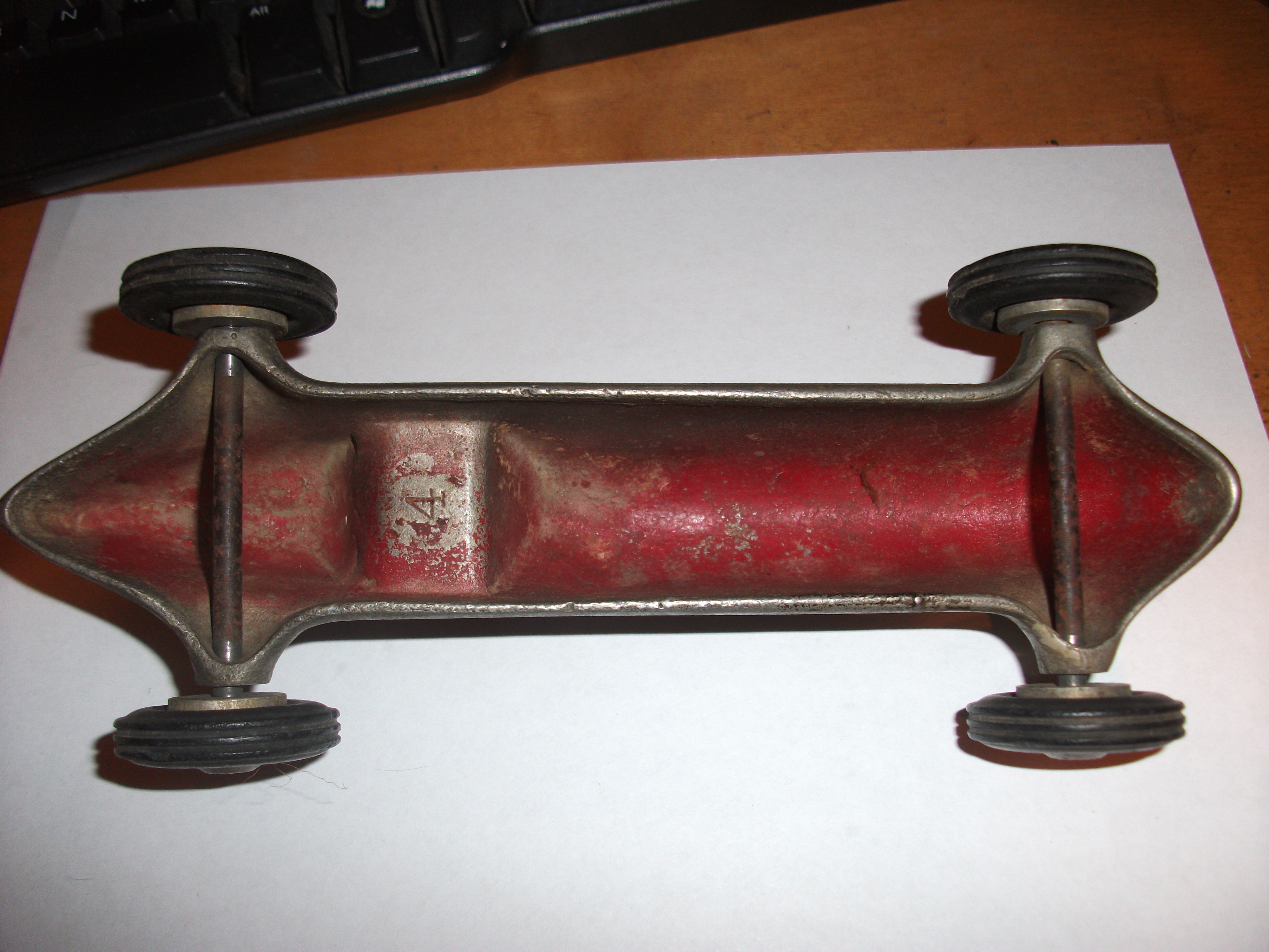Metal alloy push race car with hard rubber tires in great shape.  There is a number stamp on bottom of (4).  No Identifyable marking of manufacturer can be seen, so no idea who made it or of what date it was made.