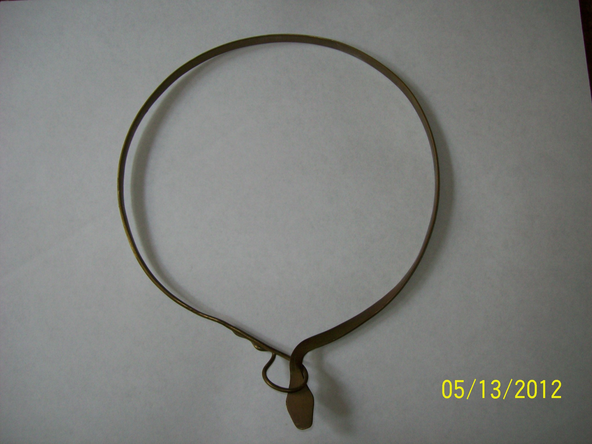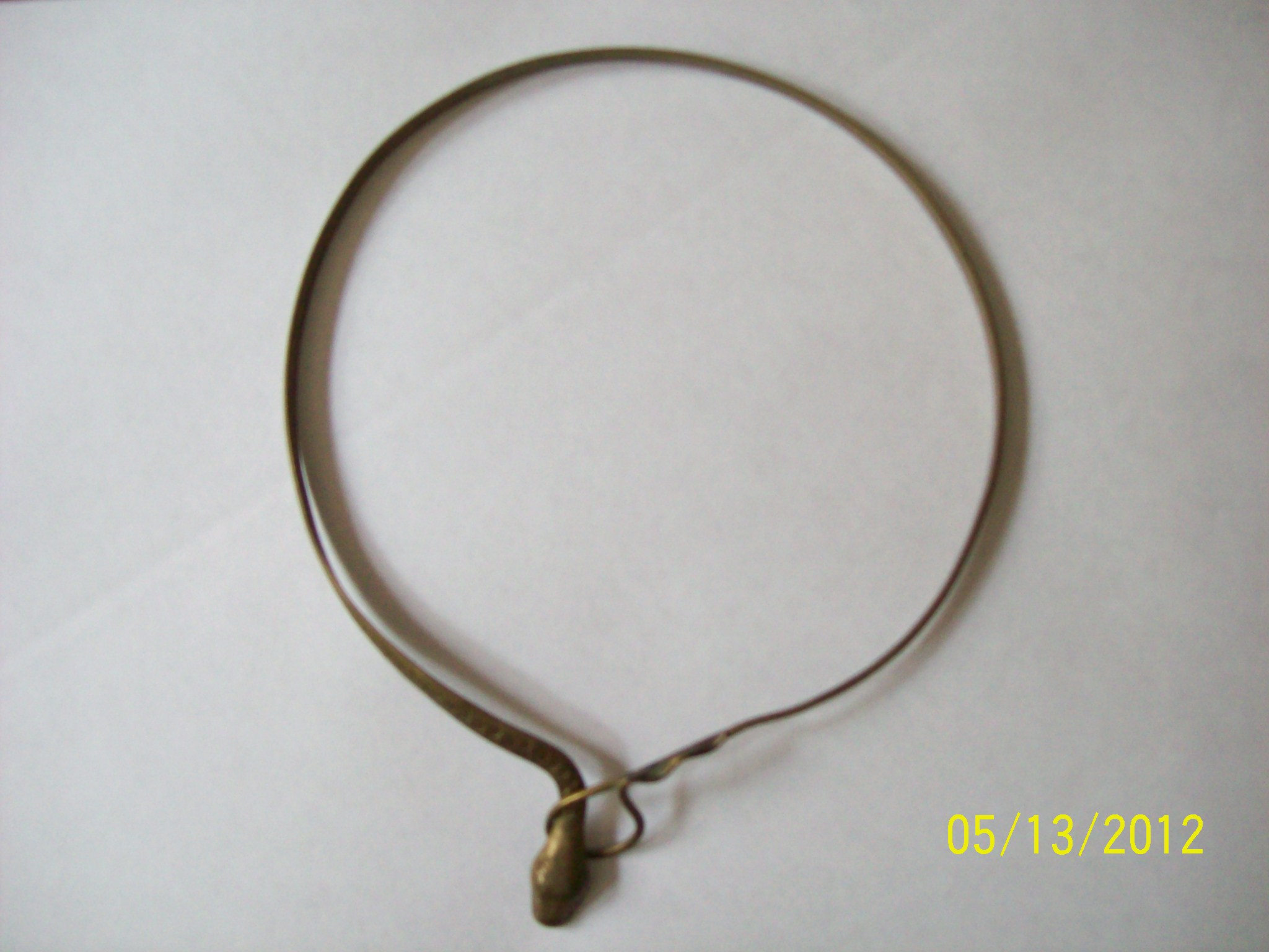 I found this necklace at a elderly snake lover's yard sale about 5 years ago. I too love snakes so I grabbed it up. I find it a pain to wear because of its rigidity though, its not very comfortable. The necklace is a snake, and it clasps in front by having its head go through its tail.