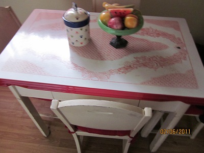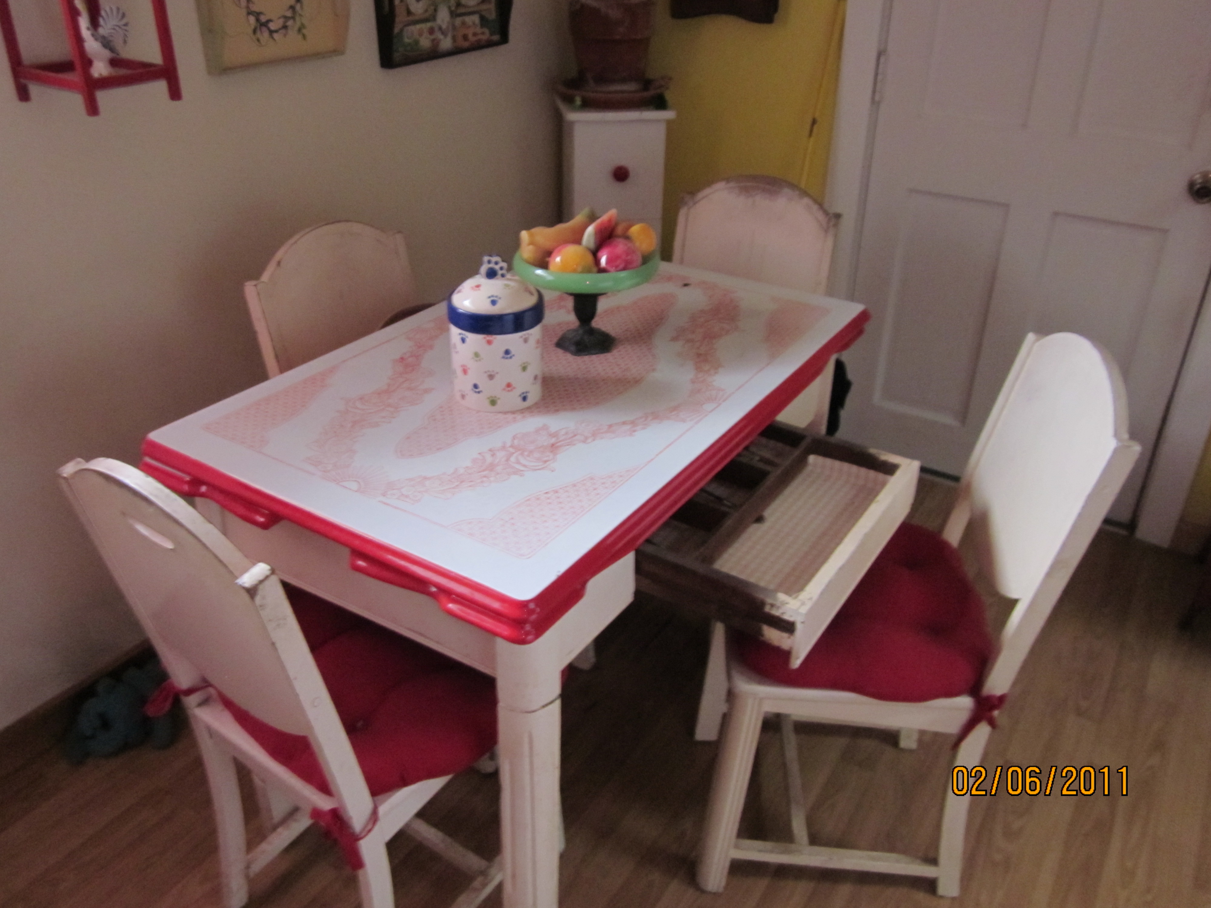 This table and chairs are in original condition.  You can see the wear on the chair backs where people touched them over the years.  Two are more worn then the other two.  Table has a divided silverware drawer and two table leafs that slide out from under.
