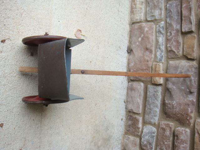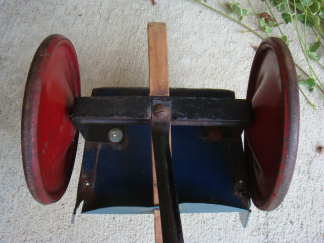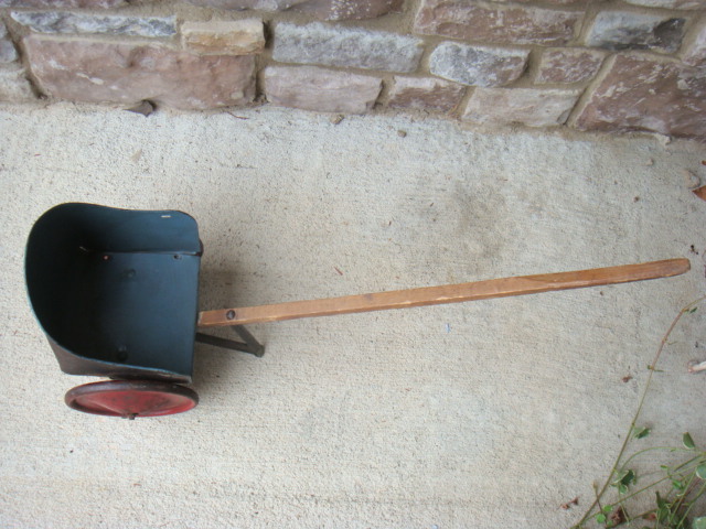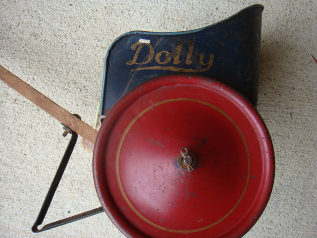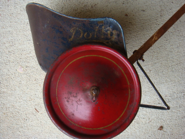 This is 10.5" high, 8.75" wide, the body is 6" deep and the handle is 25.25" long. It's a tin or light steel body, two wheeled cart with a dark blue body and large red metal wheels & a long wooden straight push handle. The word "Dolly" is painted in a script pattern on both sides. The body has signs of use and a light patina of surface rust but no bare spots, holes, or bent pieces. The wheels are red & straight, still roll. Appears to be a childs push cart for a baby doll.