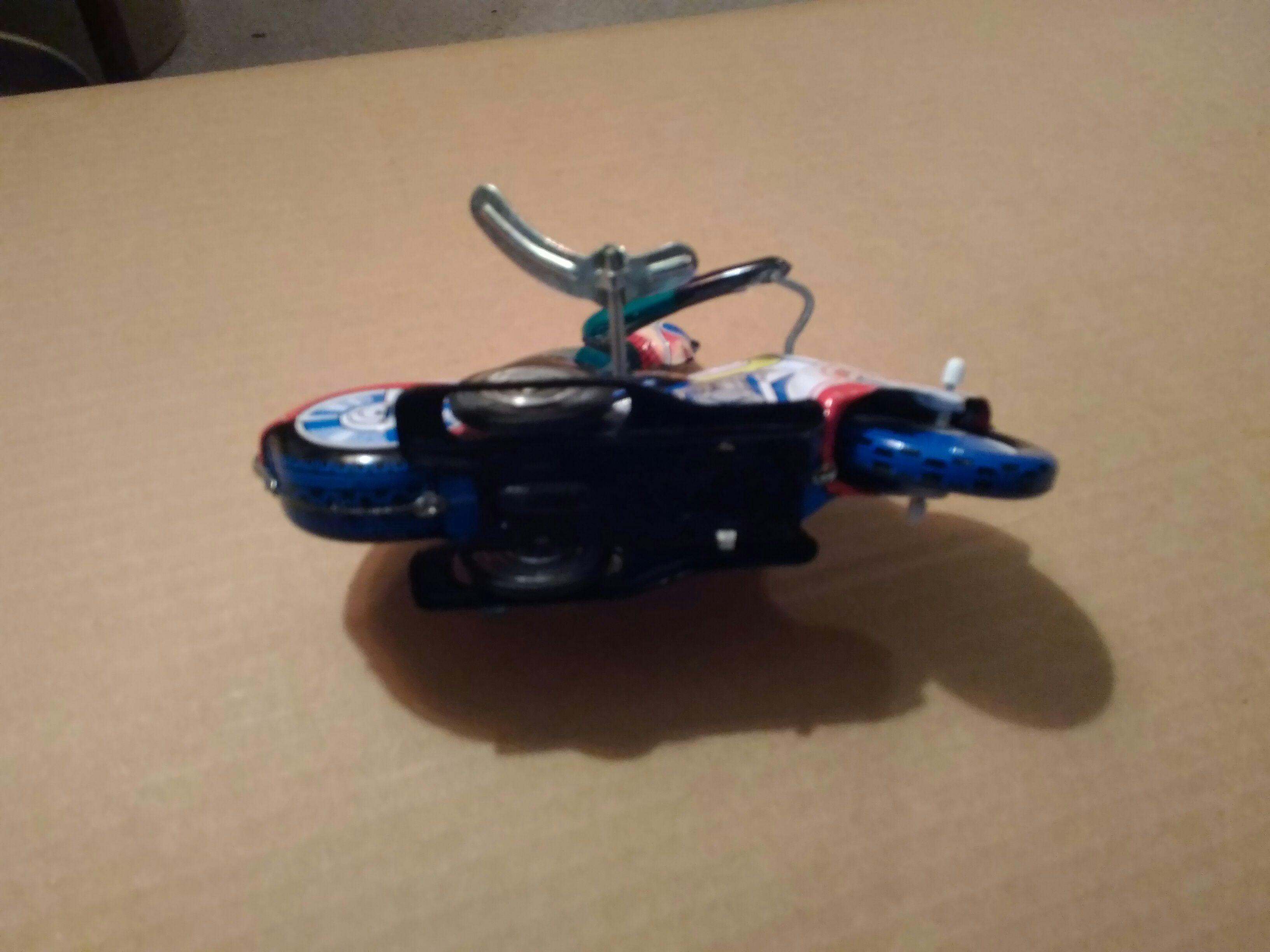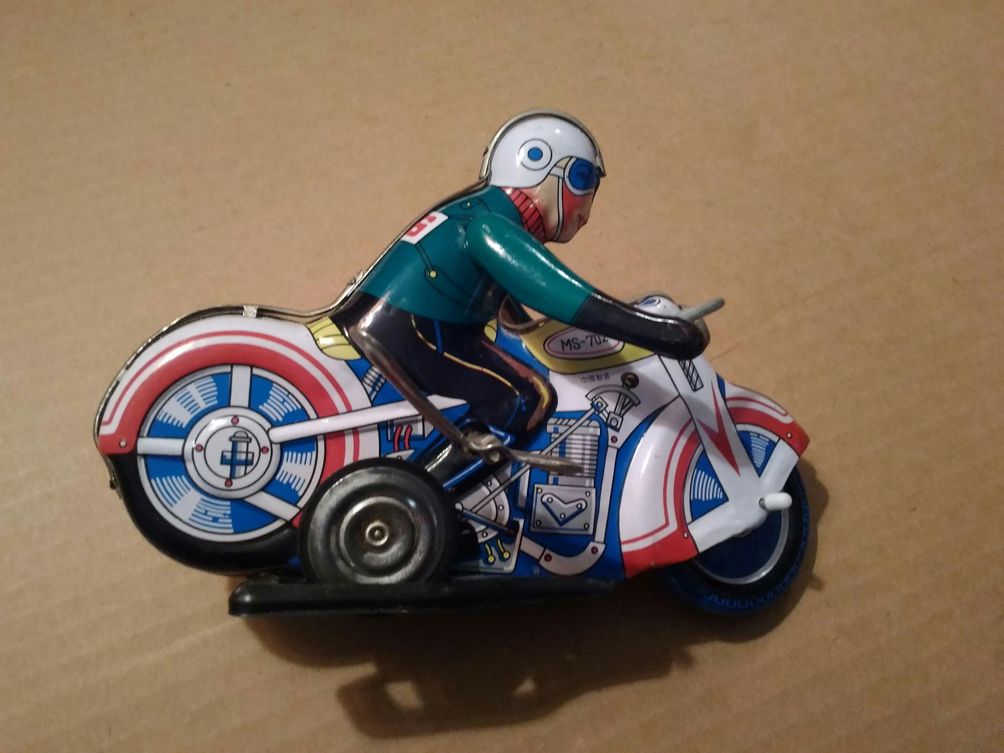 Metal wind-up motorcycle toy that works made in China numbers 602 underneath trade stamp writer with green jacket on white motorcycle with blue and red trim