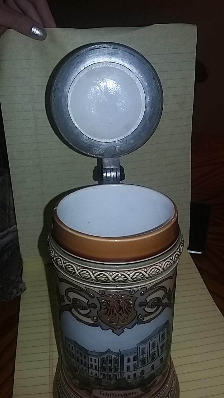 Mettlach German beer stein no.1742 1/5 liter Has faded mercury mark Date code 87 Etched with the cuter of gottingen with 2 men on either side one with a sword the other a powder horn.