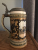 On the front side of this plaque are two German gentleman drinking, laughing, smiling, having a good old time. In the backround is very beautifully colored & unique scenery. On the bottom, front side, something is written in German inside of the scroll like image. On the back side of this plaque is etched the no 3161. Also etched is the name METTLACH, and above that is an imprint, symbol of some sort.