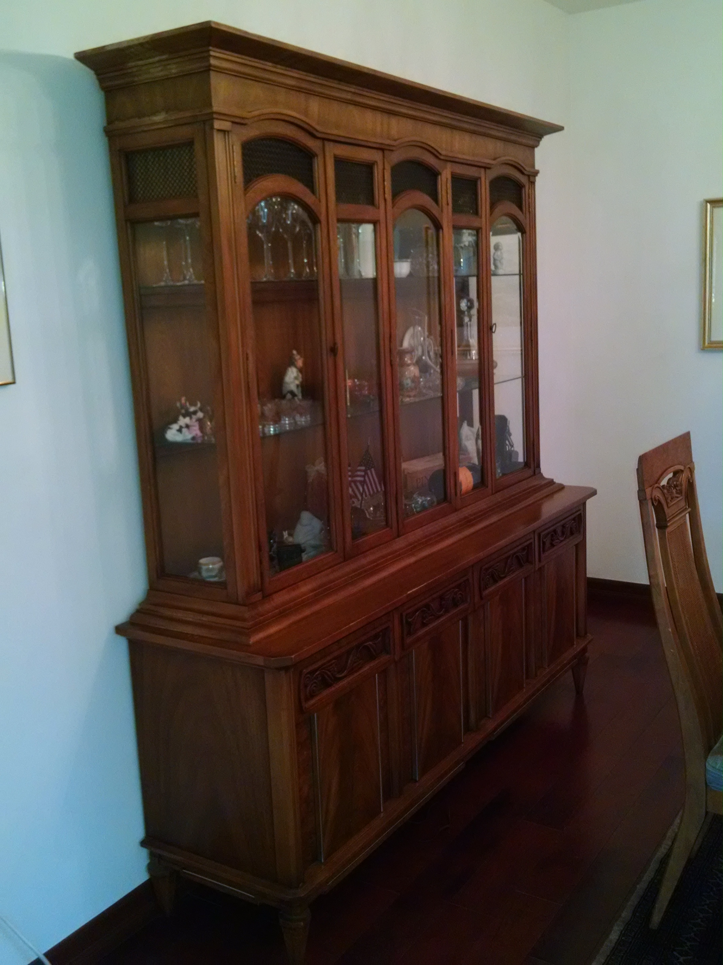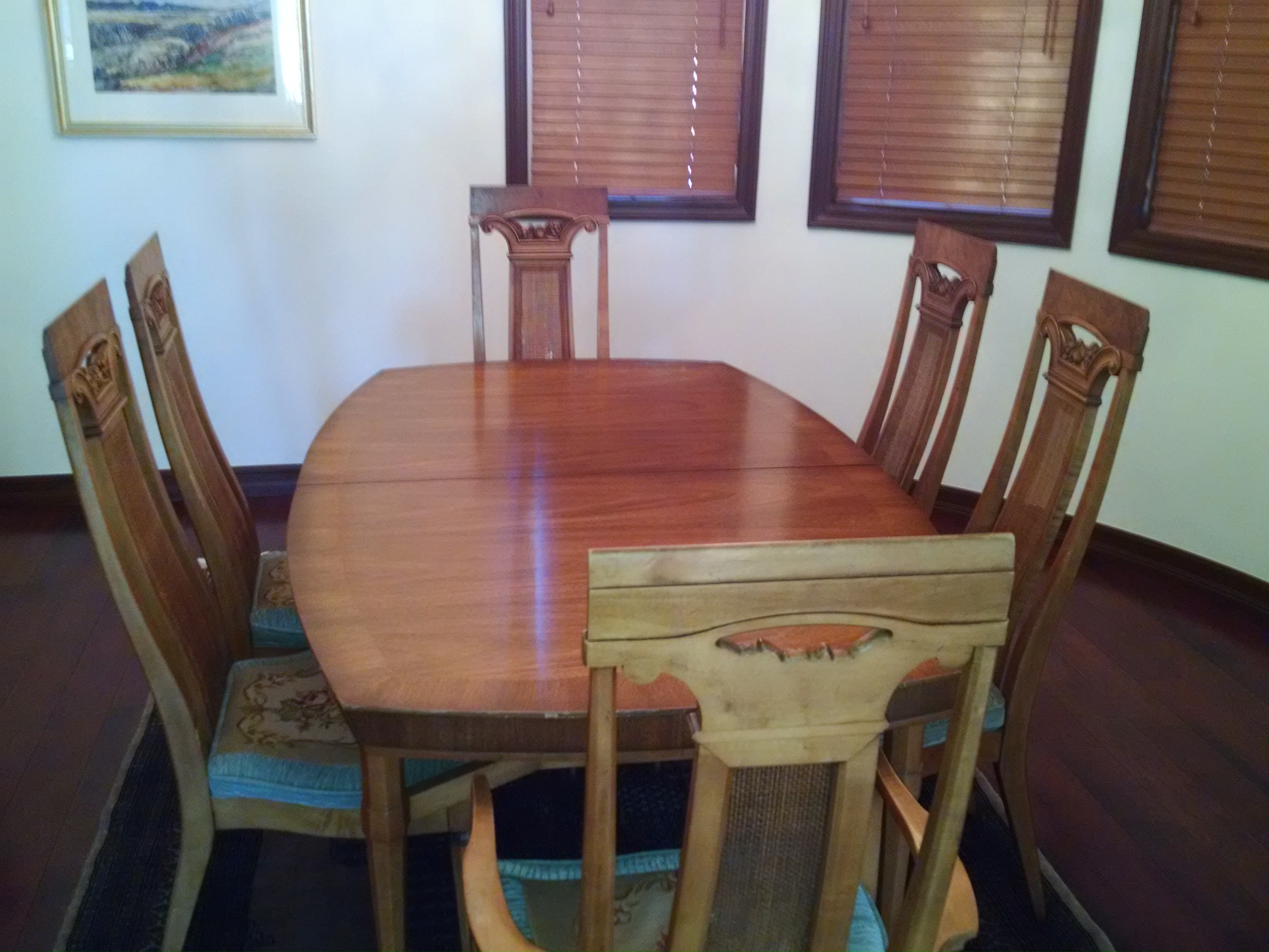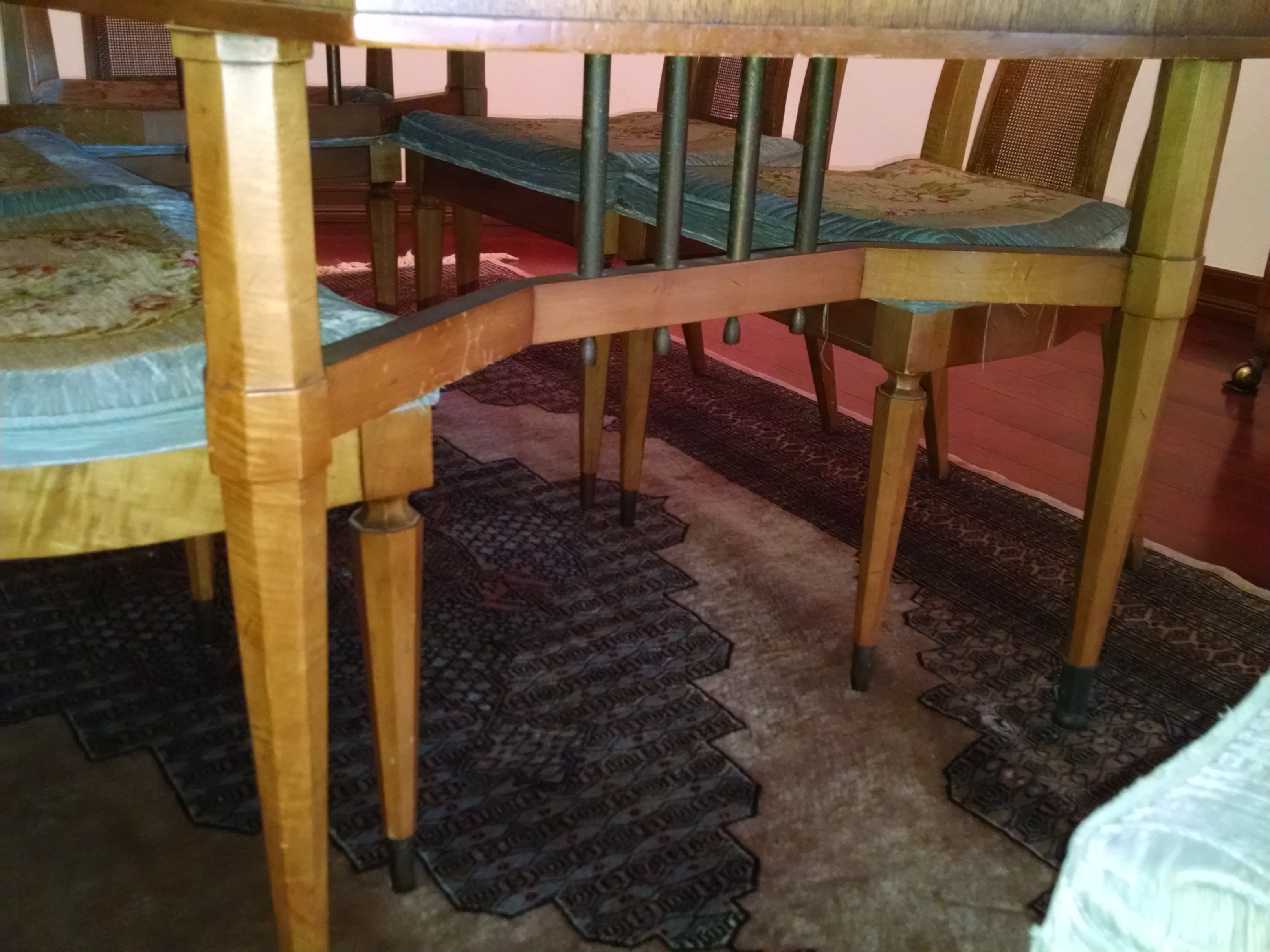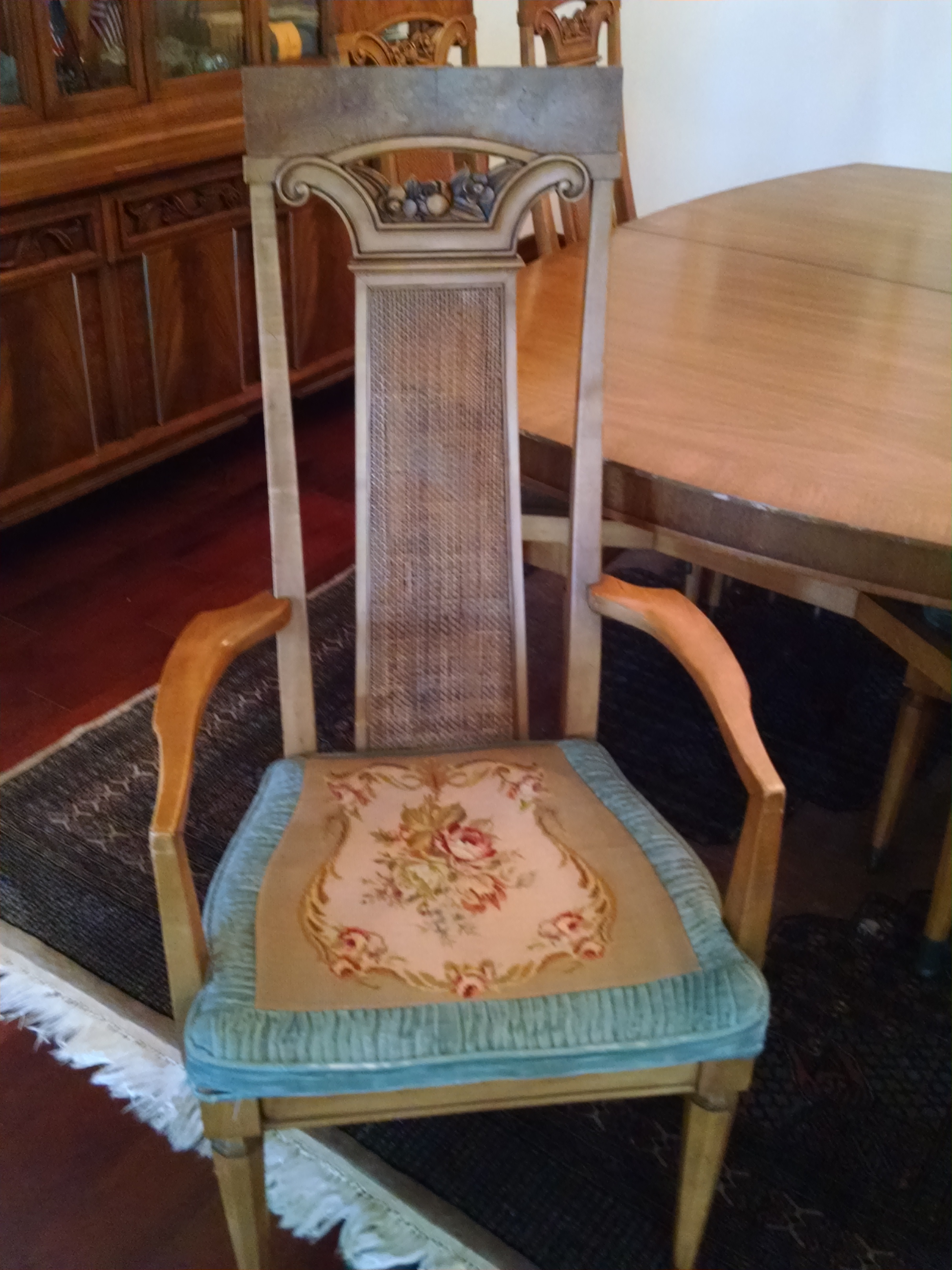 Metz Furniture Co. Dining Room Set. Dining room table with two leaves and pads. Six chairs with embroidered seats and wicker panel backs. Large, two piece china cabinet with carved wood panels and felt lined drawers with silverware compartments. Side serving table with folding leaves and center stome inlaid surface.