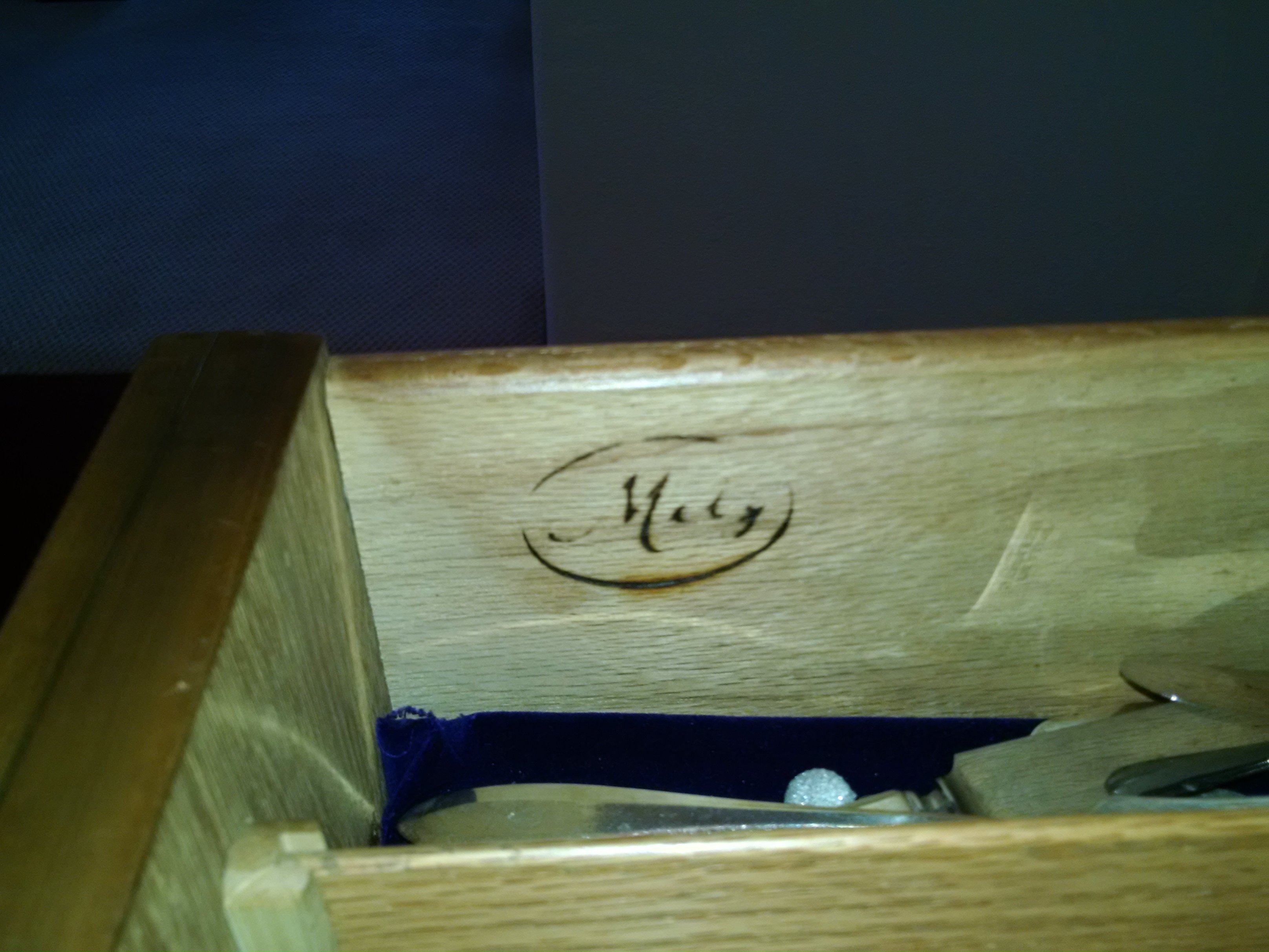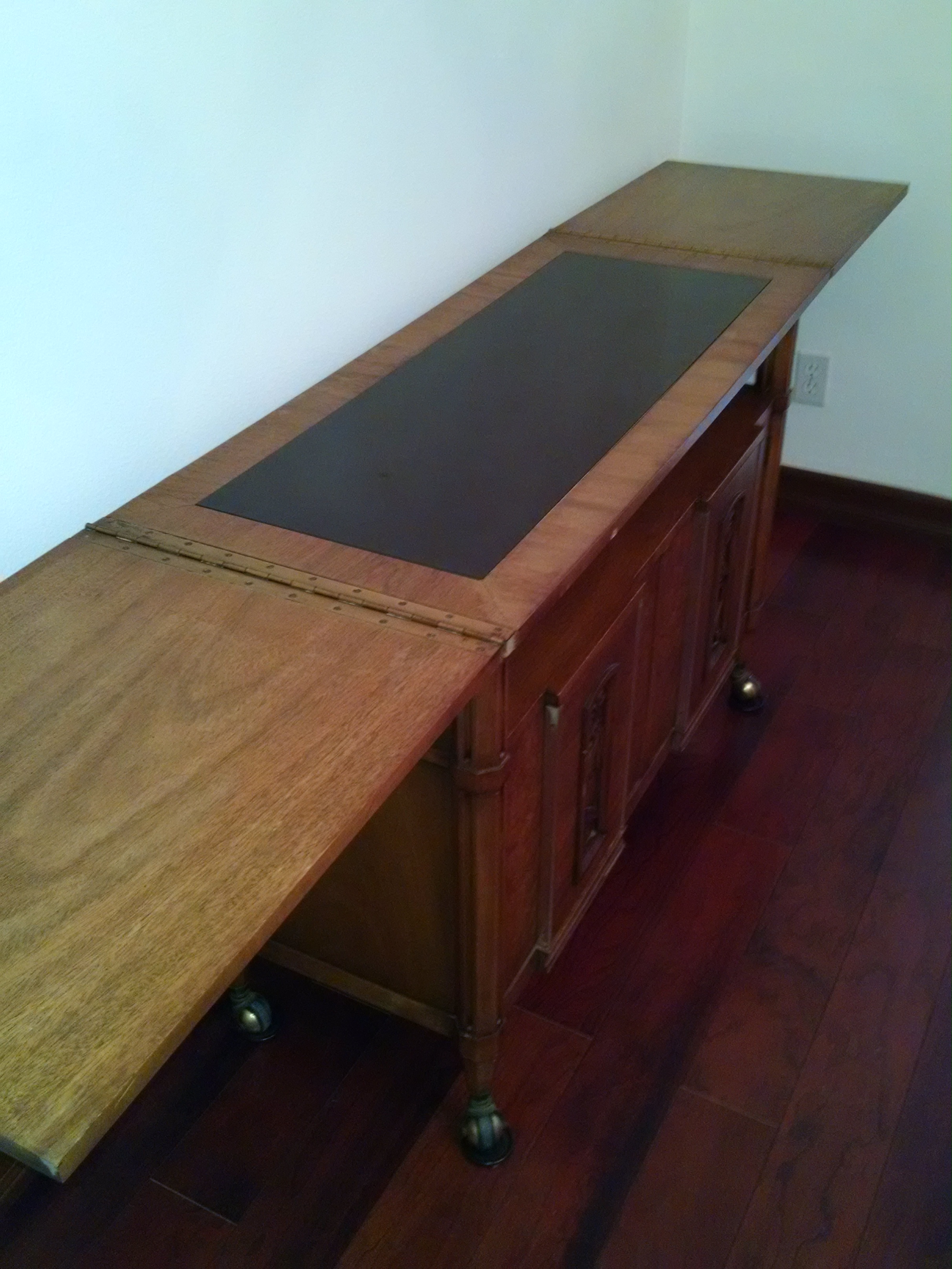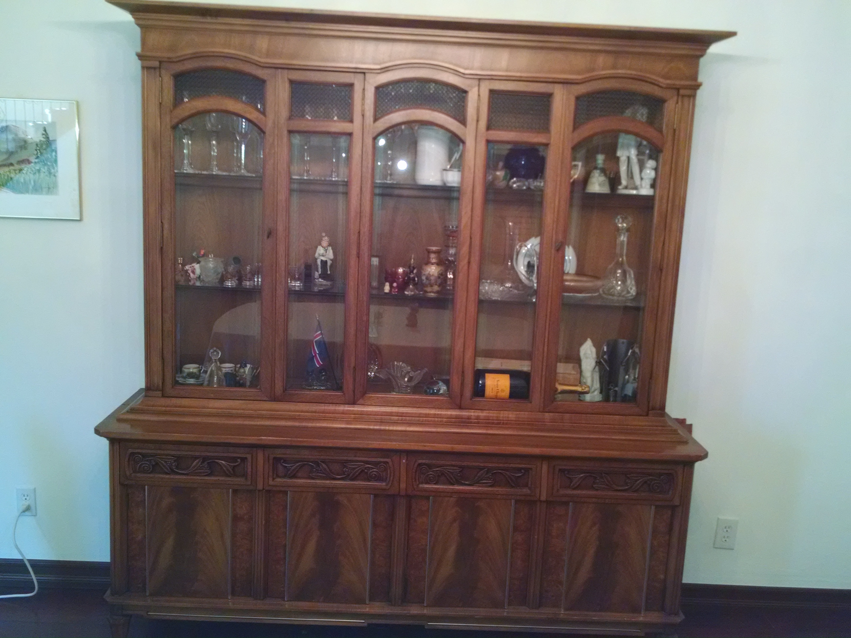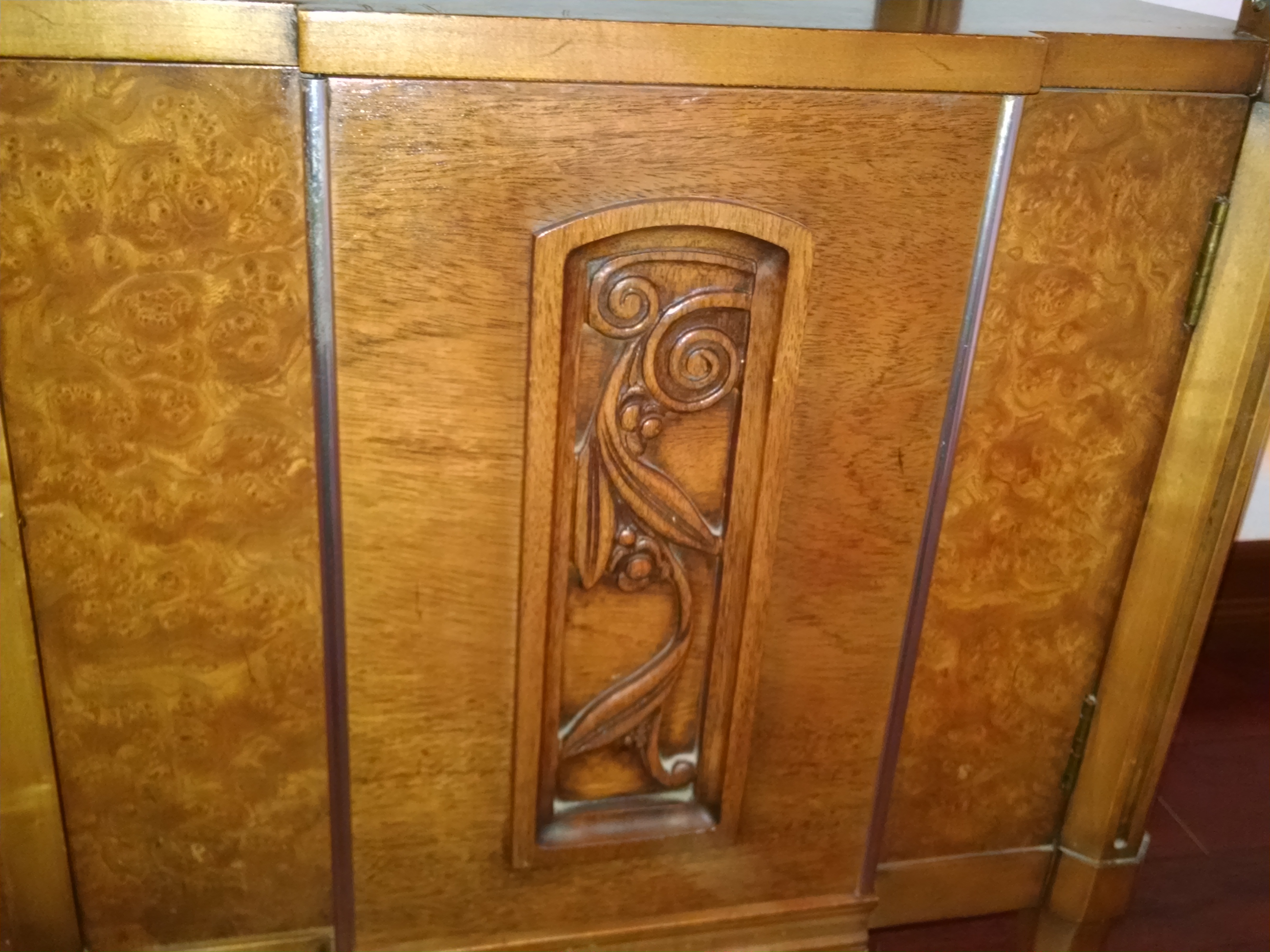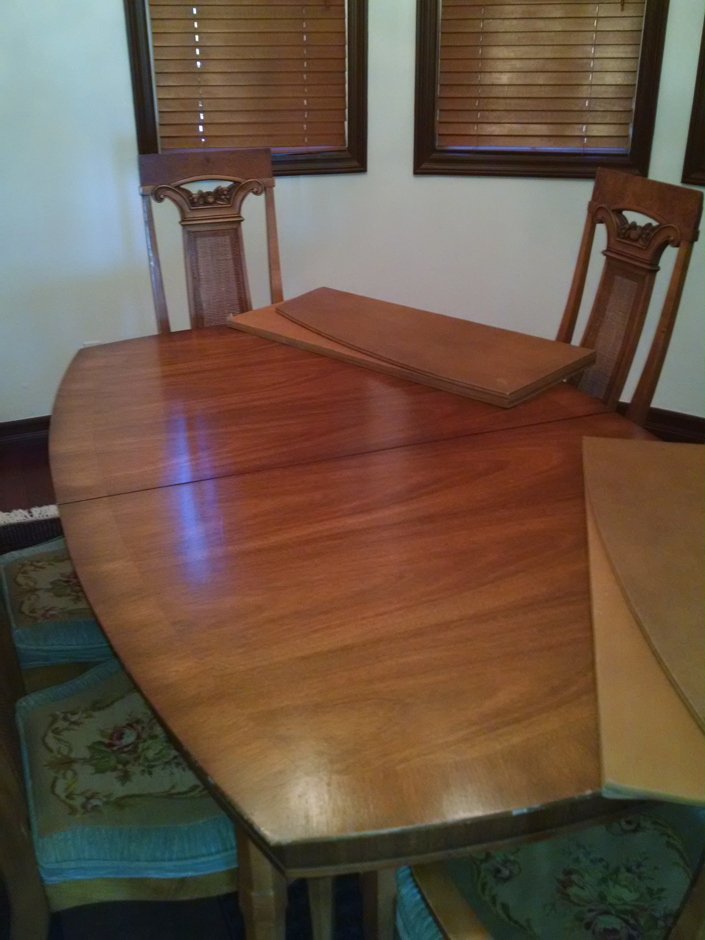 Metz Furniture Co. Dining Room Set. Dining room table with two leaves and pads. Six chairs with embroidered seats and wicker panel backs. Large, two piece china cabinet with carved wood panels and felt lined drawers with silverware compartments. Side serving table with folding leaves and center stome inlaid surface.