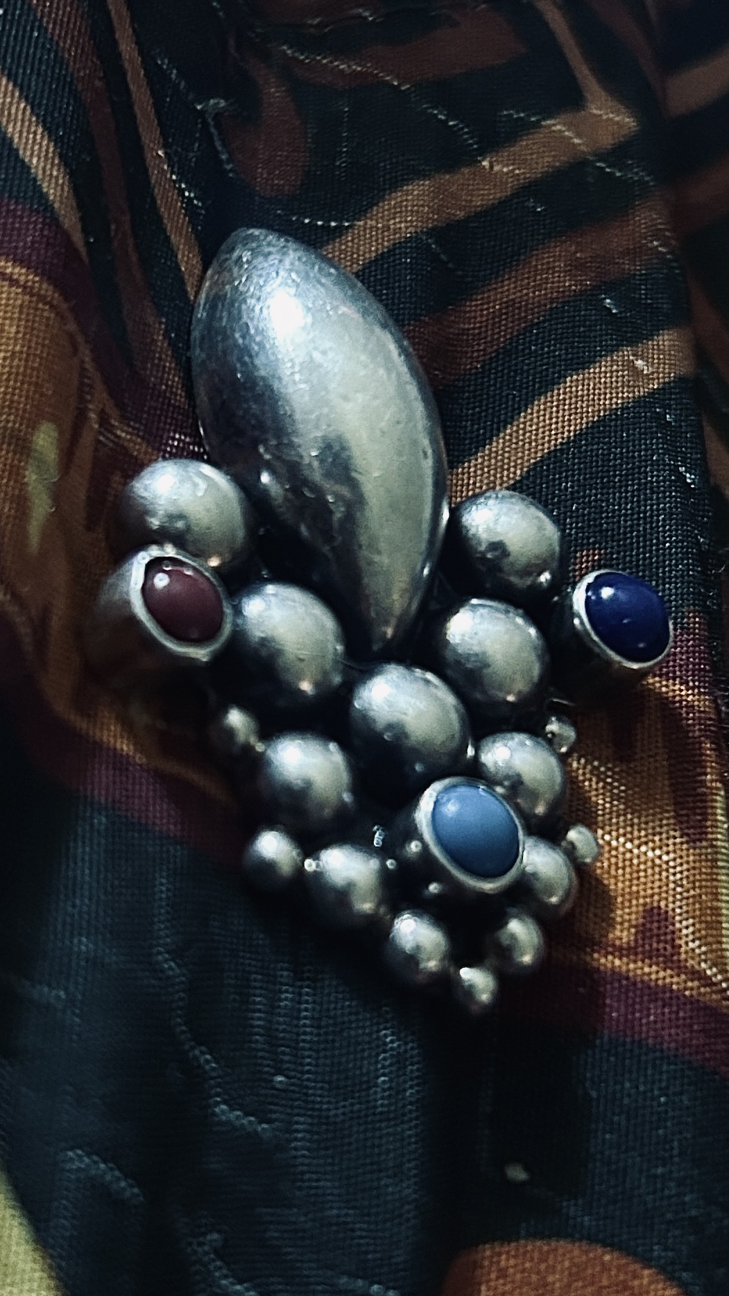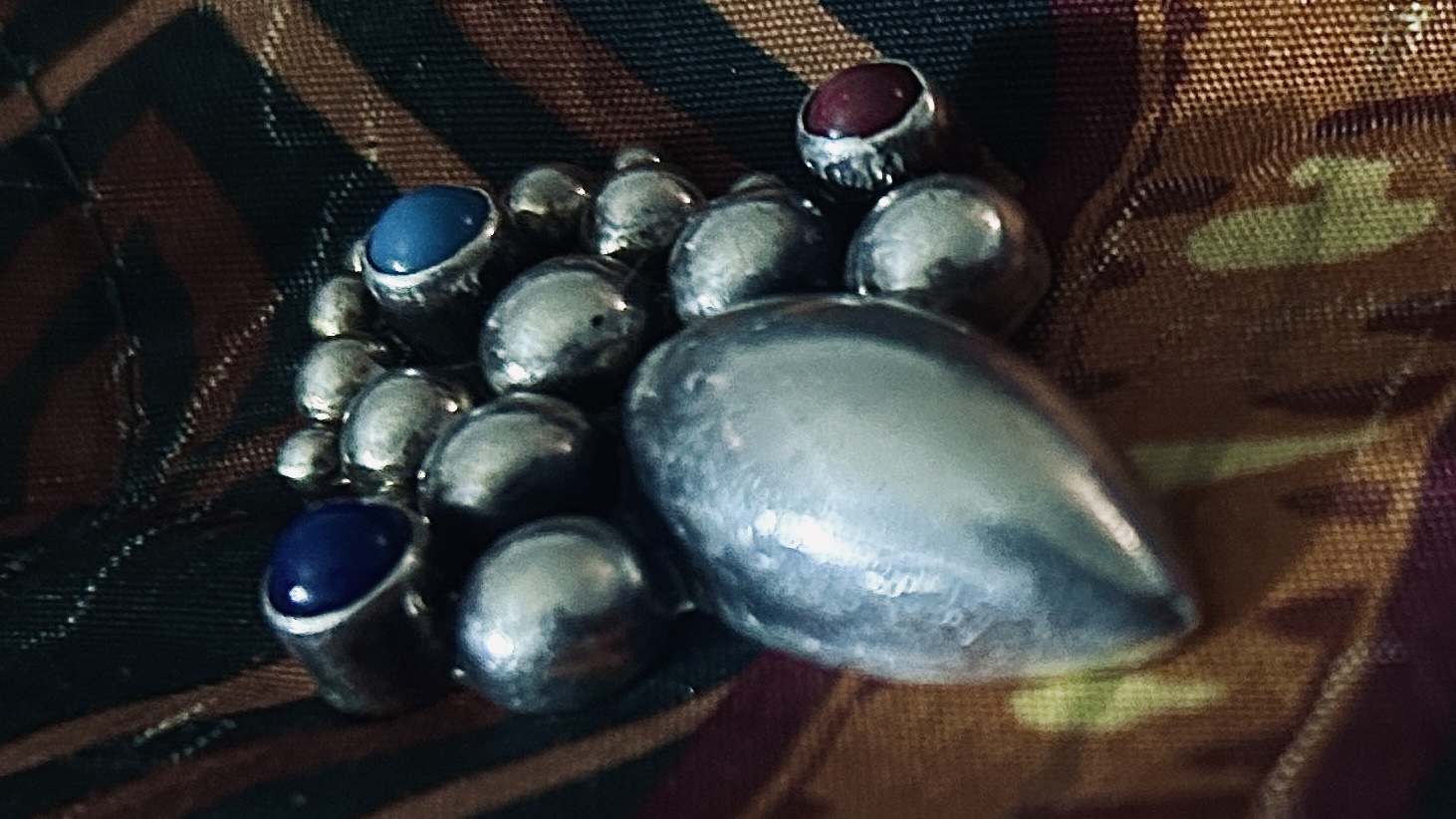 Mexican Silver Jewelry Brooch. Made by Unknown Mexican Silversmith. Dating to 1970-1991. Materials: Sterling silver with colored stones (red, blue, turquoise). Estimated value: $100 – $150. Condition: Very Good. Stable market with moderate demand for vintage Mexican silver jewelry.