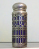 Salt and pepper shakers on a tray. The shakers have flowers imprinted on the perimeter and similar flowers on the tray perimeter. The bases of the shakers screw off for filling.