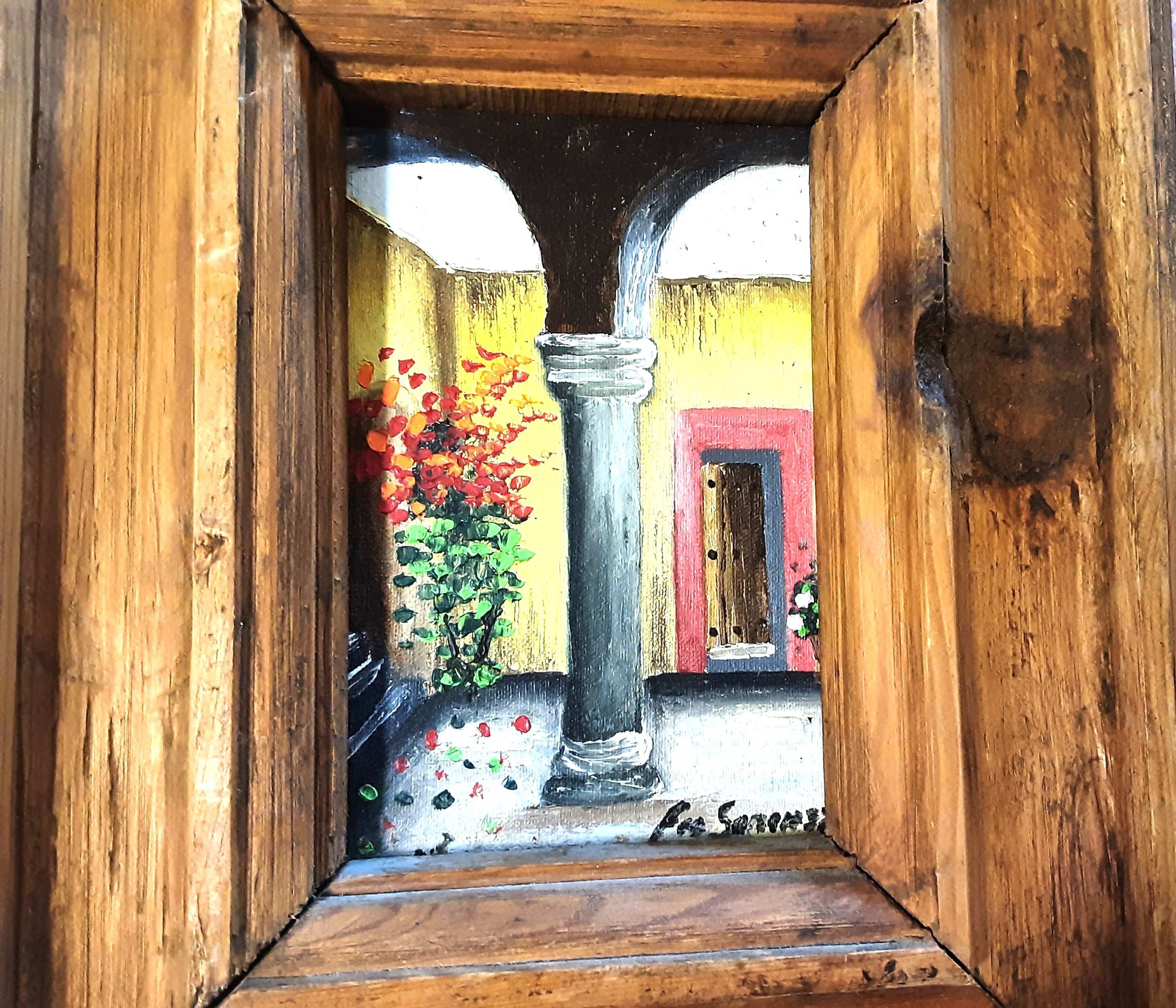 The frame is made of solid heavy wood with natural imperfections, probably hand-made, imitates a window opened into the courtyard. Very charming piece.