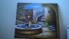 This item is a miniature oil on canvas painting depicting a Latin-American arched courtyard