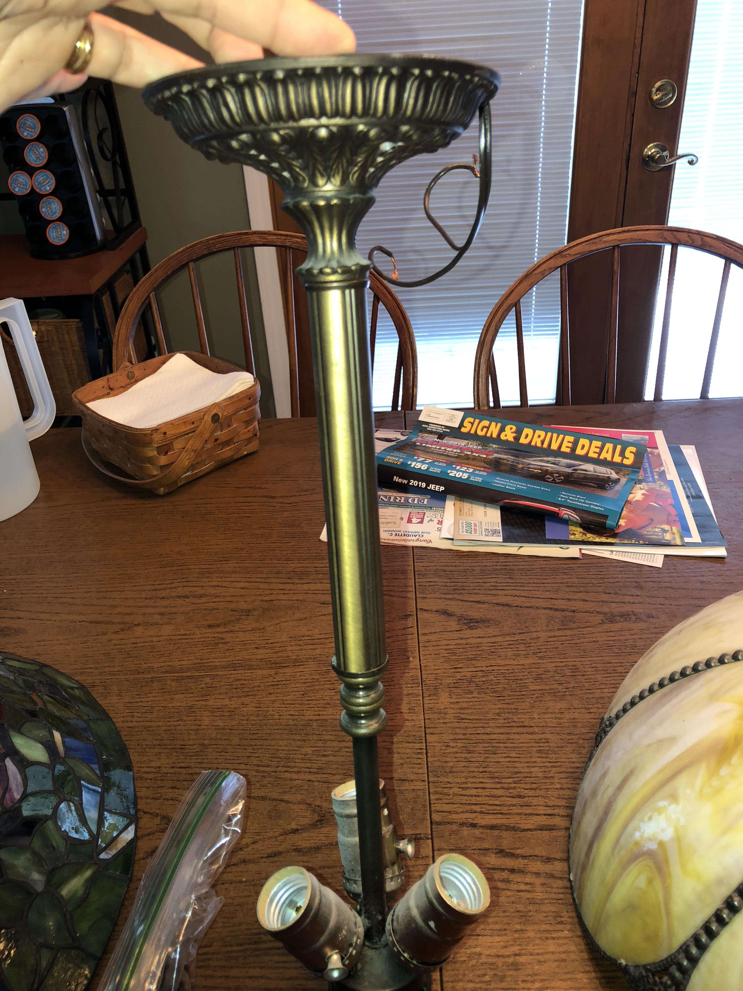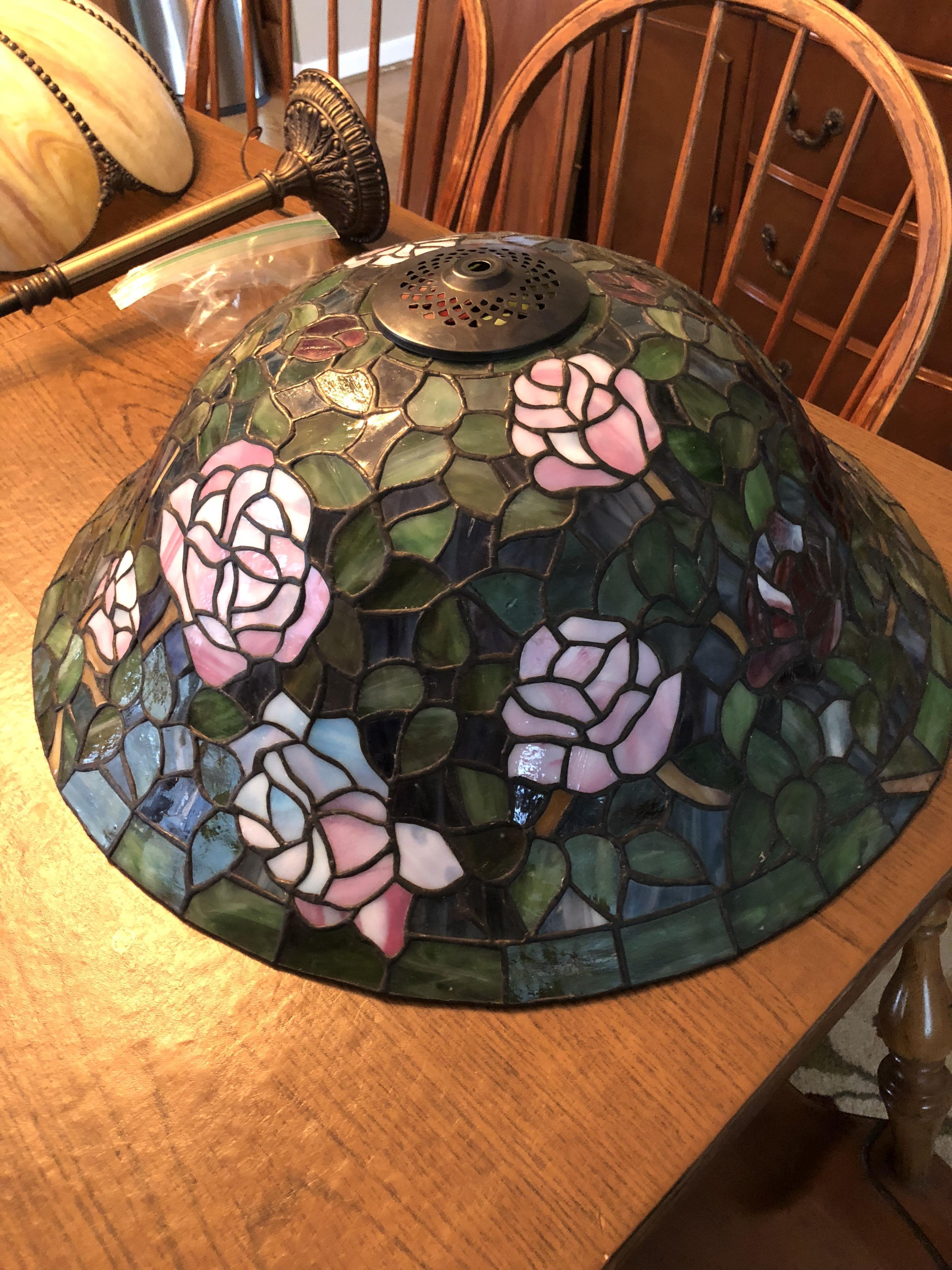 Meyda Tiffany Chandelier which looks to be a 20” diameter rose bush inverted pendant ceiling light. Unsure of when it was purchased, but