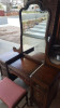 Don't know how much this set is worth but I do have some info for you....you set is not in original condition...it has been refinished...the drawer pulls are not original and neither is the cloth on top of the stool ,