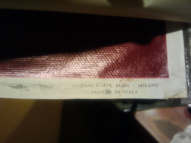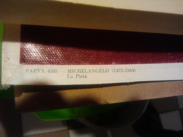 Michangelo La Pieta Photography on canvas. At the bottom of the canvas has Parva 4505 Michangelo (1475-1564) La Pieta and the right hand side it has Edizioni D'arte Alma printed in Italy. I have pictures. The canvas appeared to be cut out.