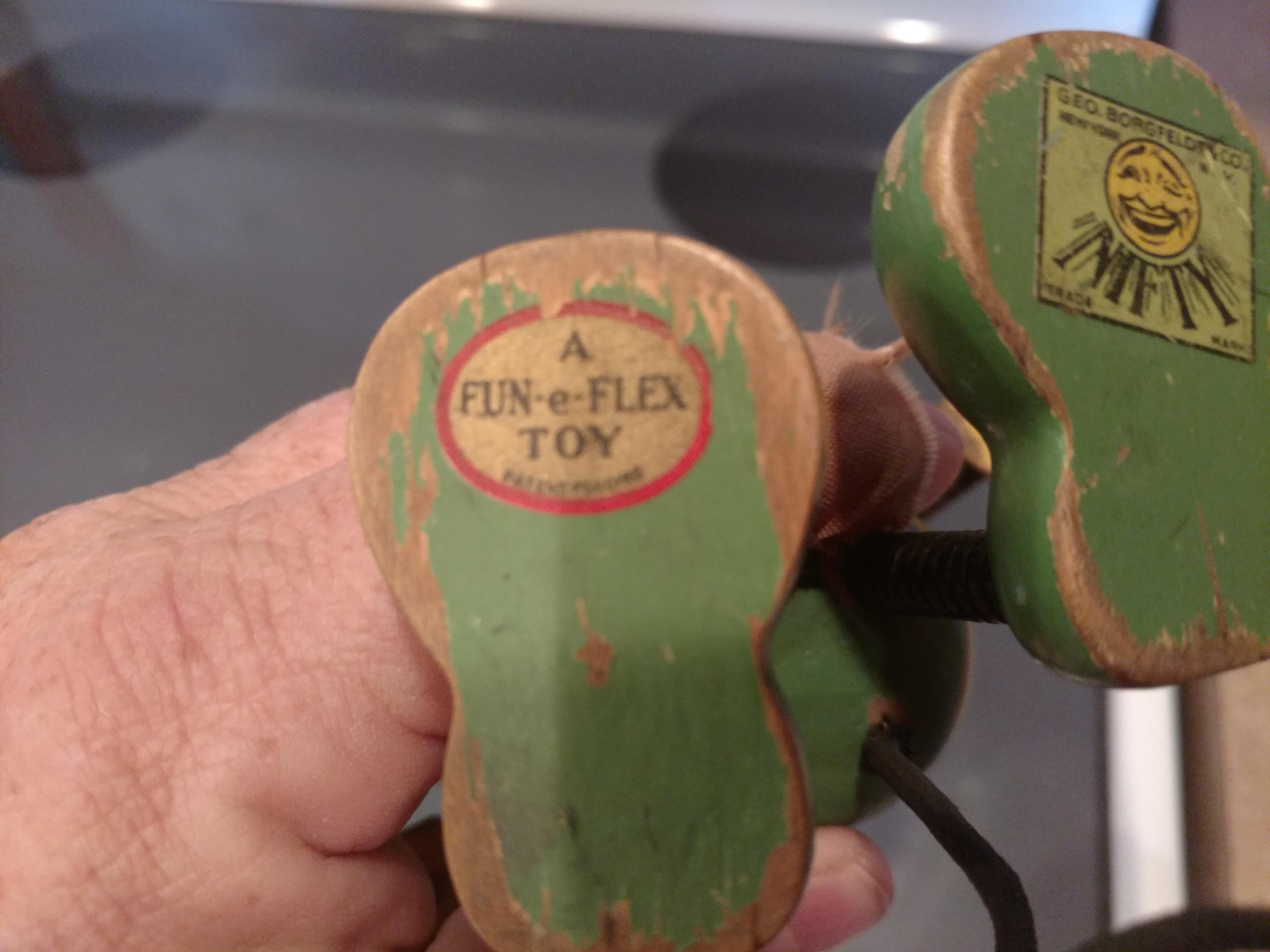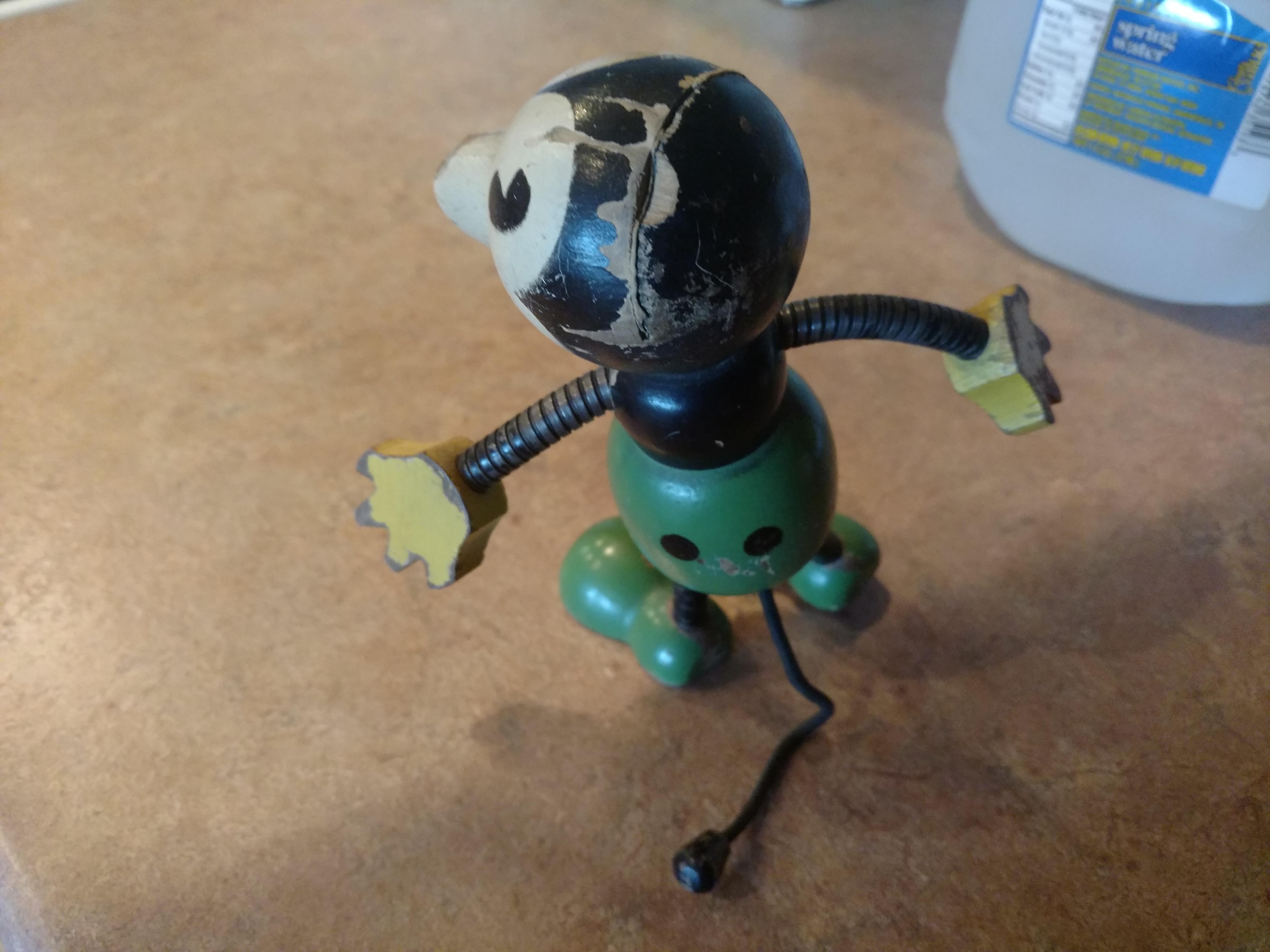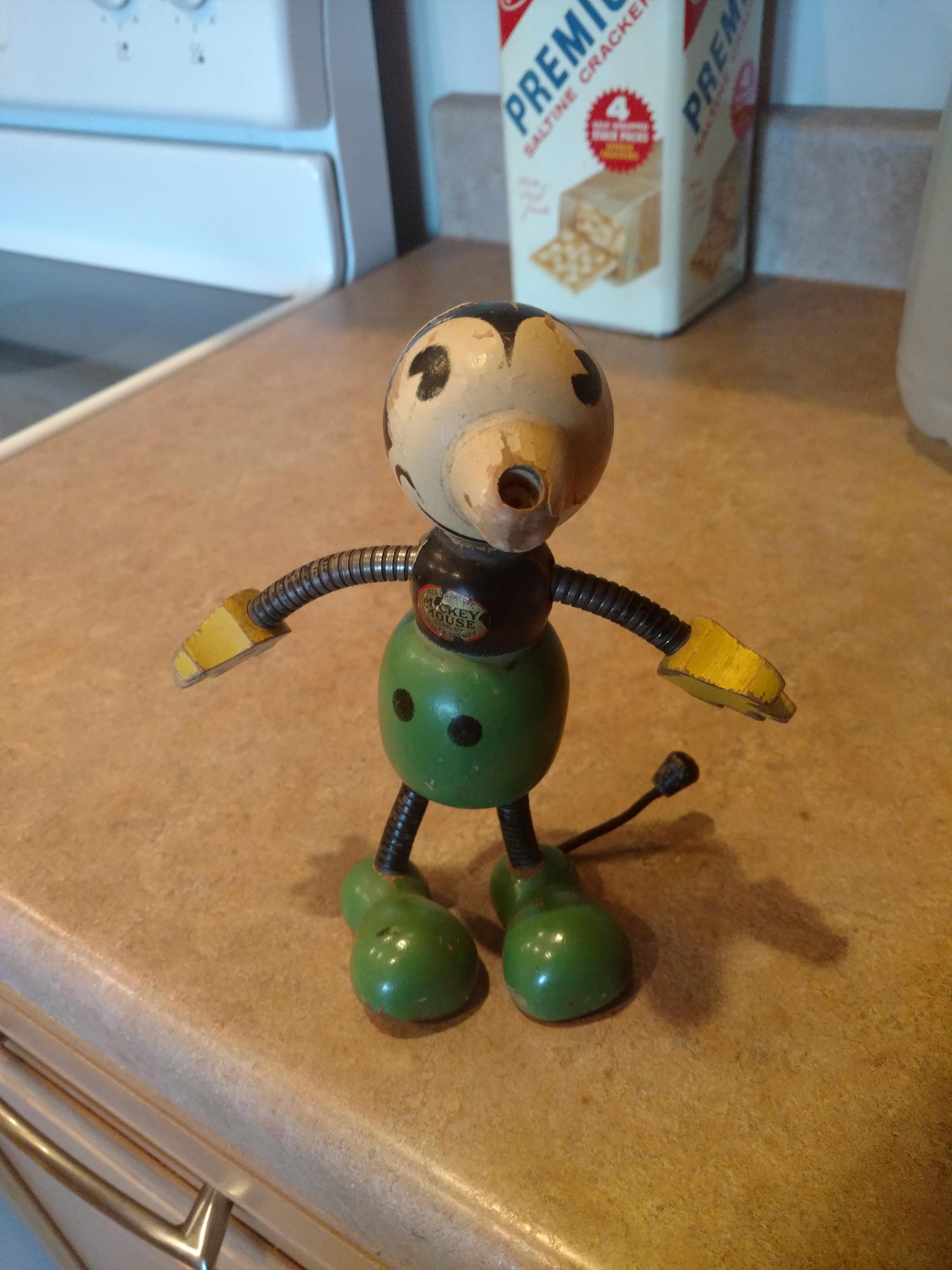 fun e flex mickey odd its green i can find a lot of the red ones id say 40-50$ in this condition if it was red think the green might be more rare 40-125 maybe if the green is rare as i suspect it might be 200-400 if near mint.. scarce in the green. on sold at a really large toy auction near mint for almost 450$ . . good find tough color . this is the taller size. the range is kinda wide because the condition of the foot decal is in such great condition and the mickey decal is pretty nice also. the missing nose hurts.