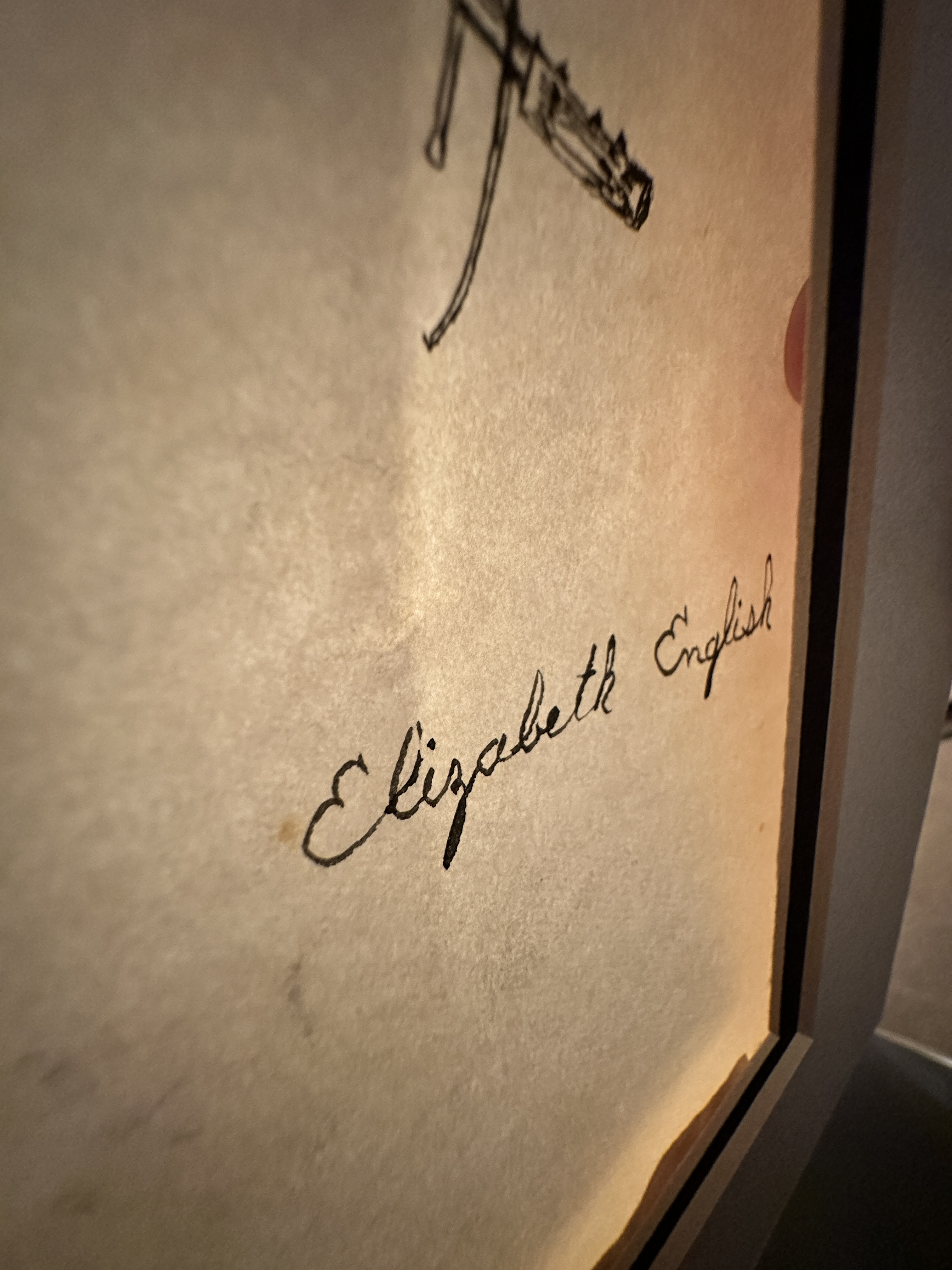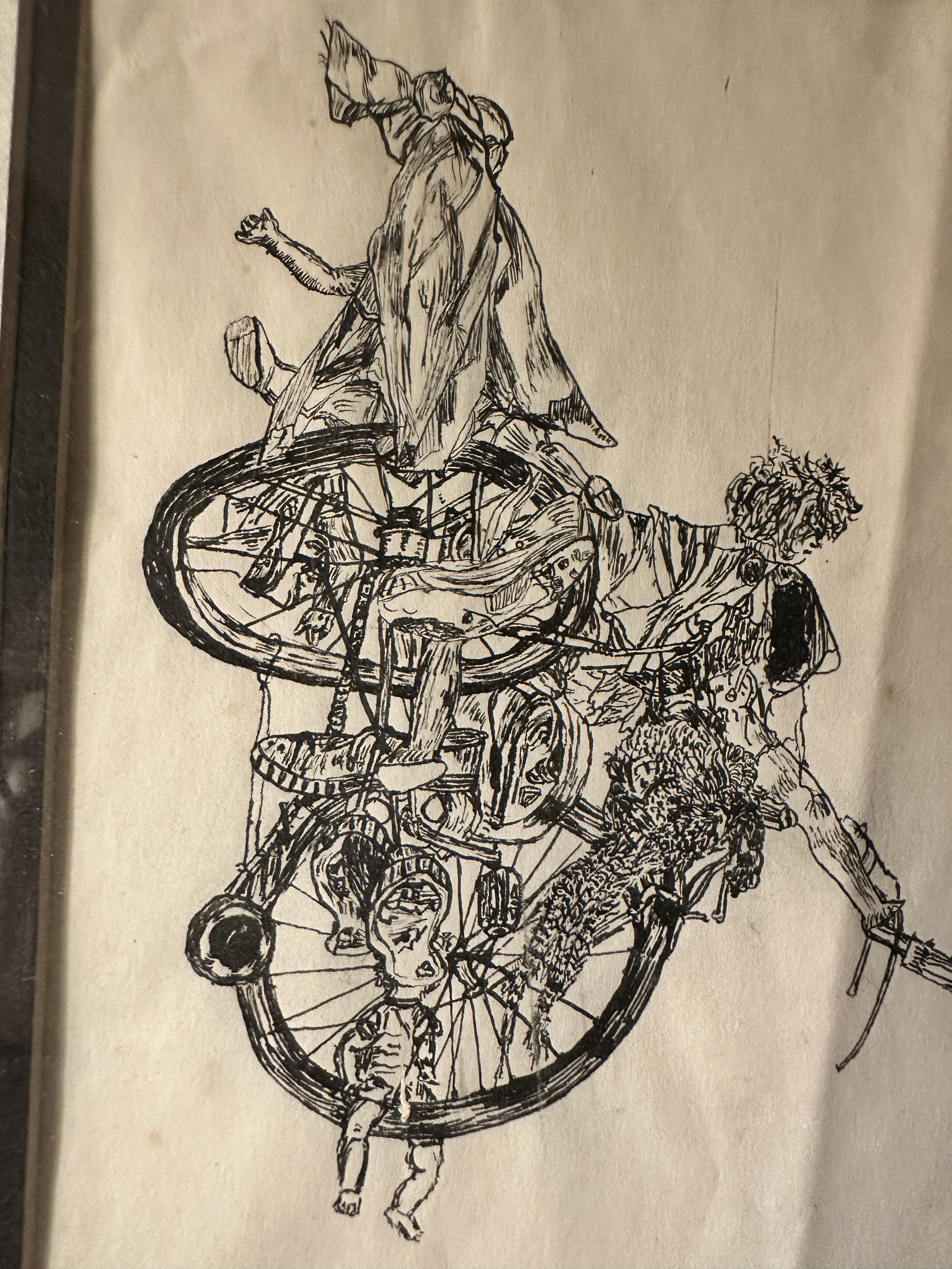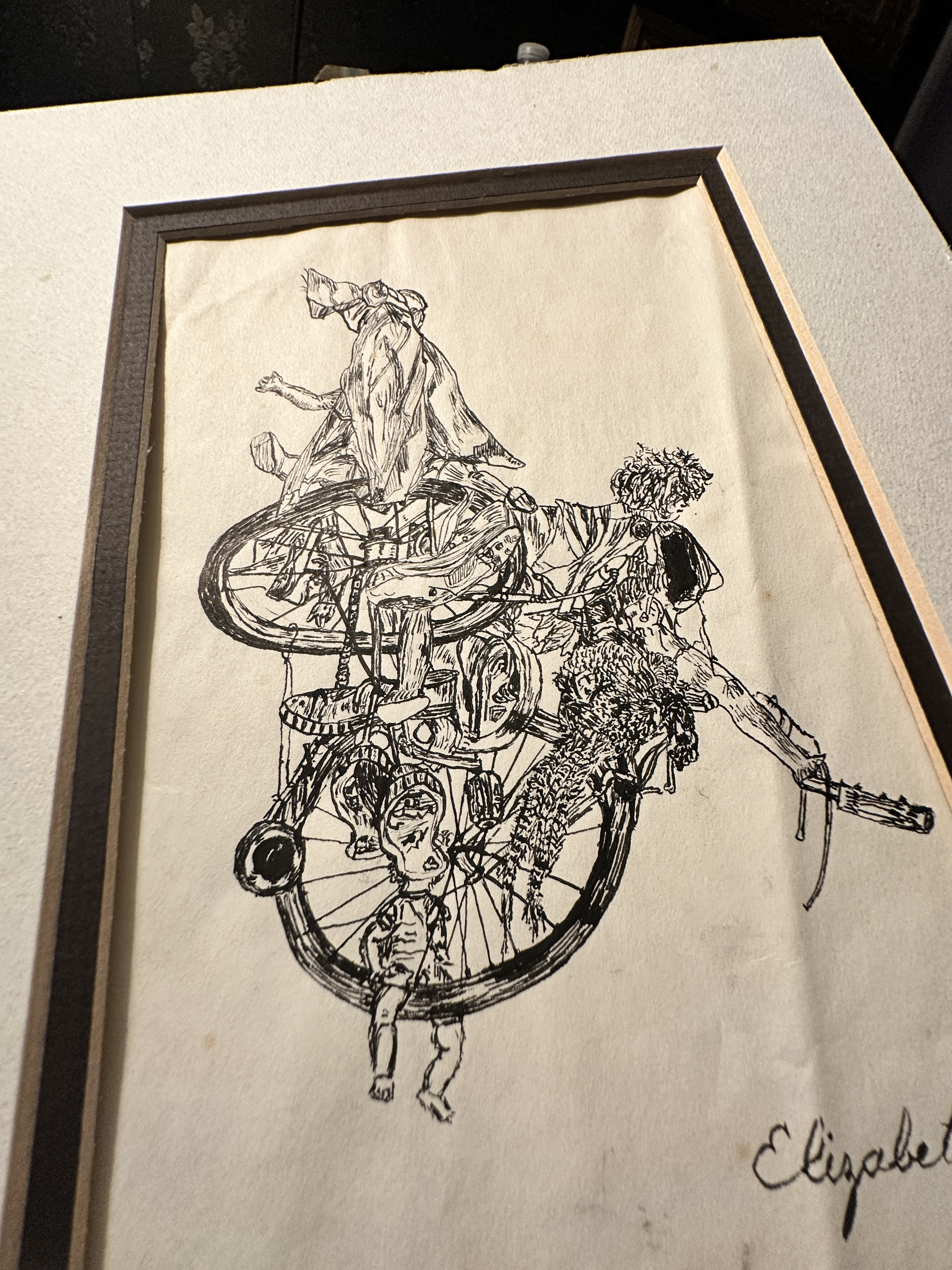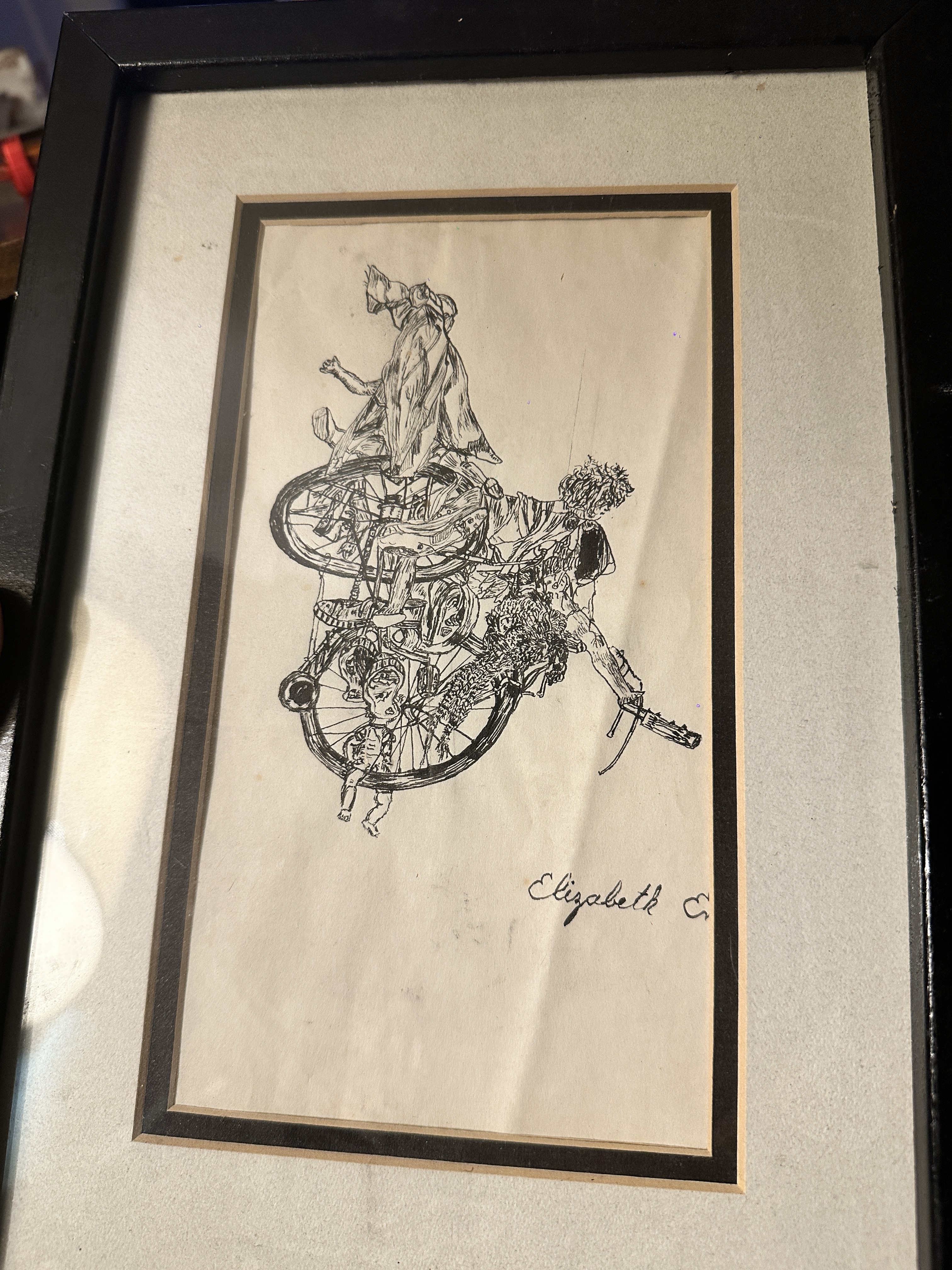 Item Description: This is an original pen-and-ink drawing signed by "Elizabeth English," likely created between 1950 and 1970. The artwork features surreal, figurative imagery with human forms entangled in a mechanical structure, reminiscent of post-war existential drawing traditions.