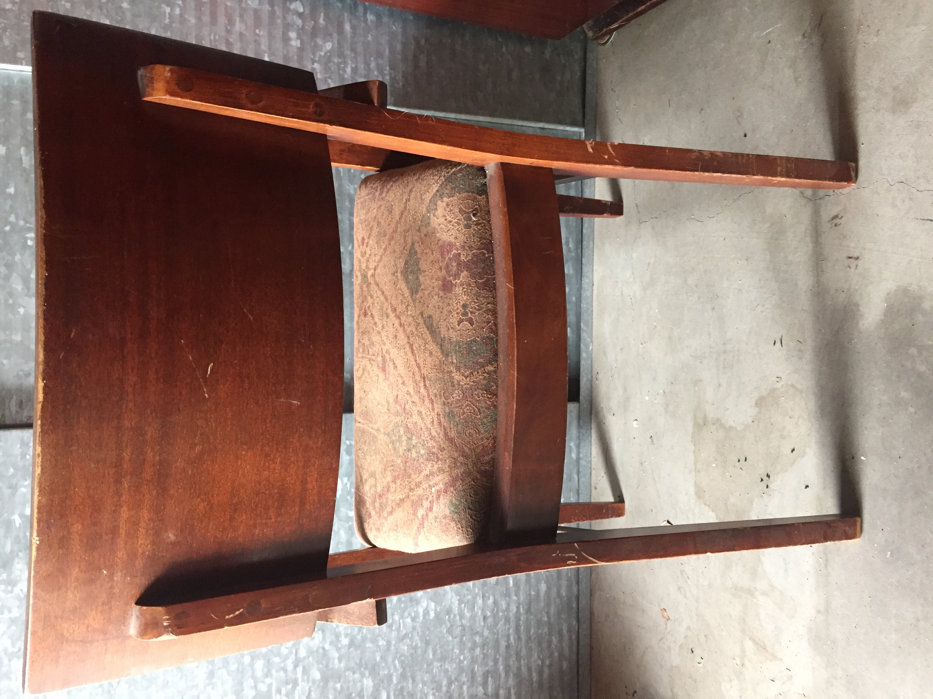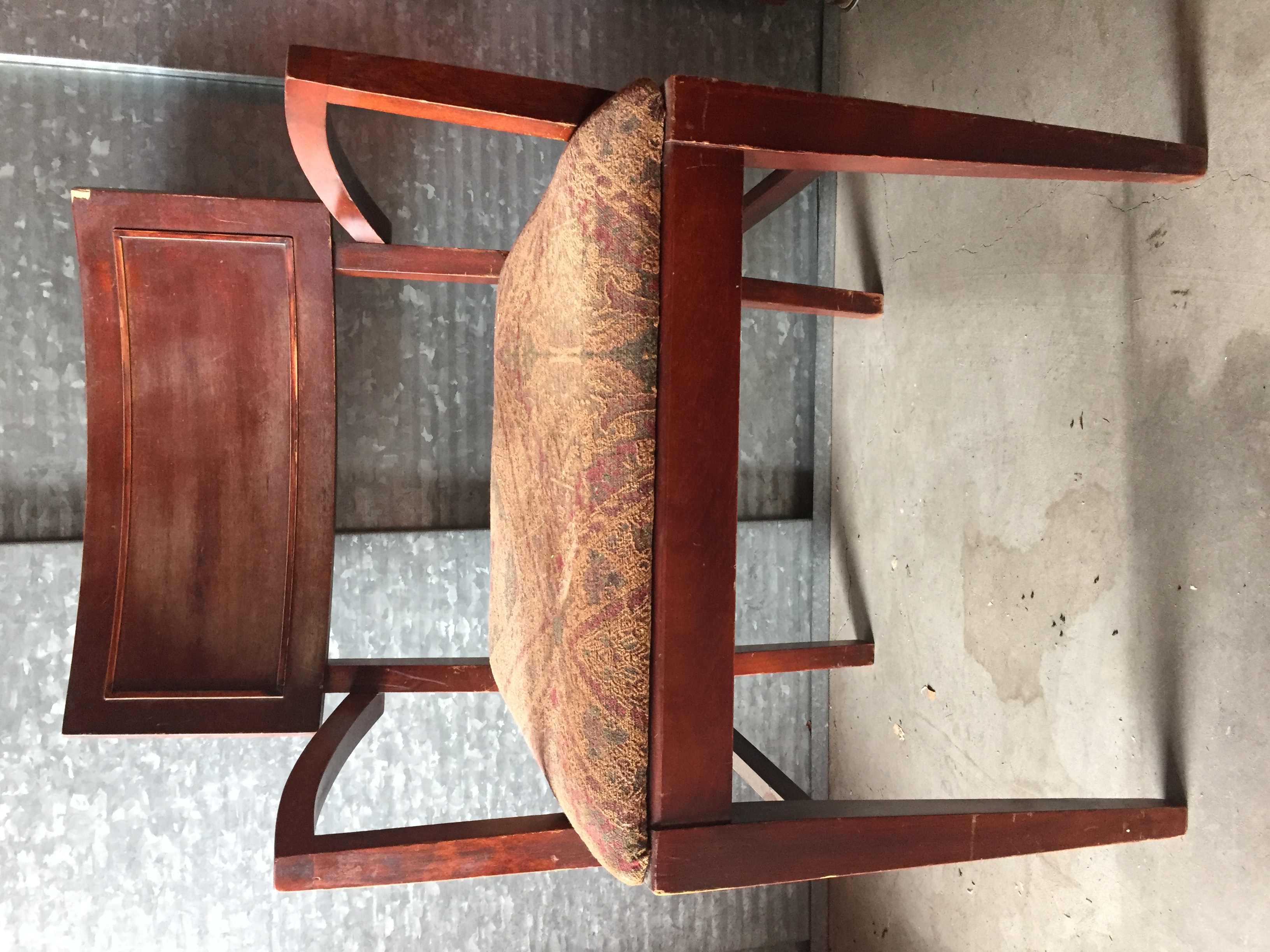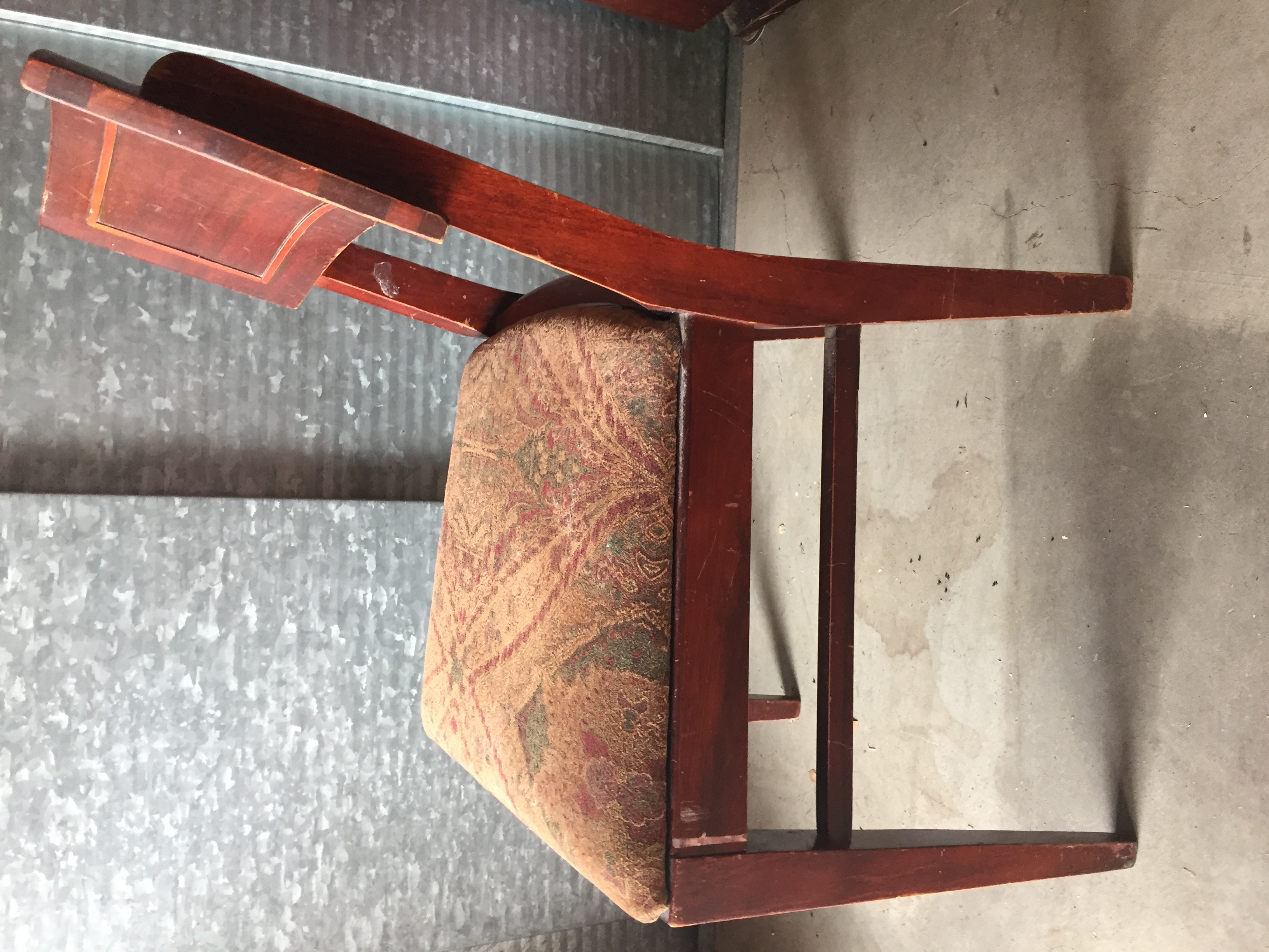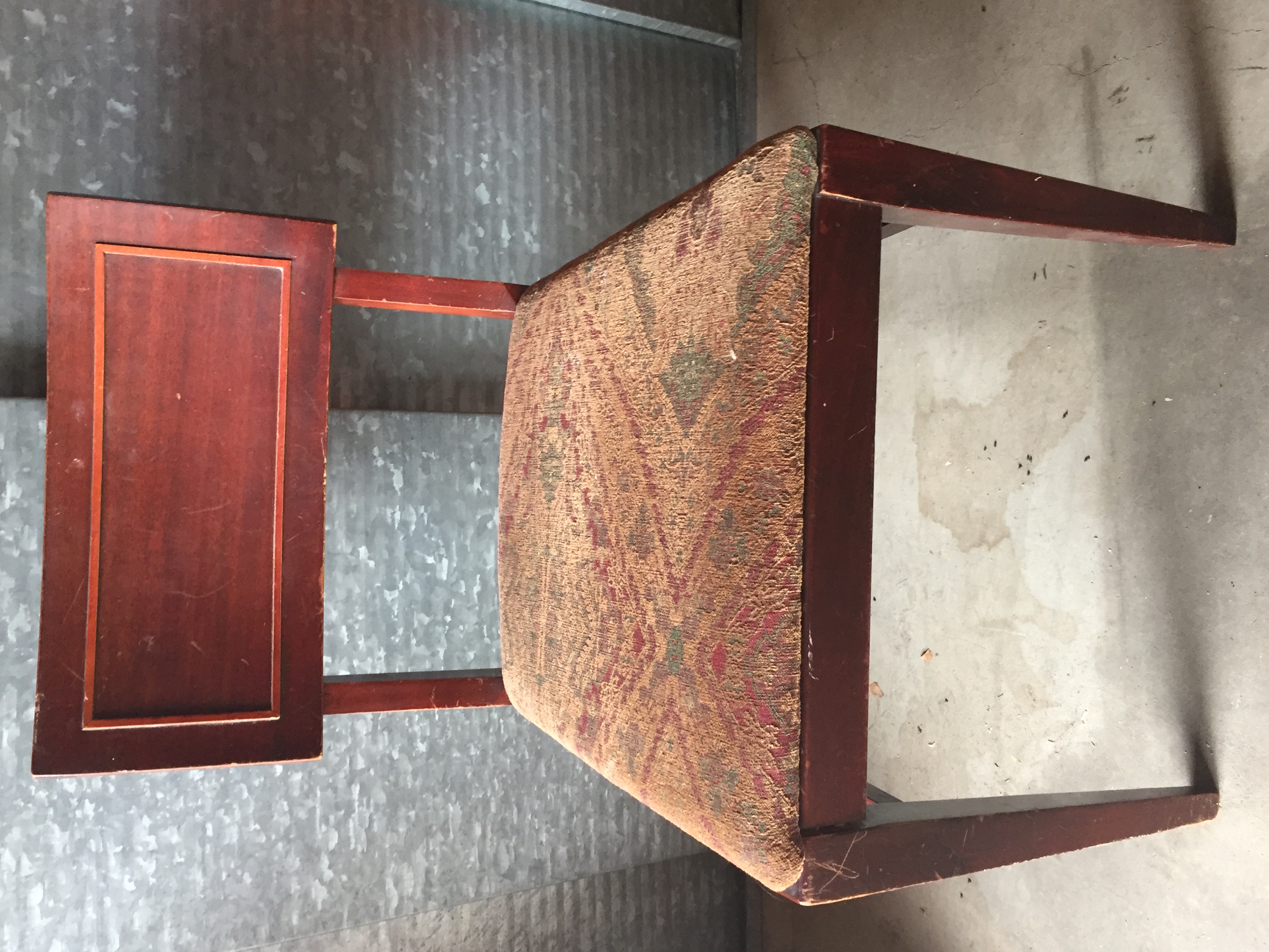 The suite was purchased by my grandparents in the mid-to-late 1960s. I believe it is red mahogany (per a family member) or a cherry-glazed wood with inlay. This suite was used almost daily, and it shows. I’ve included pictures of three of the chairs that have the most wear.