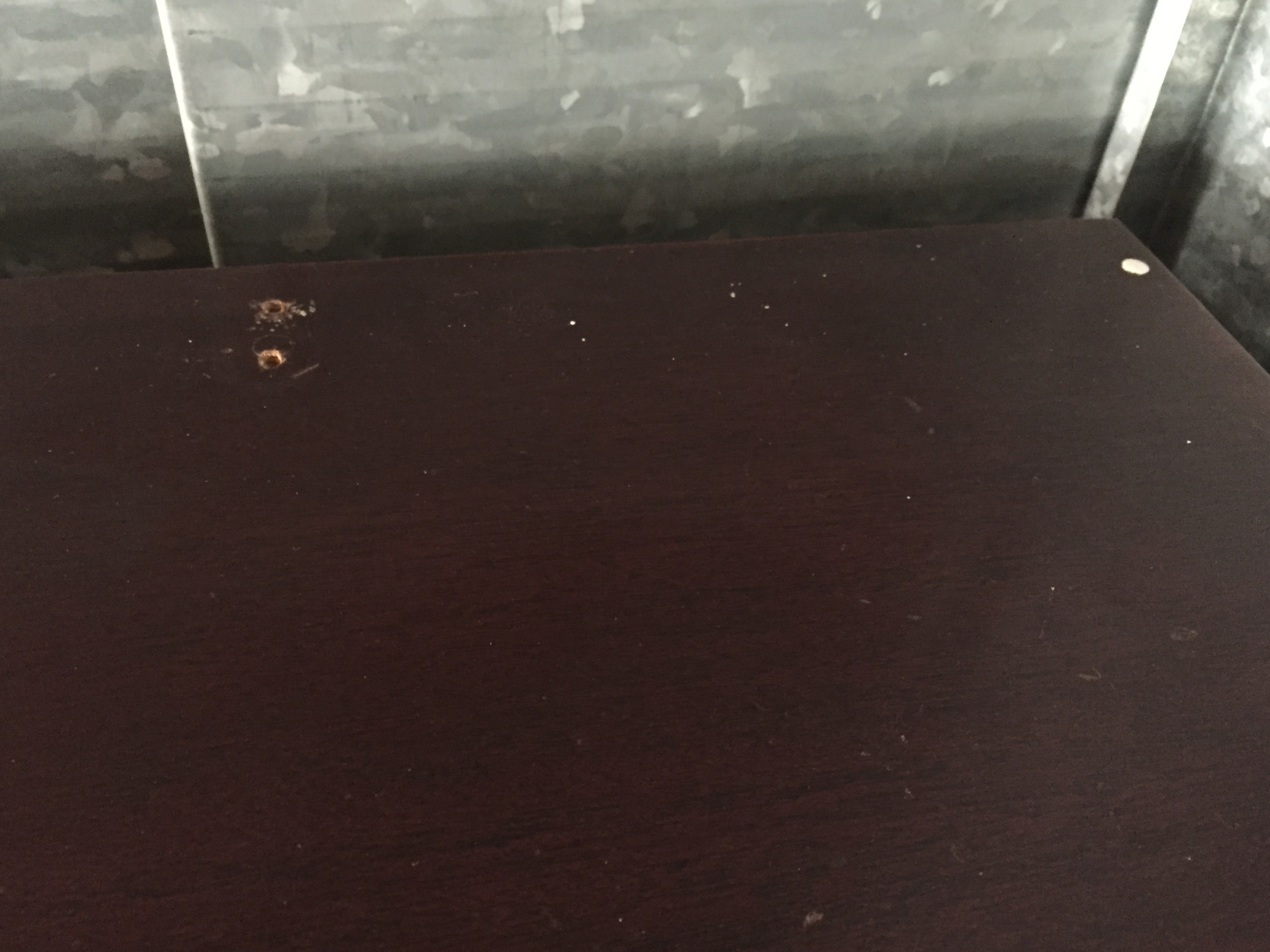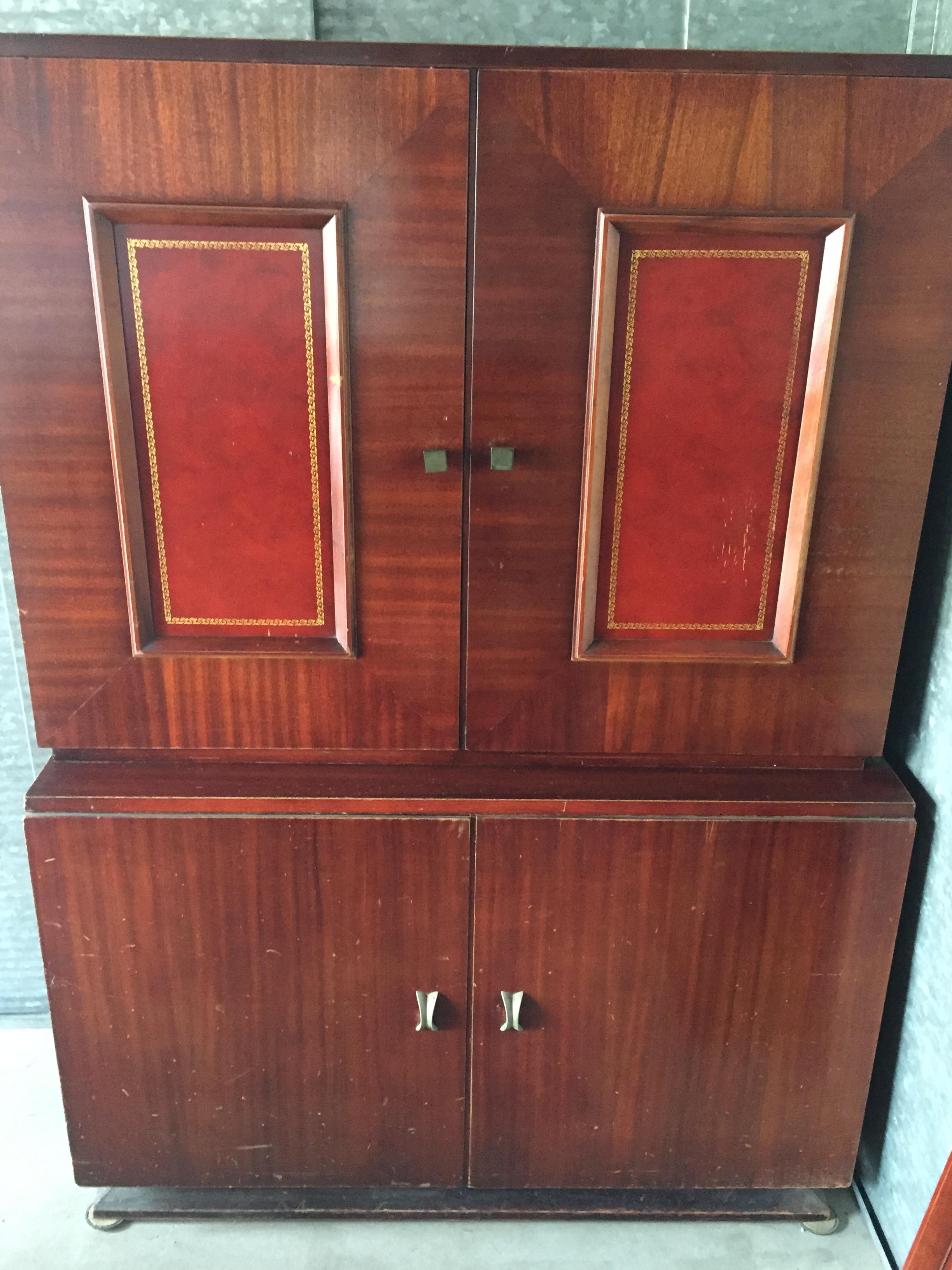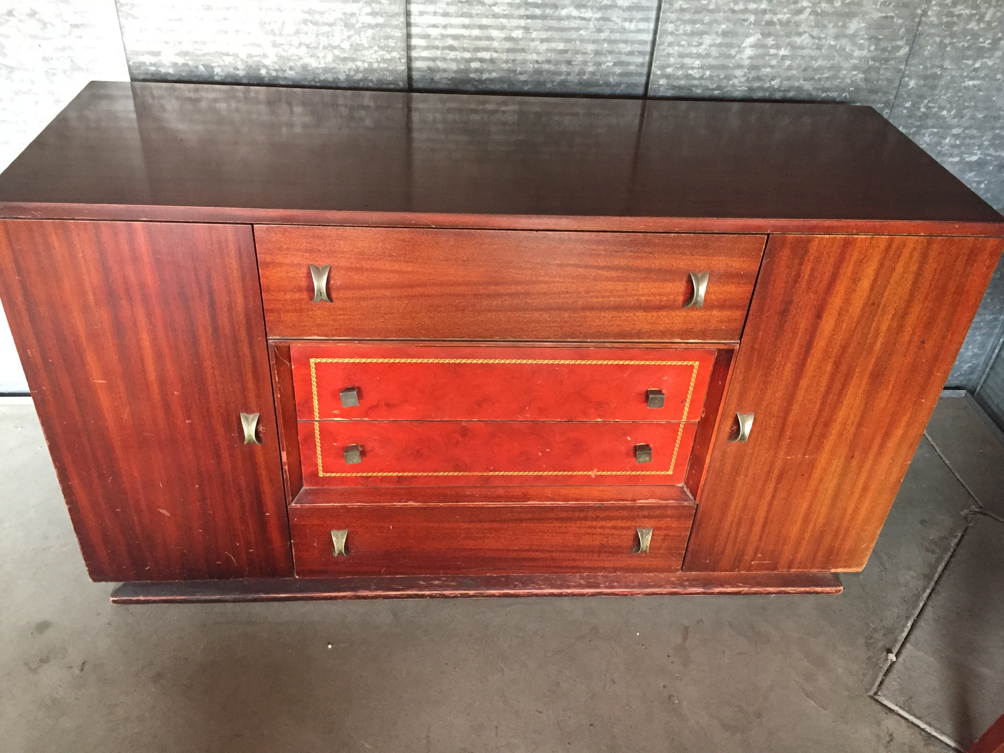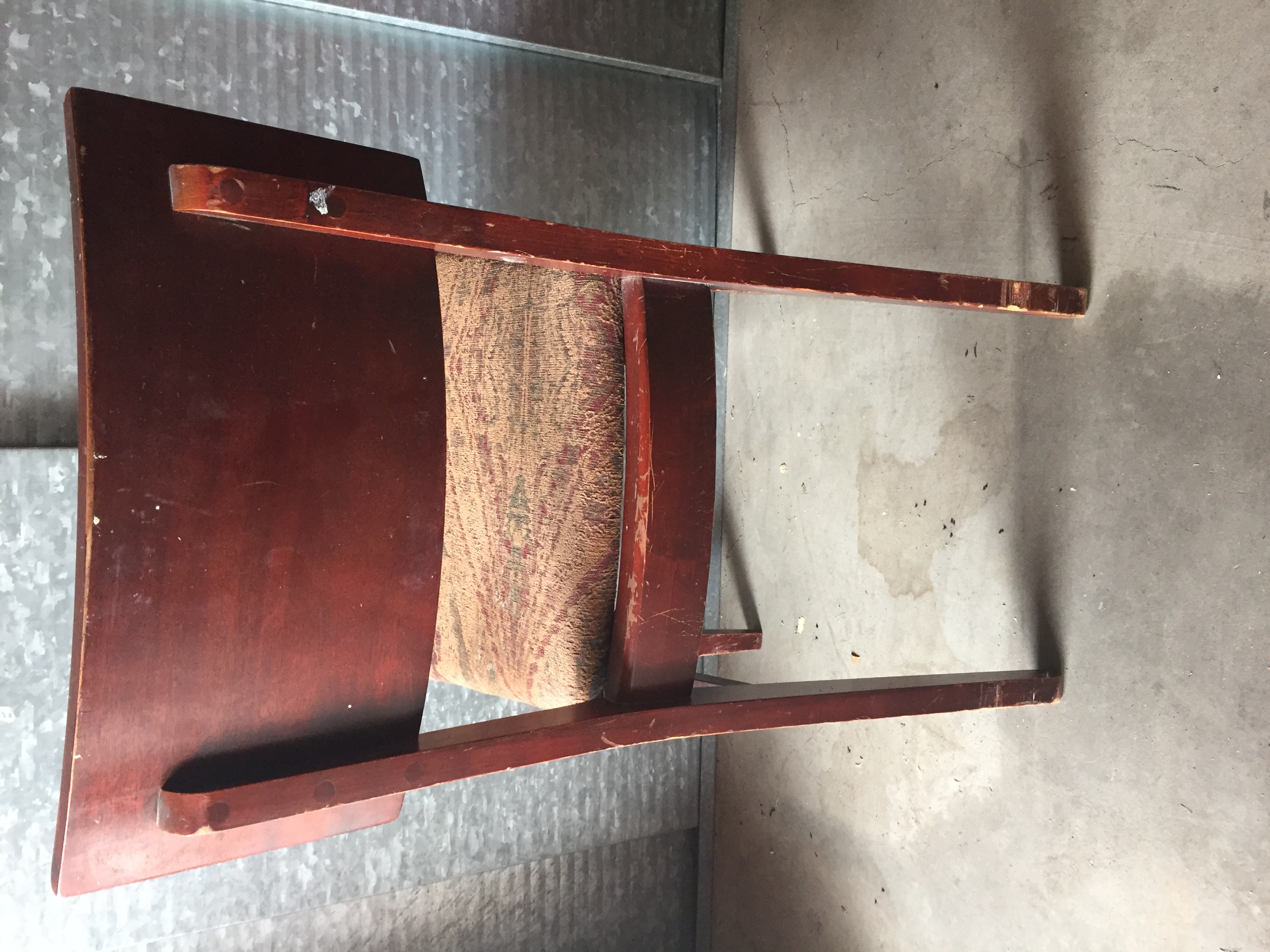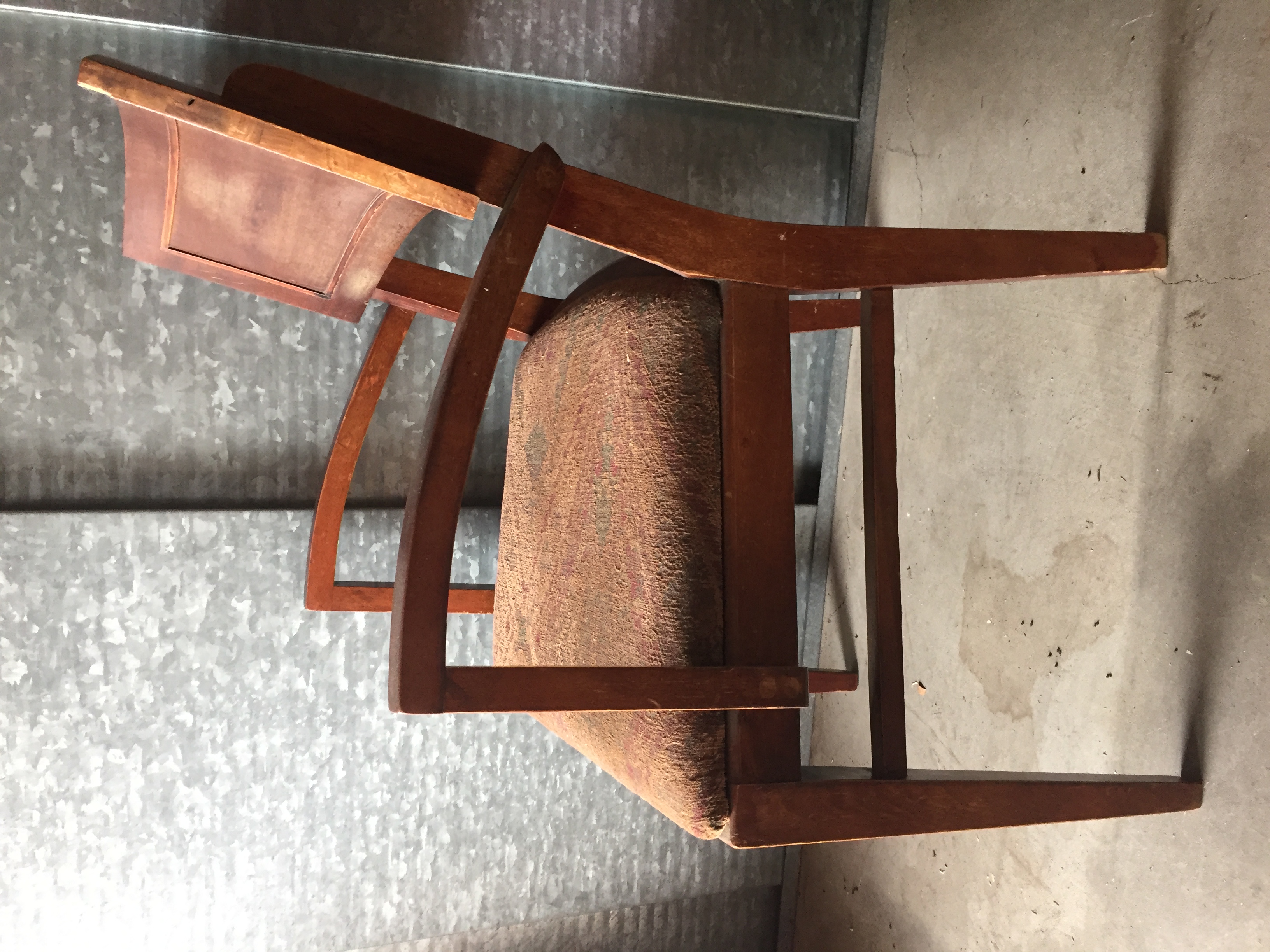 The suite was purchased by my grandparents in the mid-to-late 1960s. I believe it is red mahogany (per a family member) or a cherry-glazed wood with inlay. This suite was used almost daily, and it shows. I’ve included pictures of three of the chairs that have the most wear.
