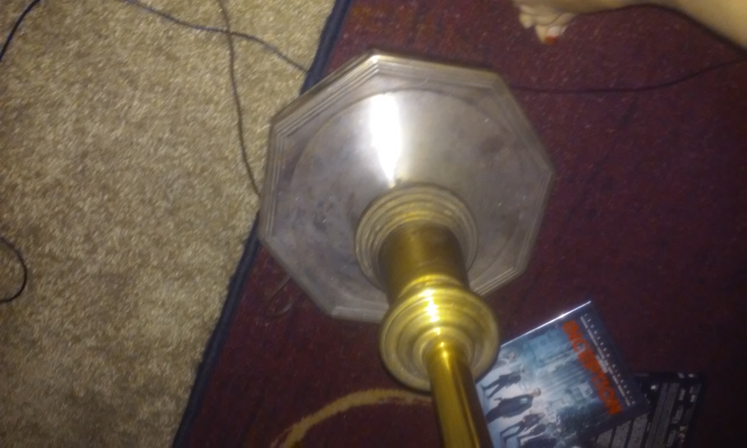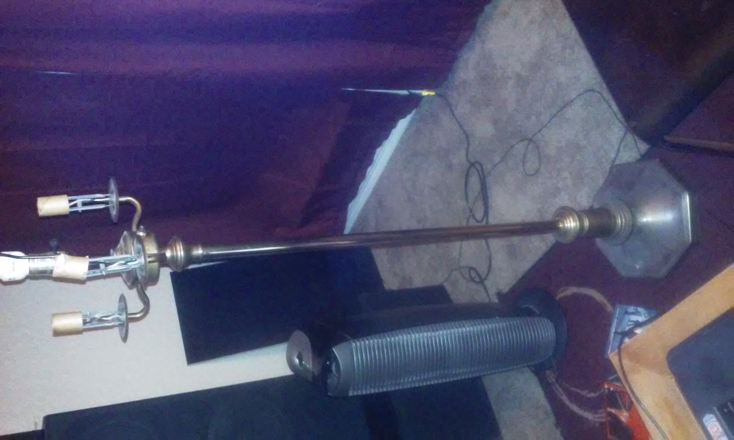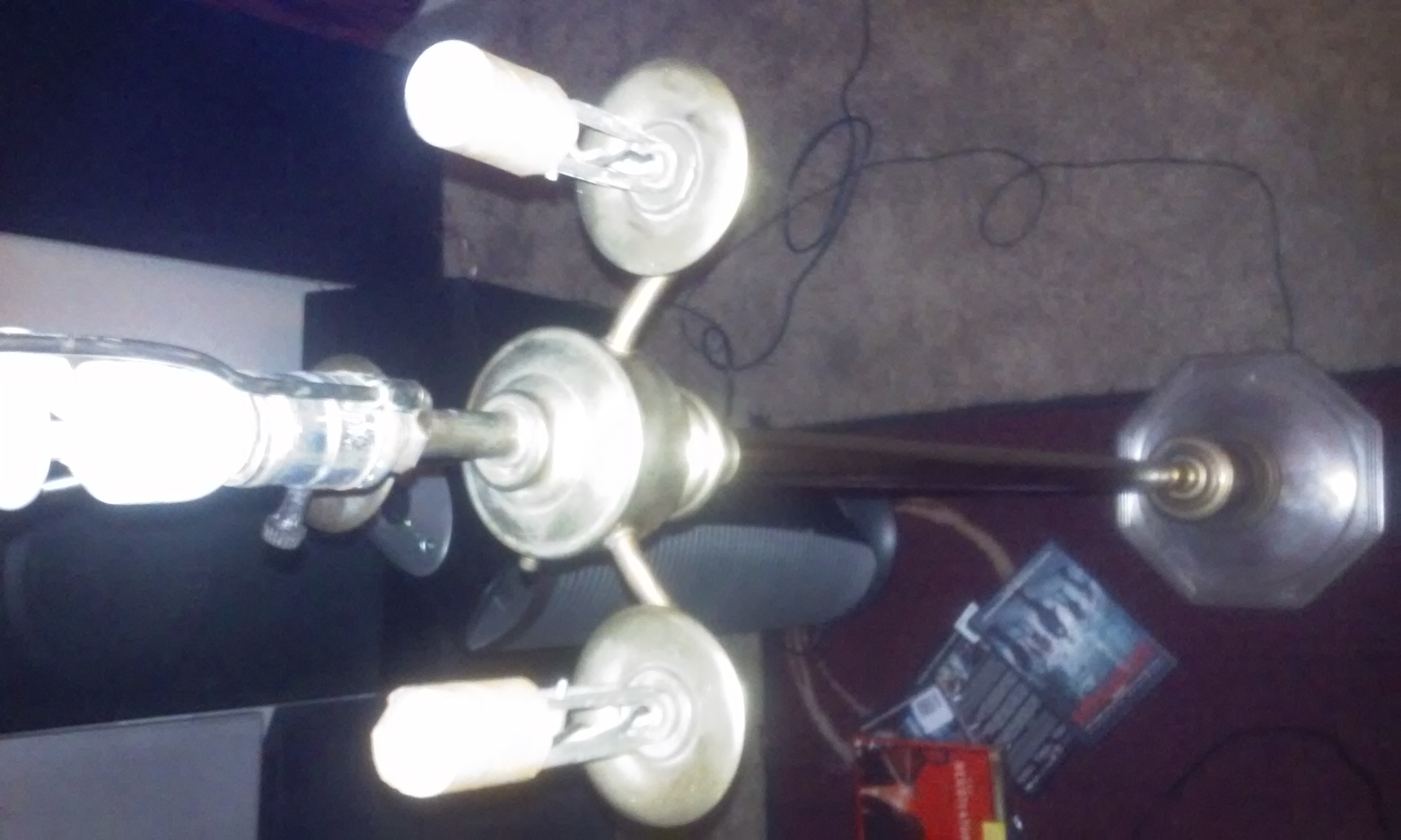 It looks as if the center pole on this lamp has been replaced. And it also looks like the middle fixture may be older than the lamp itself (the internet says the socket alone is probably 1960's going into 70's. Very plain complared to other lamps of its kind and era. The arms to bottom 3 lights are just slightly curved and the lamp body has no texture or ornate patterns. Has an octogon shaped base with same lack of detail, which if I had to guess was sue to the slab of marble that likely was there. Probably broken or removed.