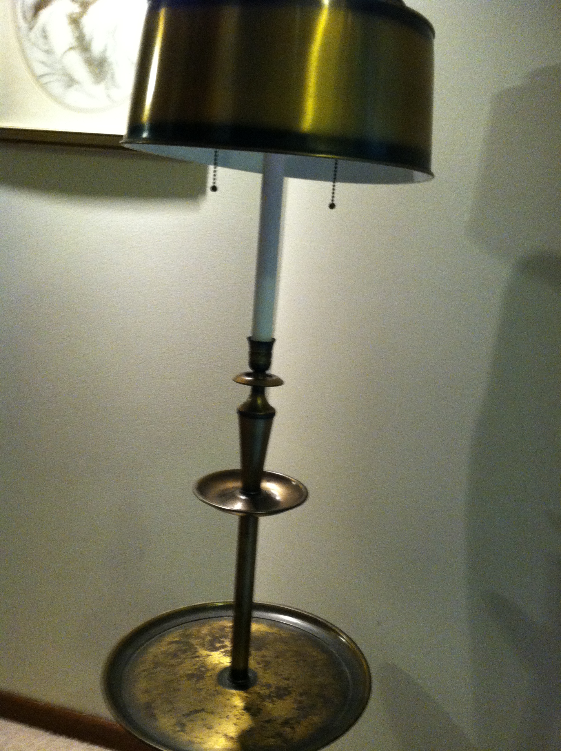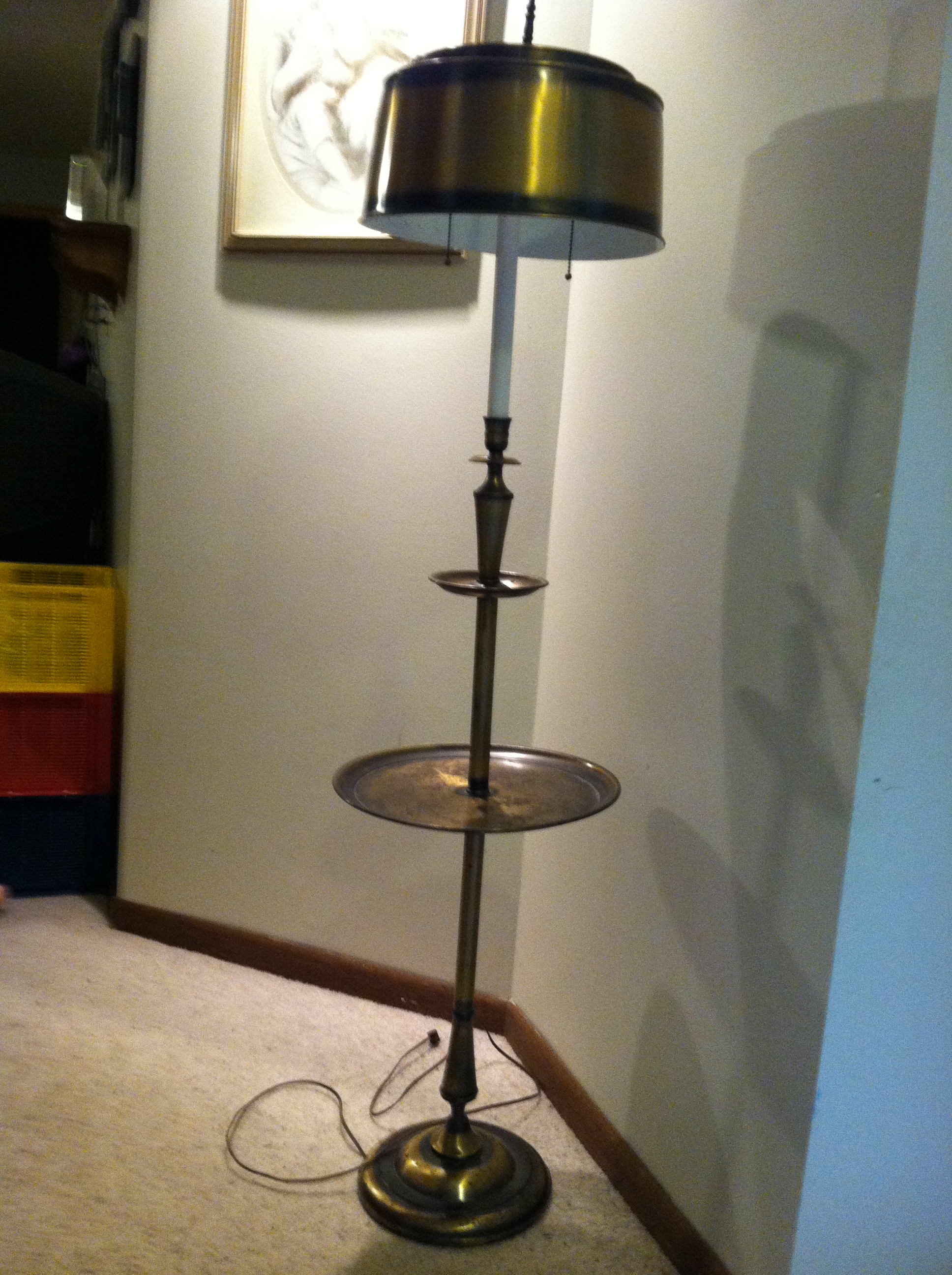 Trying to find out the value of an all metal floor lamp. The stamp on the bottom states, Underwriters Laboratiories Inc. Portable Lamp Issue No. B-3919 E-20773. It holds two bulbs, works. All original. Lamp shade is metal with two little tables that circle the lamp pole.
