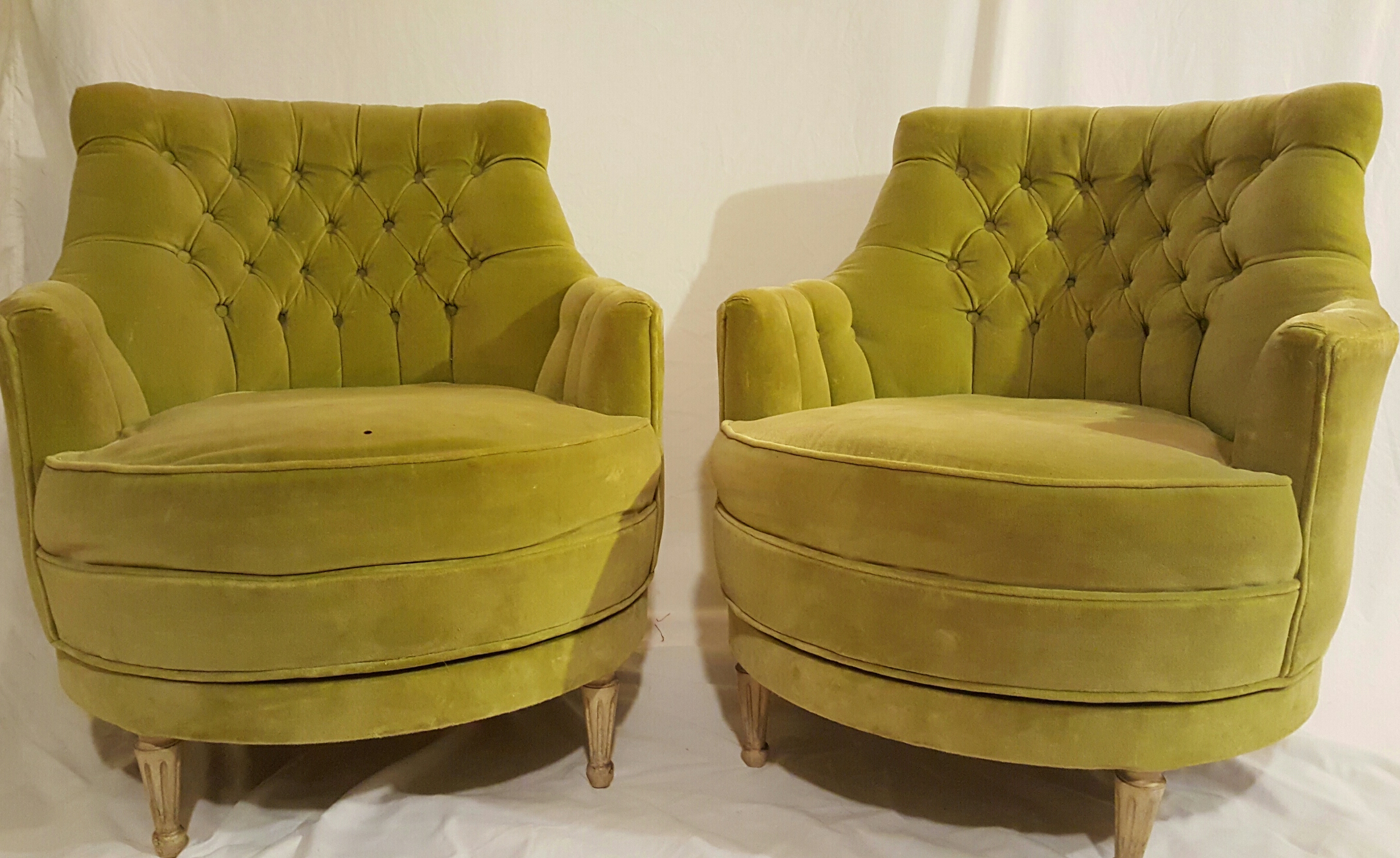 Custom made swivel base barrell back arm chairs circa 1958. Near pristine condition having only normal wear on them. They were kept covered in plastic since the day they were delivered.