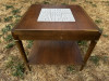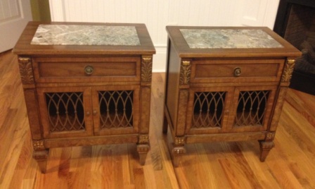 Mid-century nightstands from the Lauria collection by Kent coffey. Made from cherry and pecan woods, with a solid marble inlay top.
