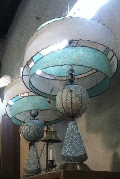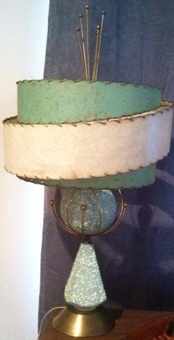 Turquoise 'spatter' ceramic table lamps.  Three tiered shades with a 'swirl' pattern.  Shades are fiberglass with gold stars in the white shade.