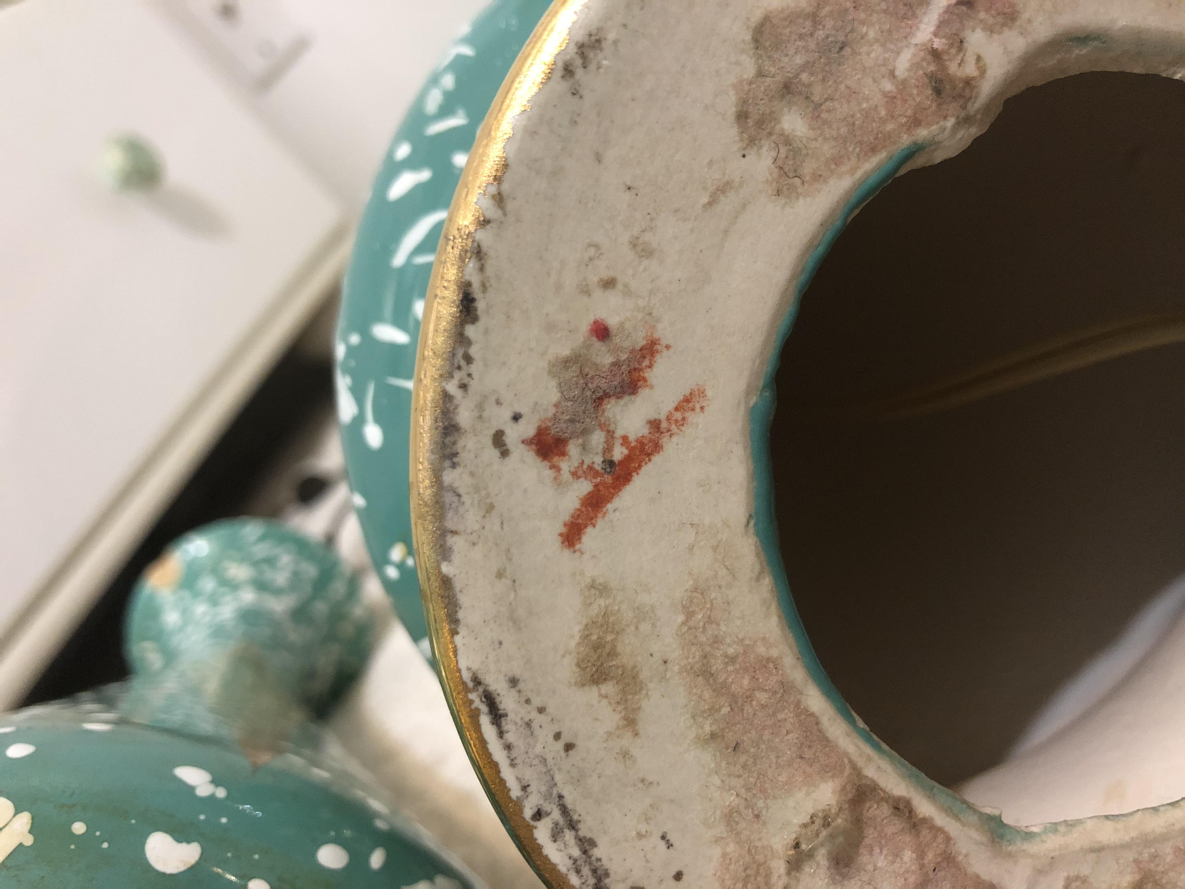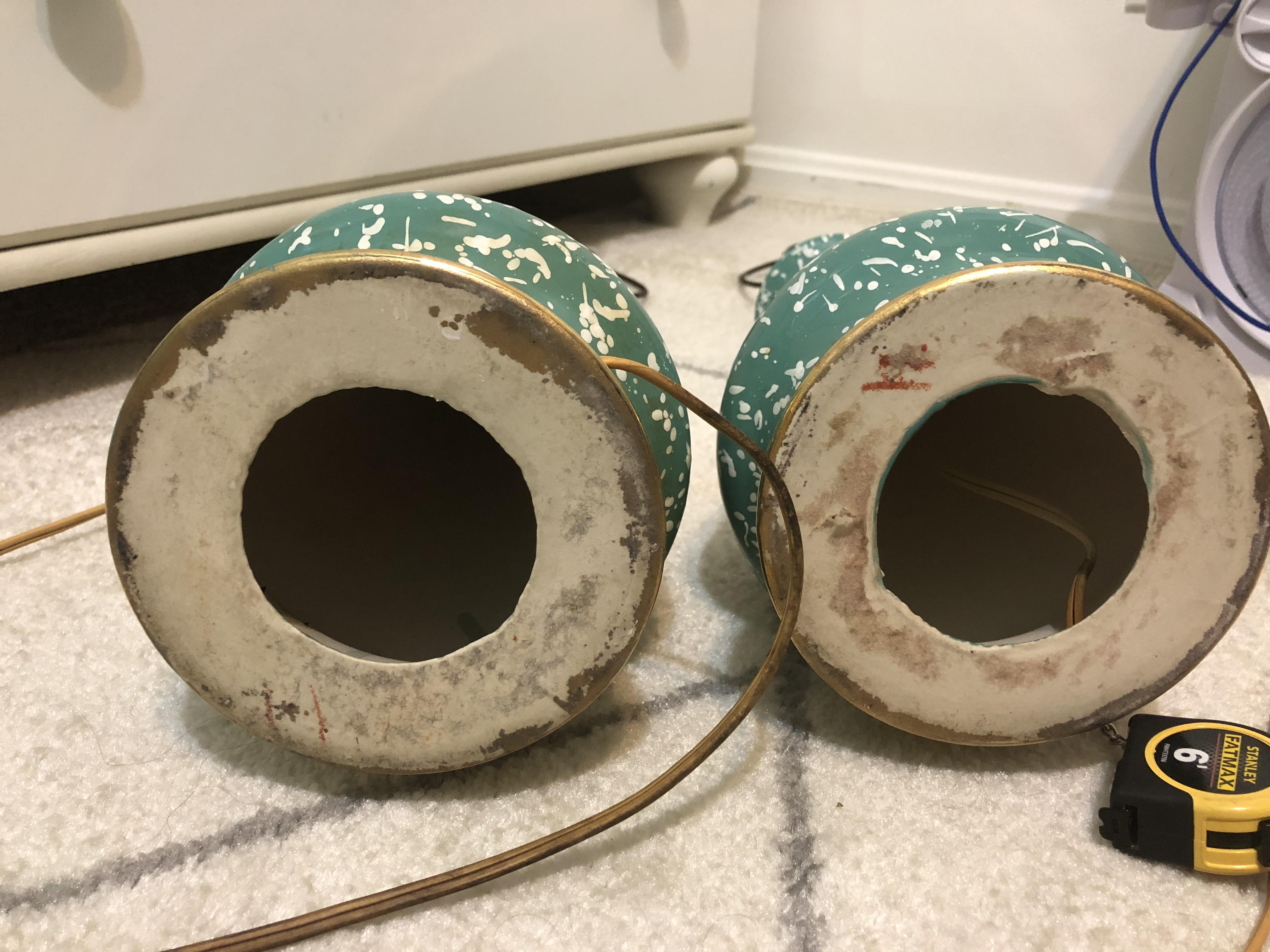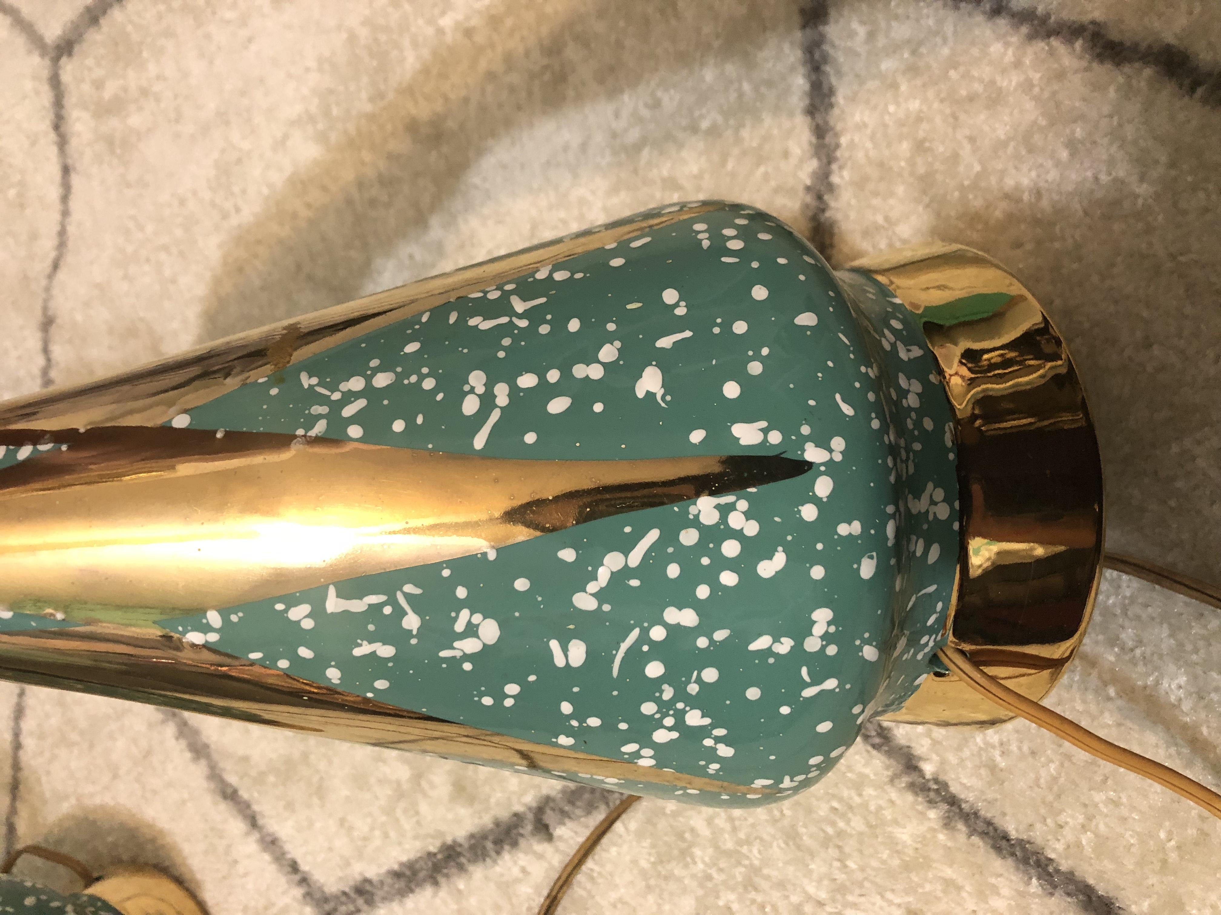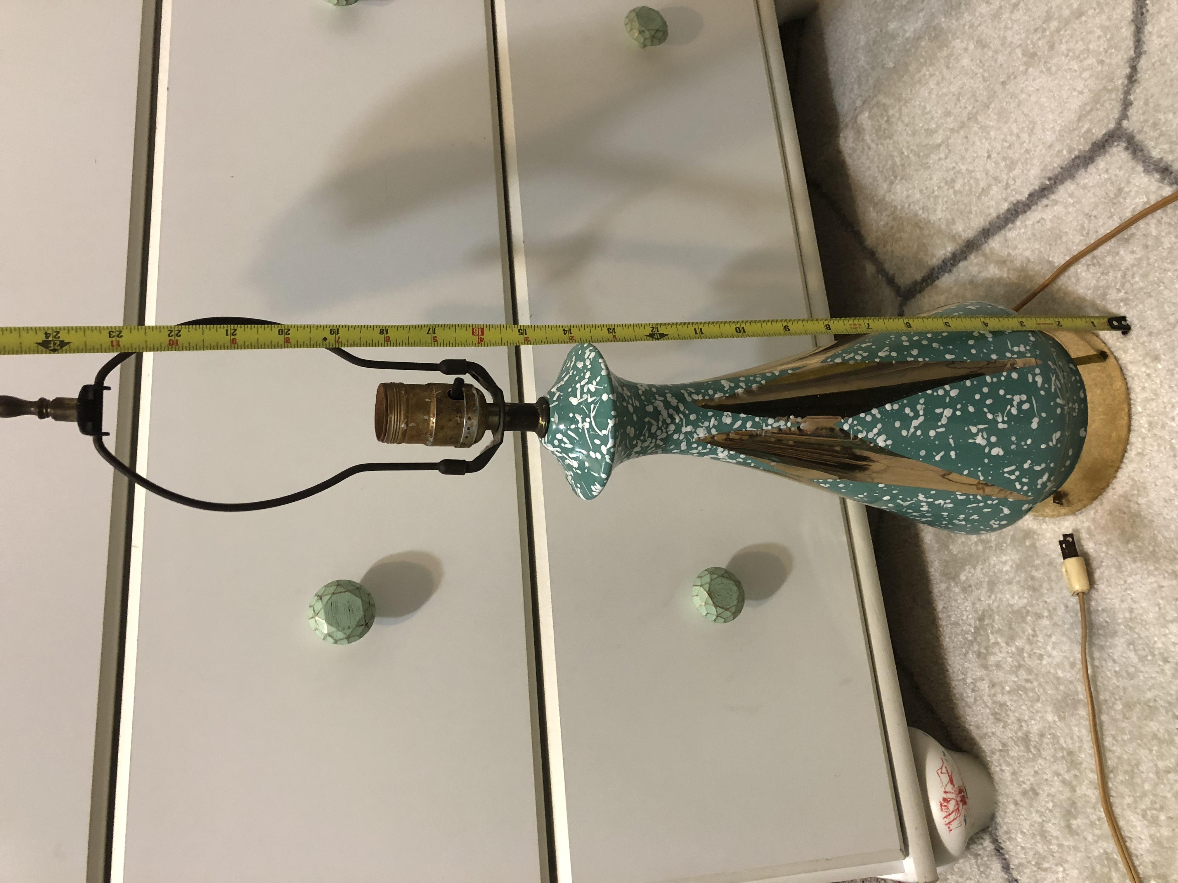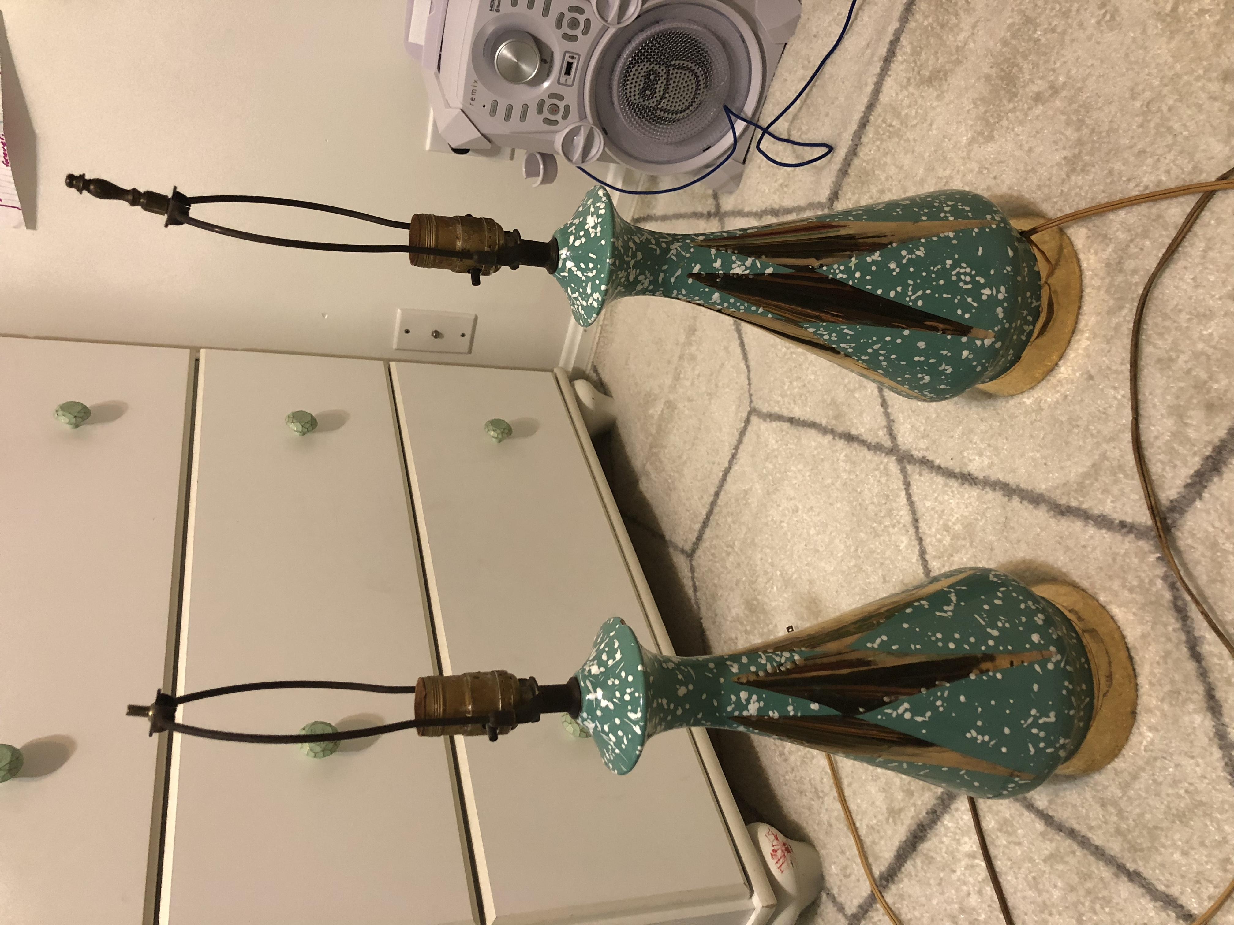 Pair of lamps that both work & have original wiring/plugs that belonged to my husbands great grandmother. She is no longer living so I have no one to ask any questions regarding these cool looking lamps. They are in pretty decent shape but one finial is missing unfortunately. There’s no labels on the base but the inside is hollow and I can see they are made or ceramic and the light switches do say LEVITON. Is that the brand of the whole lamp or just the electrical part? I’m clueless. There were no shades on them. I’ve tried searching the internet for similar lamps and no luck so any help is appreciated. I don’t really have room in my house for both, & since they are a unique, mid century look, that people are willing to pay a lot for now a days, I thought I should look into it. Mostly, just curiousness. I know it’s no Tiffany lamp. I’d like to keep one if I can convince my daughter, and find a shade since it matches her room perfect.