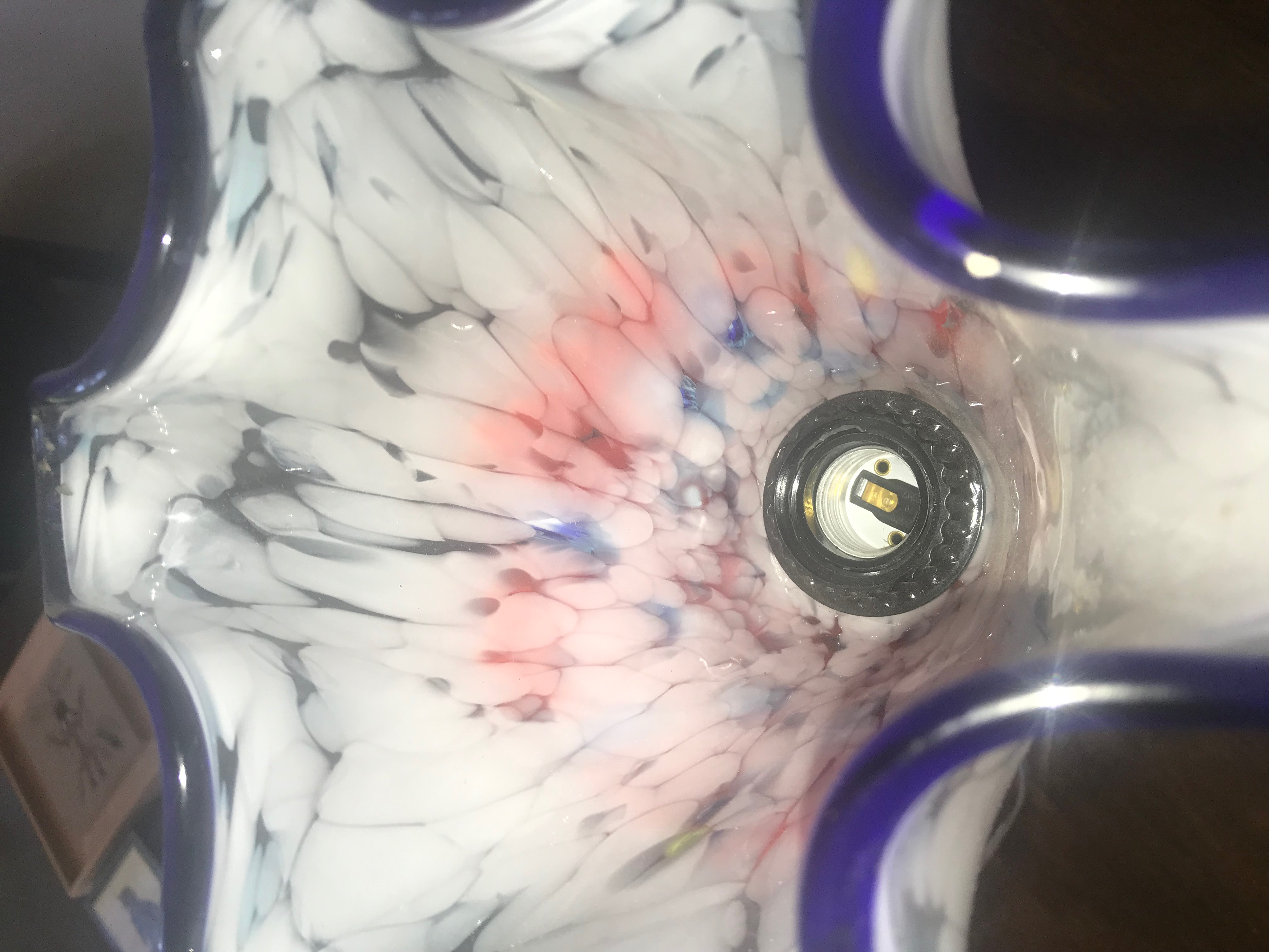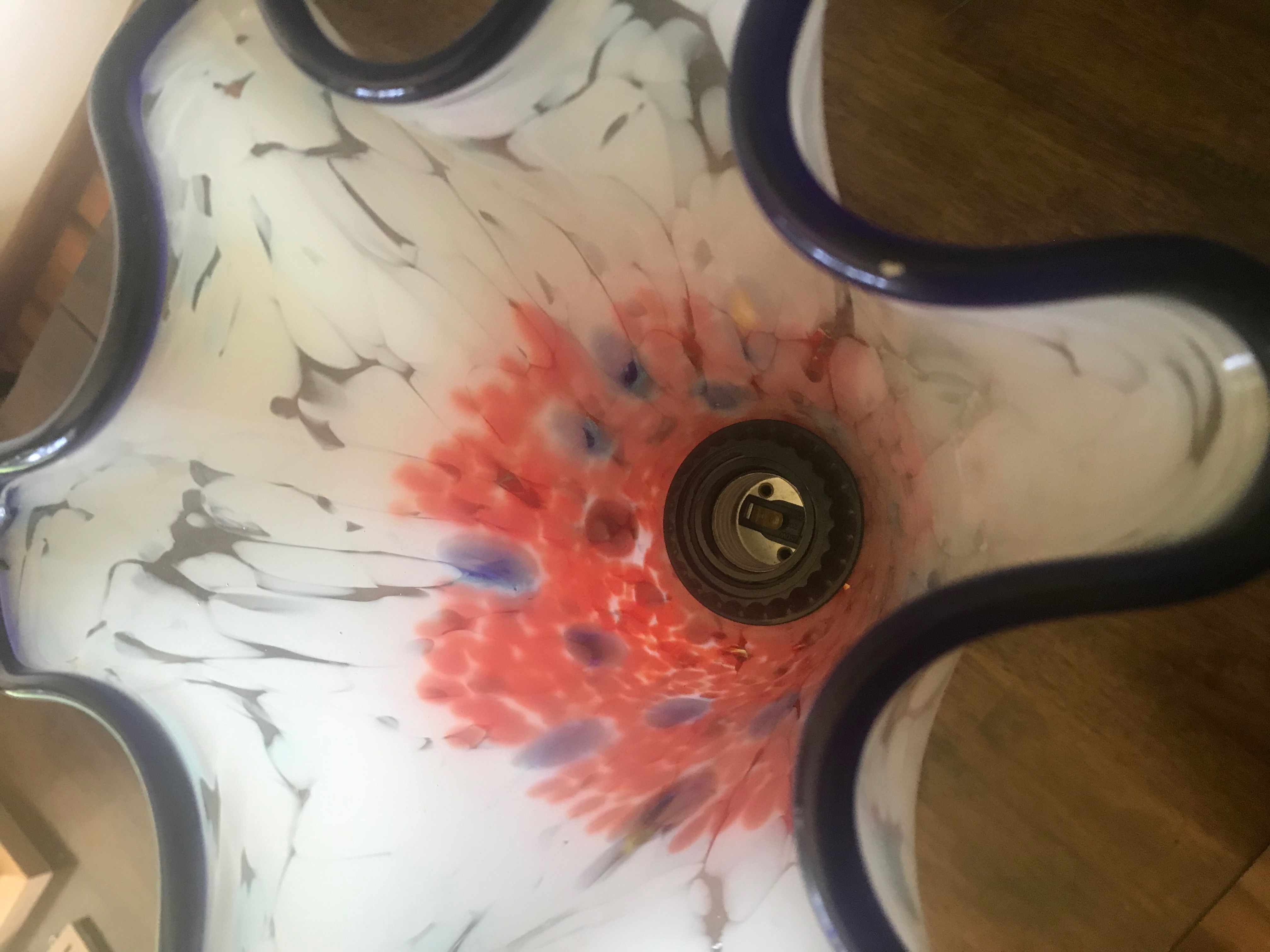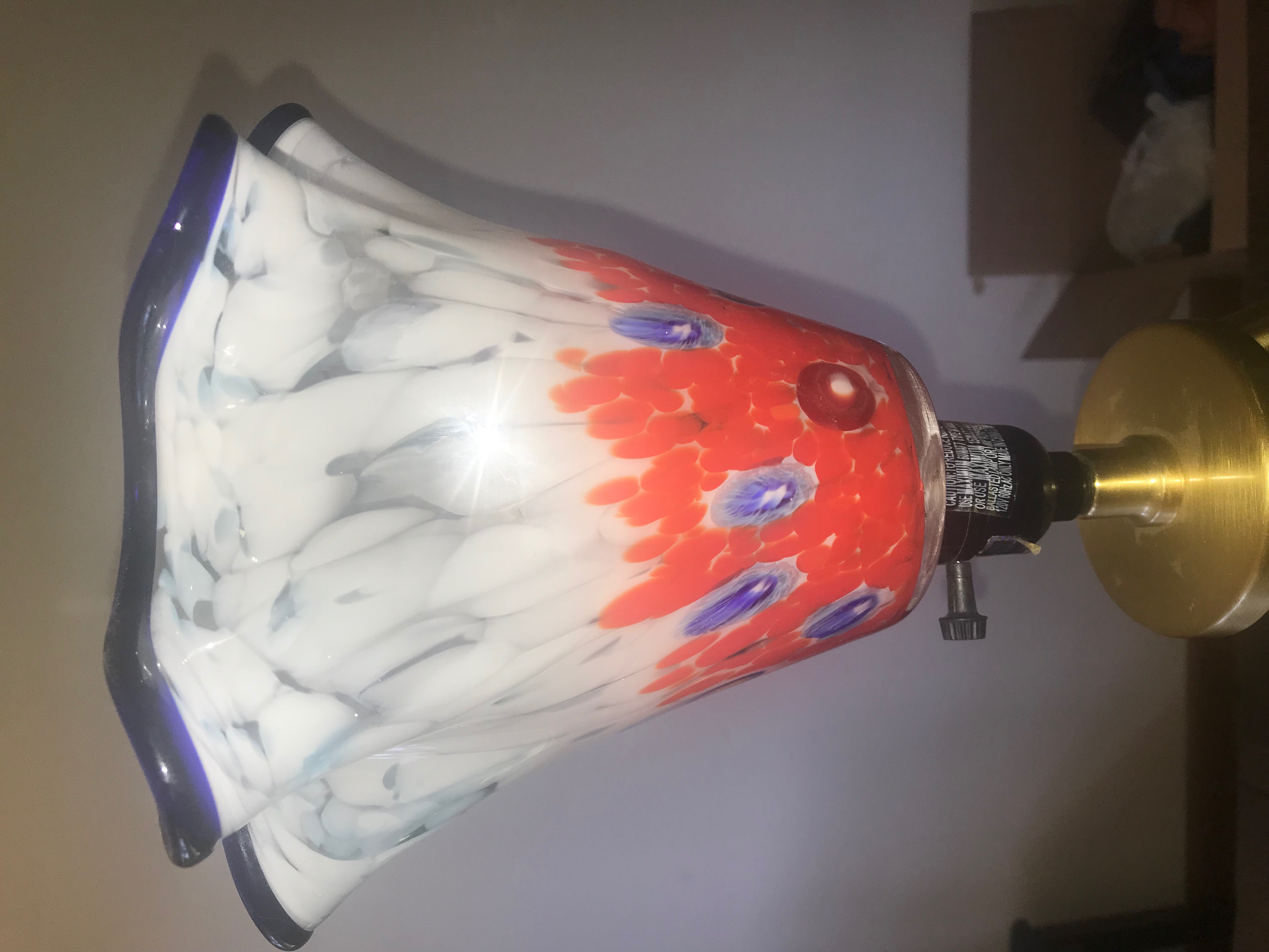 Height of glass shade is 7", overall lamp height including shade is 23", distance between feet is 10.5".