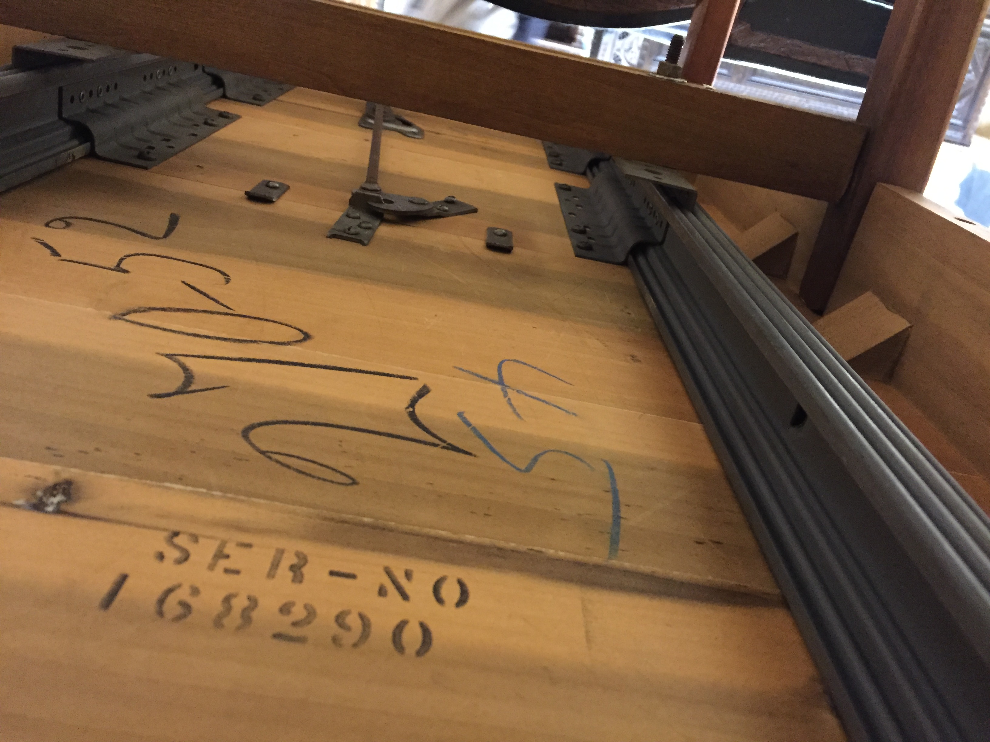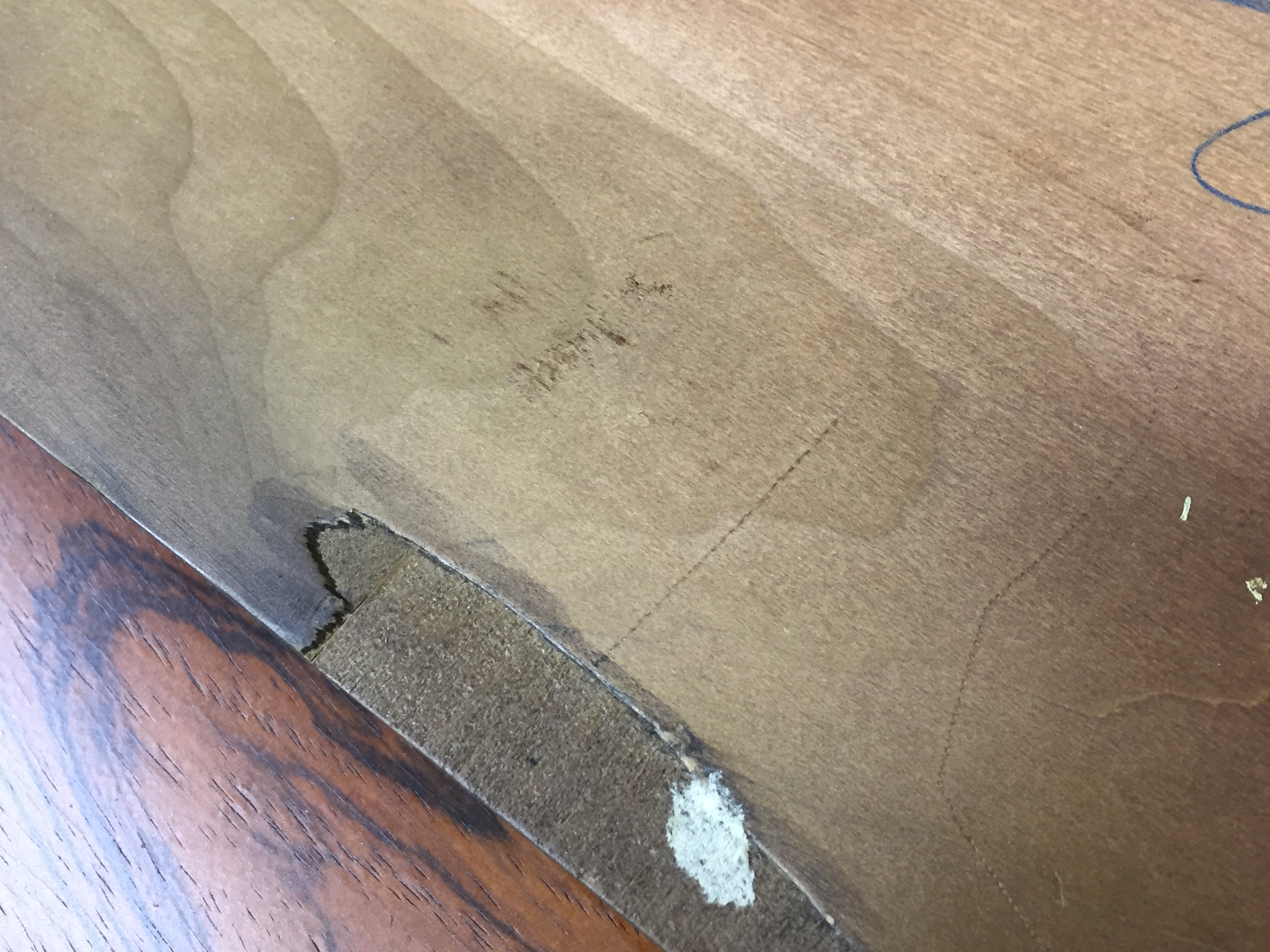 Small knick on one of th legs and some damage to the veneer on the underside of one of the sleeves, but otherwise no scratches or damage to the wood.
