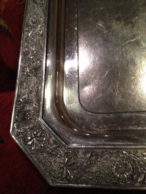 The tray is in good condition with slight tarnishing and very slight surface abrasions from use. There are no dents or major tarnishing.