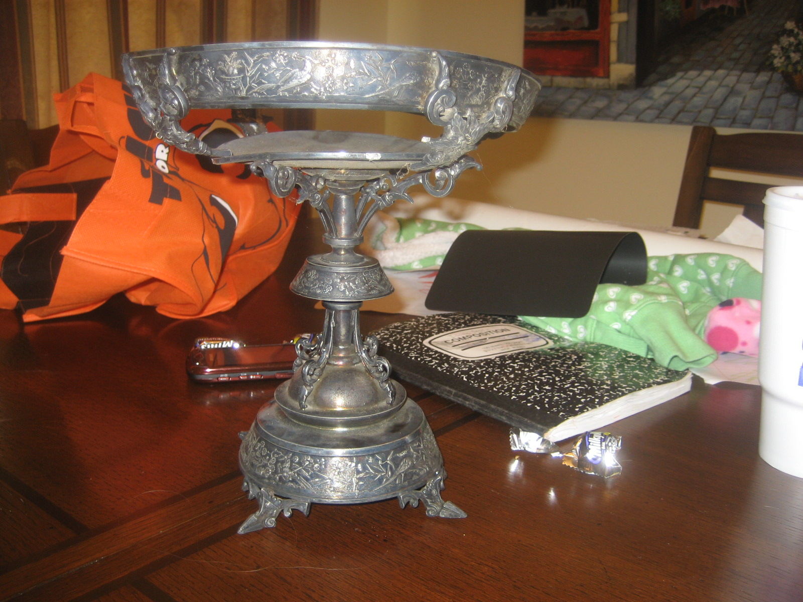 Found in my attic, not sure what it is. It is sliver with bird , branches and flower details on the entire piece. the top piece of this is broken.