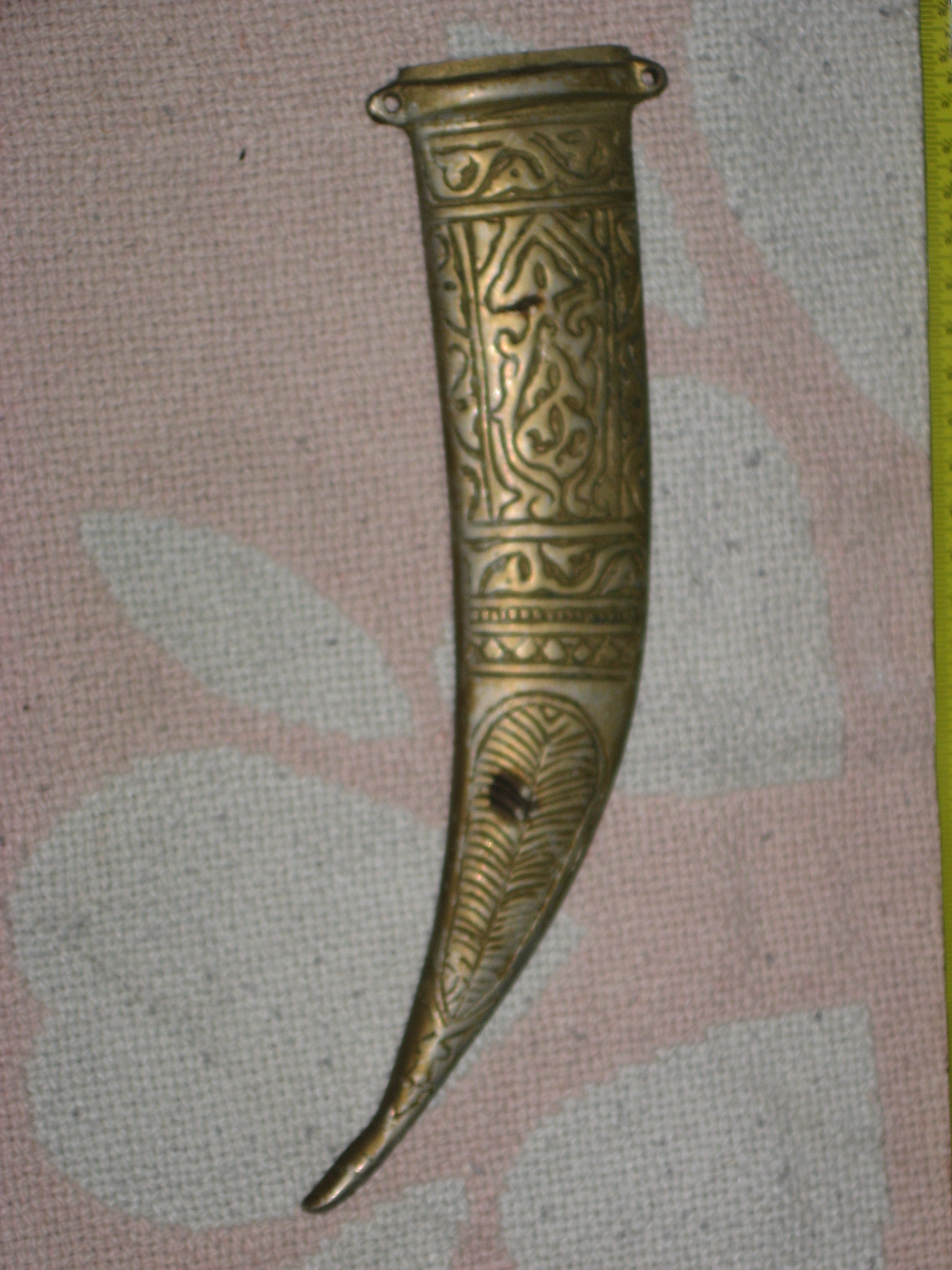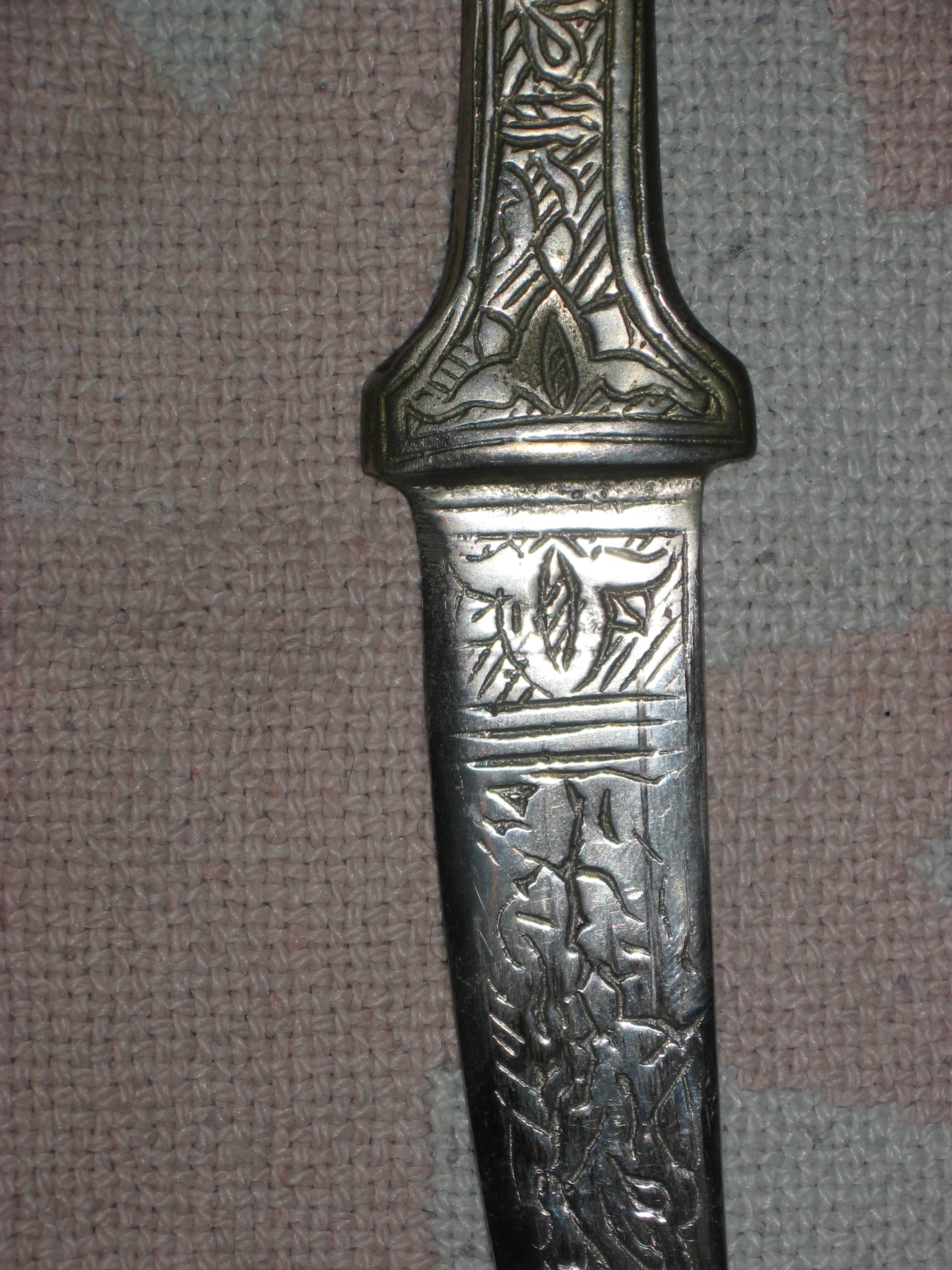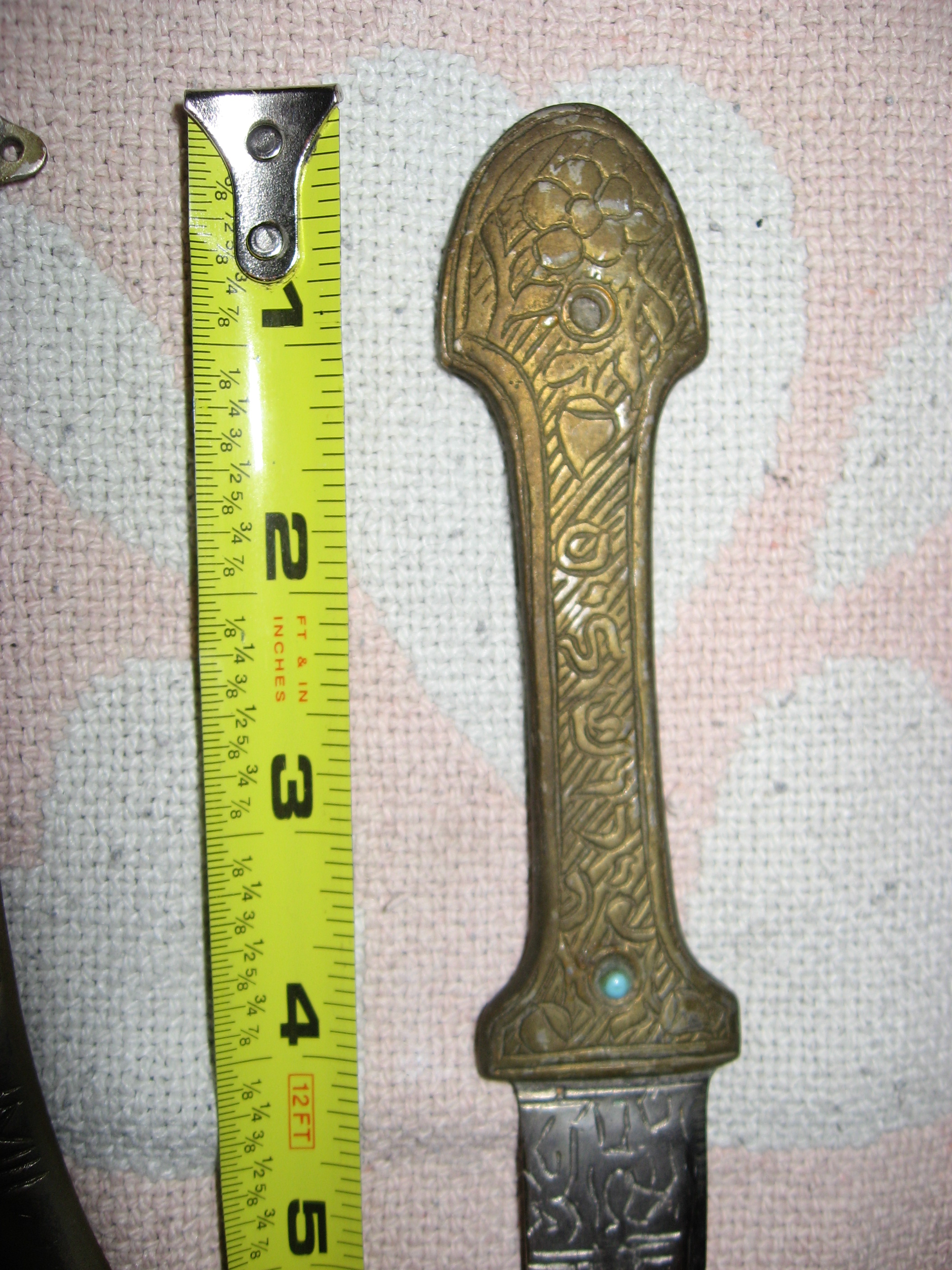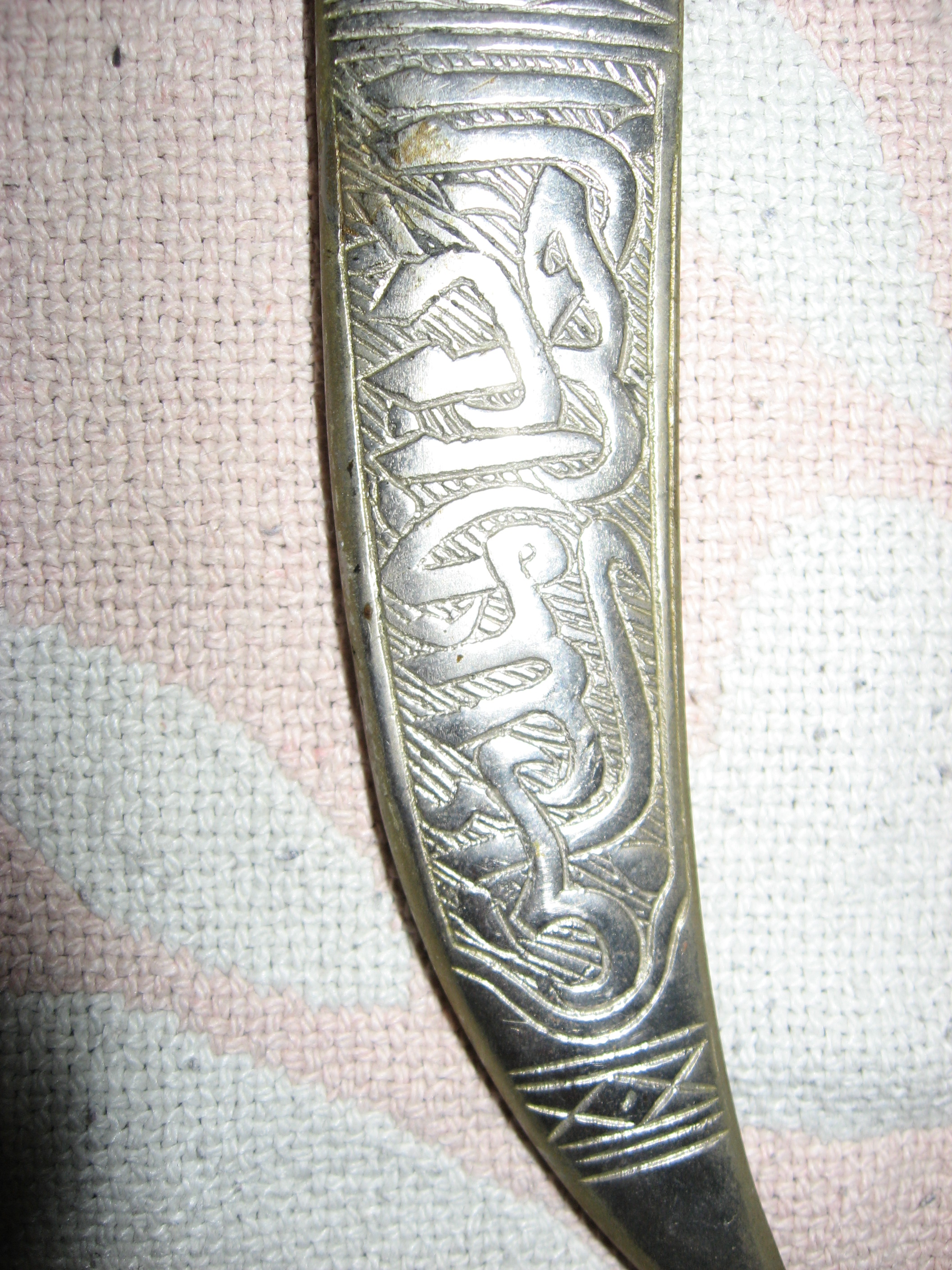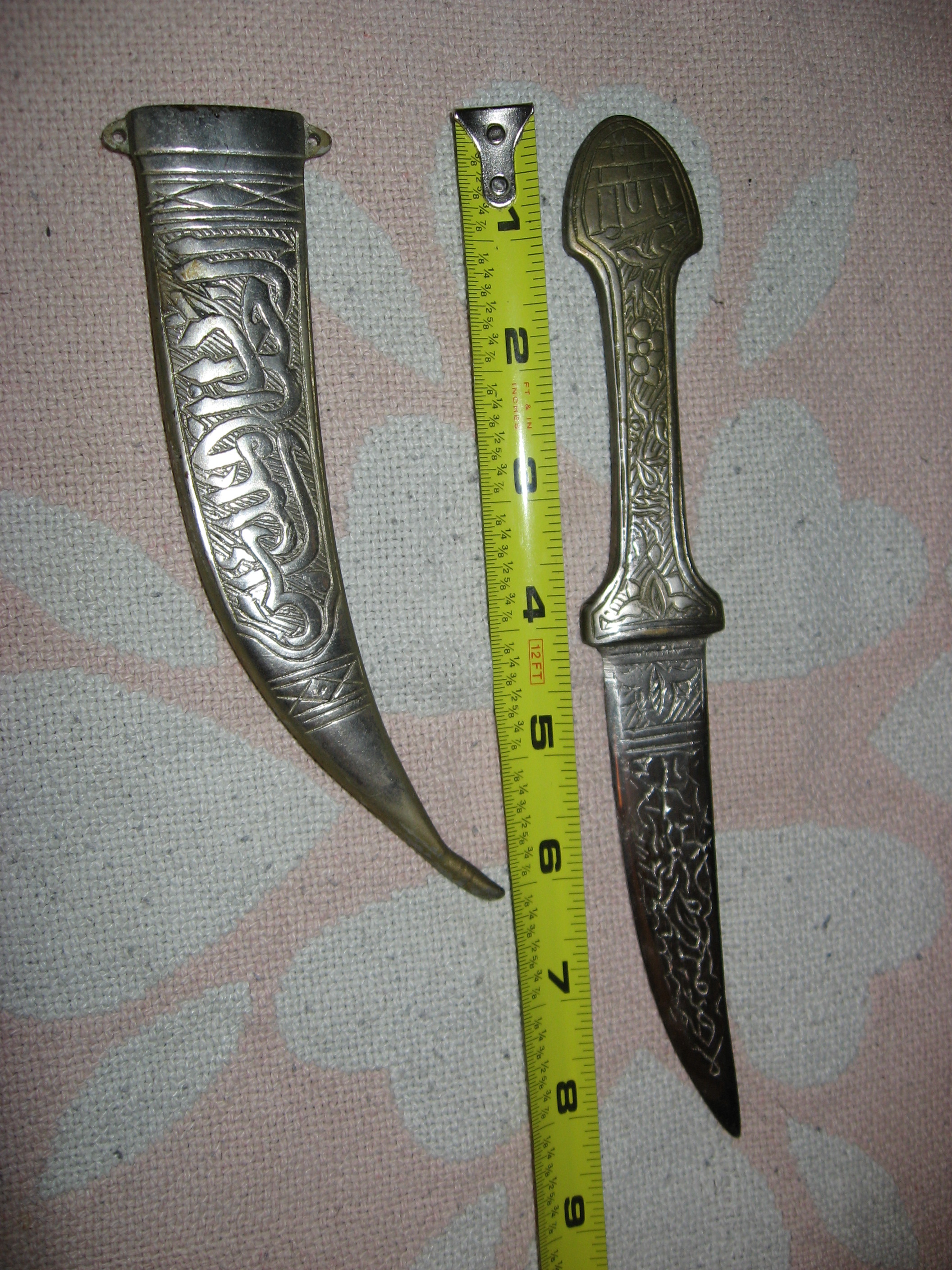 At least 47 years old (my age). Hanging on the wall all that time. May be silver, not sure. Arabic writing or design. Has one little pearl/stone on sheath with a spot where one is missing. Looks like it was made to hang on wall or sash having two mounting holes on top sides of sheath.