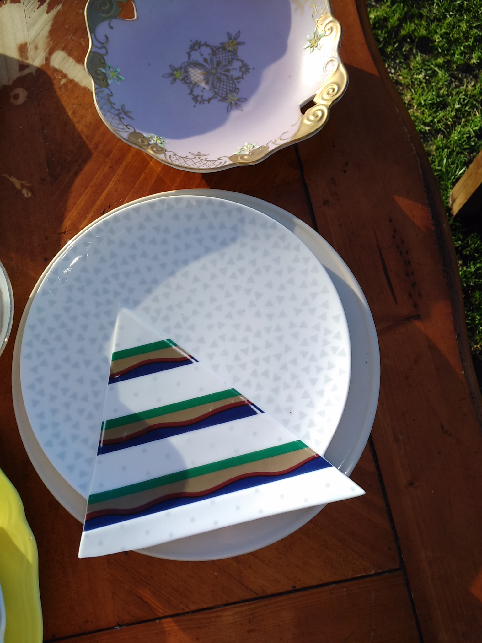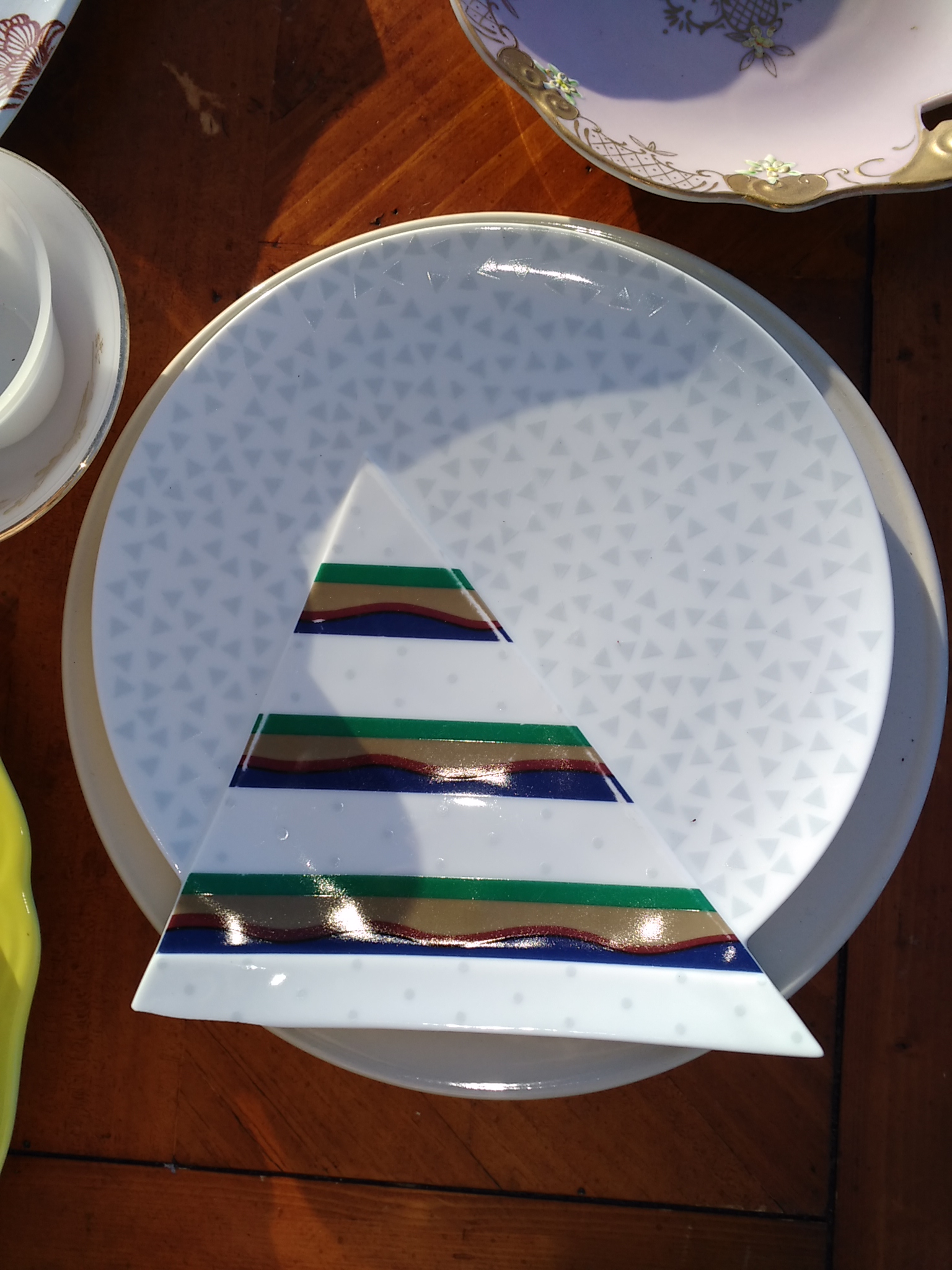 It has a very odd shape for a plate. Picture is best description. On the back it has va102 dark blue. Color vibration.