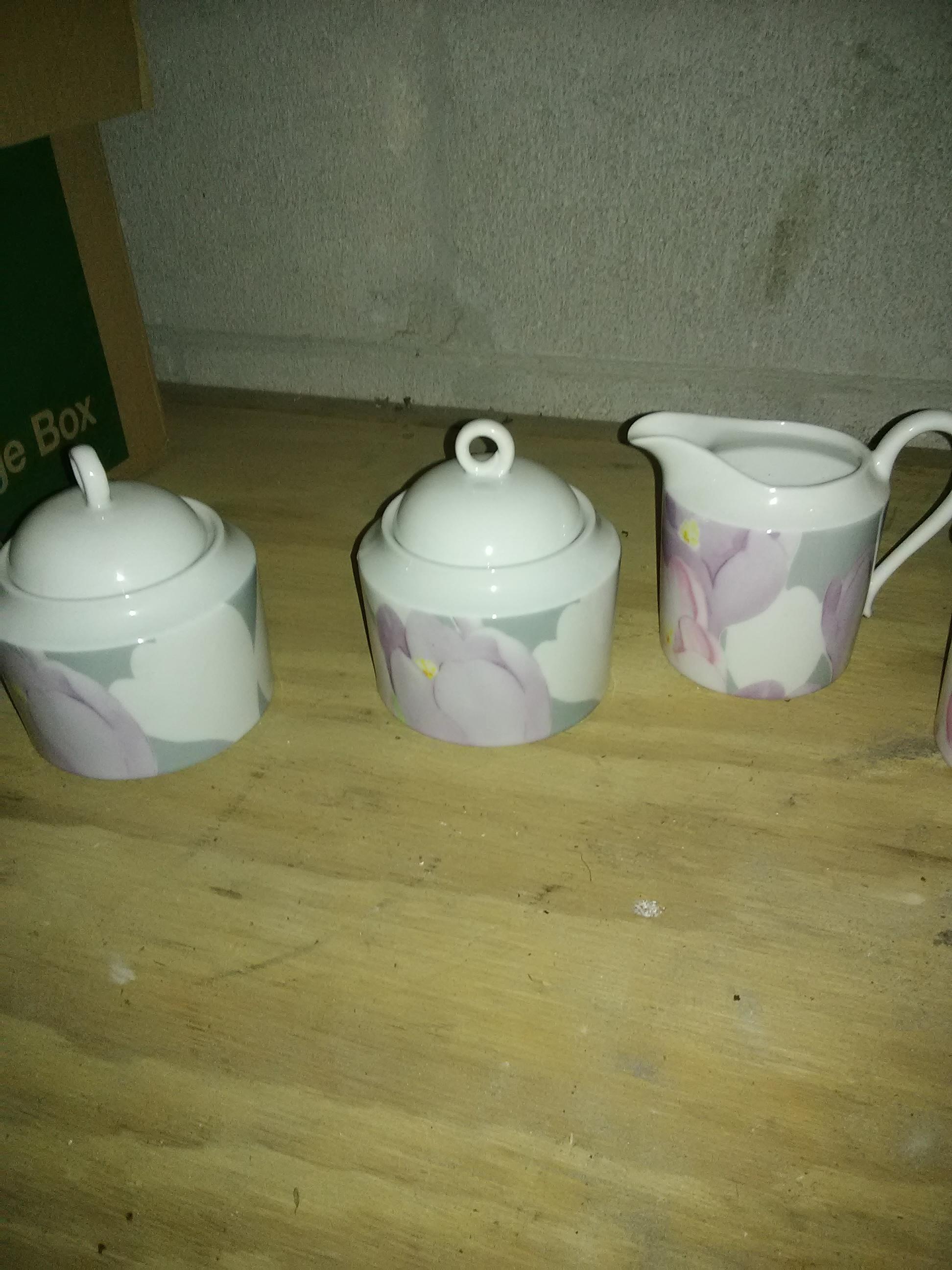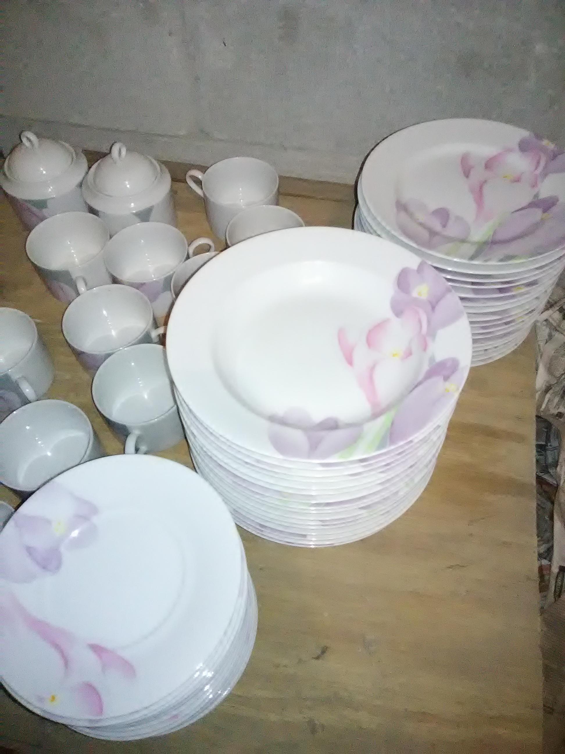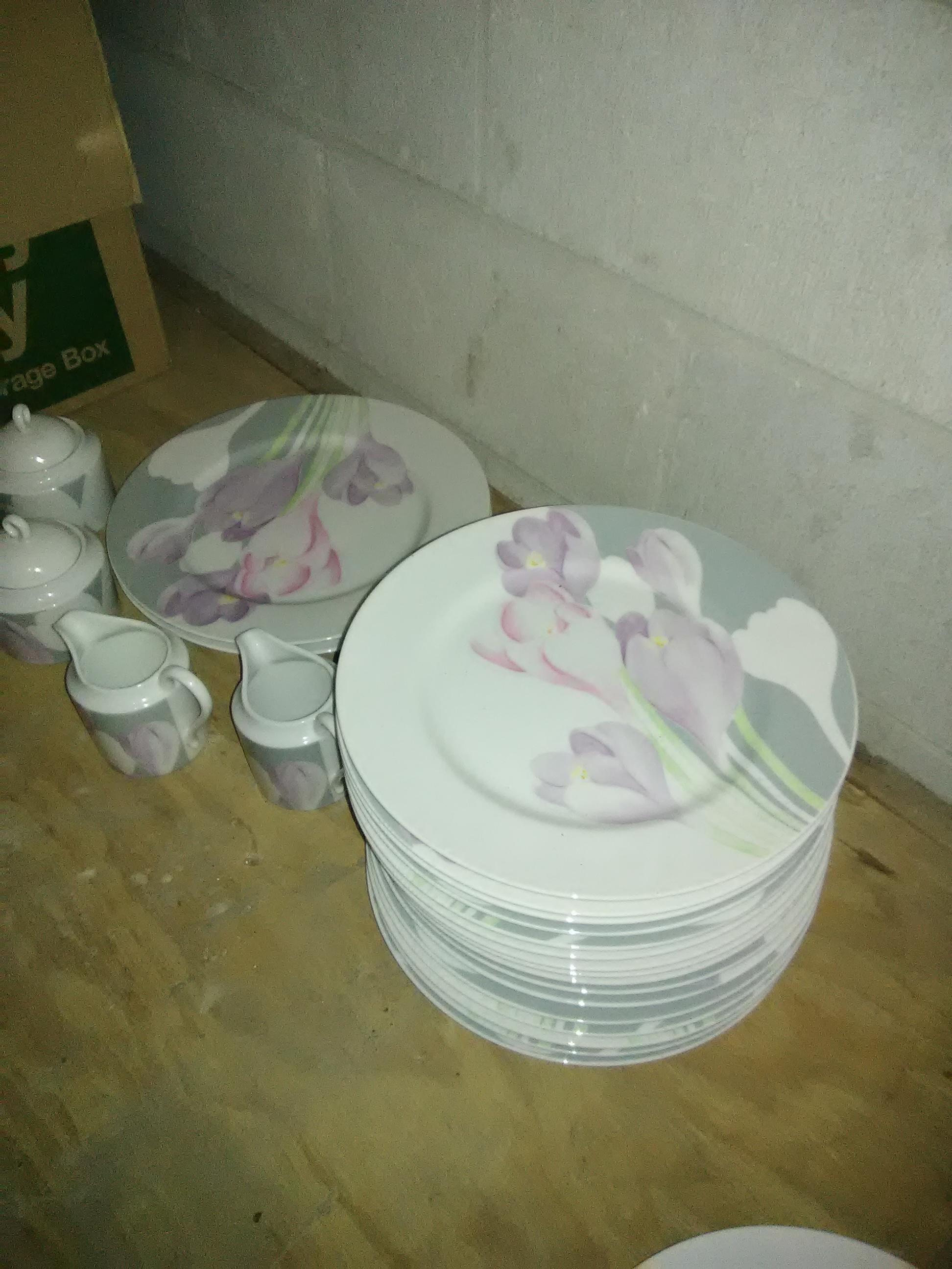 I have 16 plates 16 saucers 16 salad plates 16 bread and butter plates 14 cups 2 platters 2 fruit bowls 2 sugar bowls 2 creamers