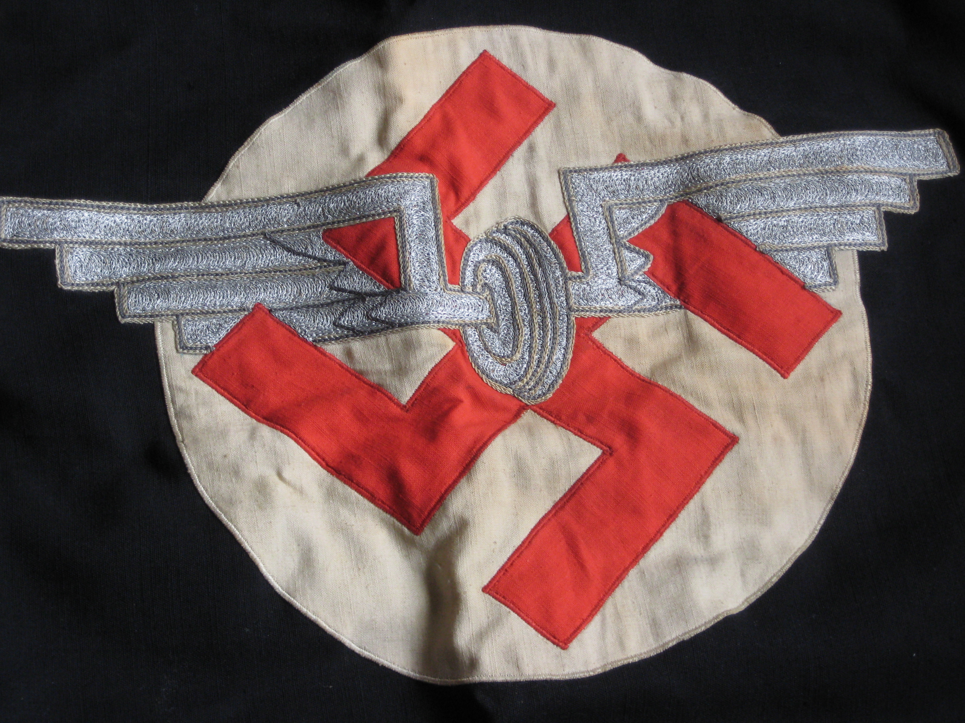 silver fringe around the edges.Black back round.Red insignia. One leather strap missing.About 17" x 17".