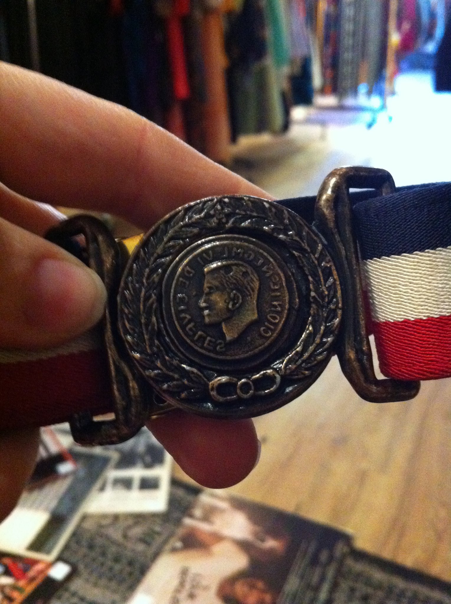 Very heavy quality canvas belt, buckle is spoon and plate. The writing is backwards if as on a stamp. cionic coml vi de eivfles?