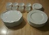 A 32 piece dinnerware set made of milk glass. There are no markings on the bottom