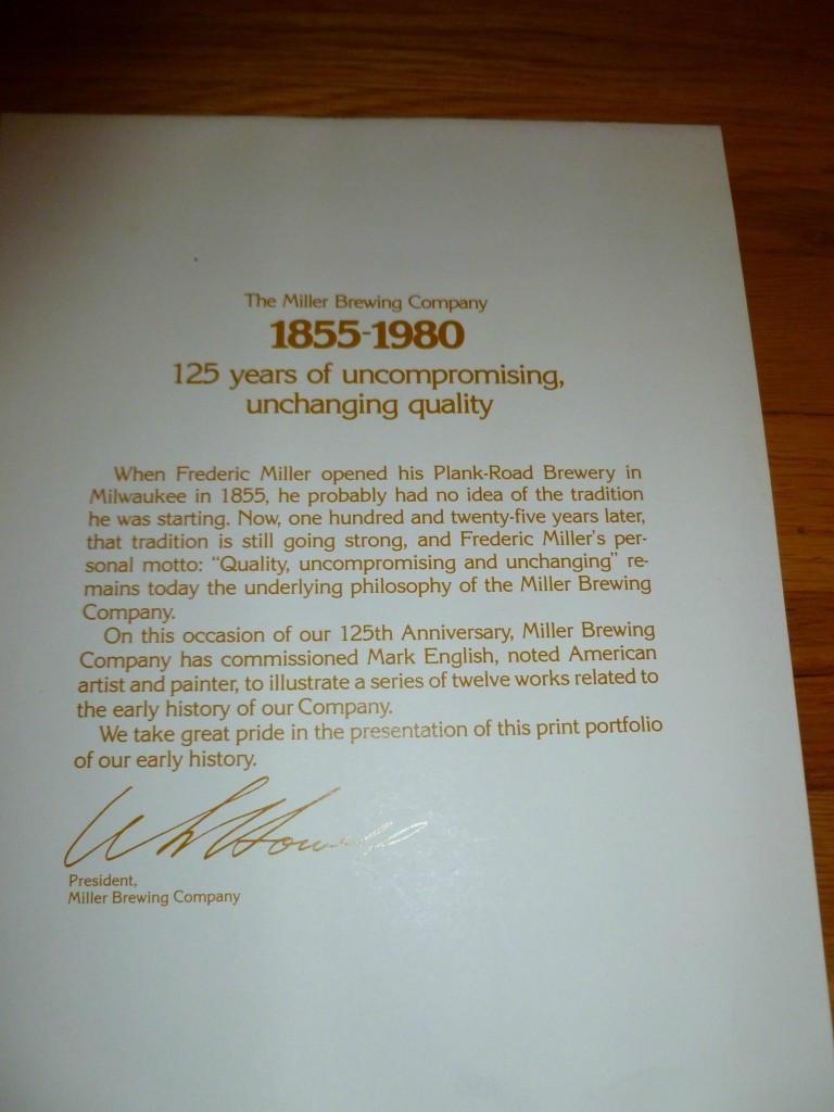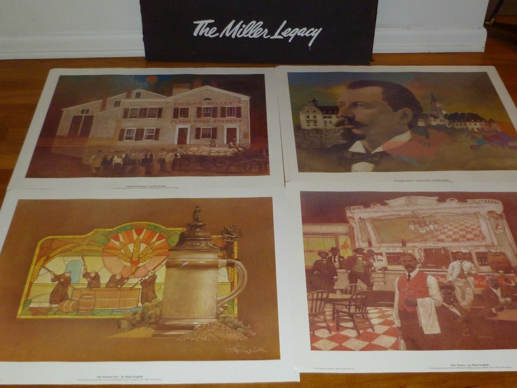 This is the complete set of 12 prints by noted American Artist Mark English commissioned by the Miller Brewing Co. commemorating the 125th anniversary of Miller Brewing in 1985. The prints come in the original large embossed card stock portfolio along with an official letter from the President of Miller Brewing Co. declaring the nature of these prints. The prints have never been framed nor exposed to sunlight to fade, discolor, yellow or age. The prints are all in excellent original condition. The prints measure 24 1/2 inches by 18 1/2 inches and were very hard to photograph for this auction. The prints are not yellowed however using the flash to show the true colors washed out all detail so incadescent lighting was used giving the prints an aged look which they are not. The auction only allowed these 12 pictures, I have the cover letter picture and portfolio detail pictures available upon request as well. These prints are very much in the style of other famous Mark English prints. The prints are named as follows. #1 The Master Brewer Frederic Miller#2 Plank Road Brewery #3 The Bottling Line #4 Delivery #5 The Picnic #6 The Tavern #7 The Coopers #8 After The Game #9 Brew Kettle No. 2 #10 Hops Harvest #11 The Ancient Art #12 The Beer Garden |